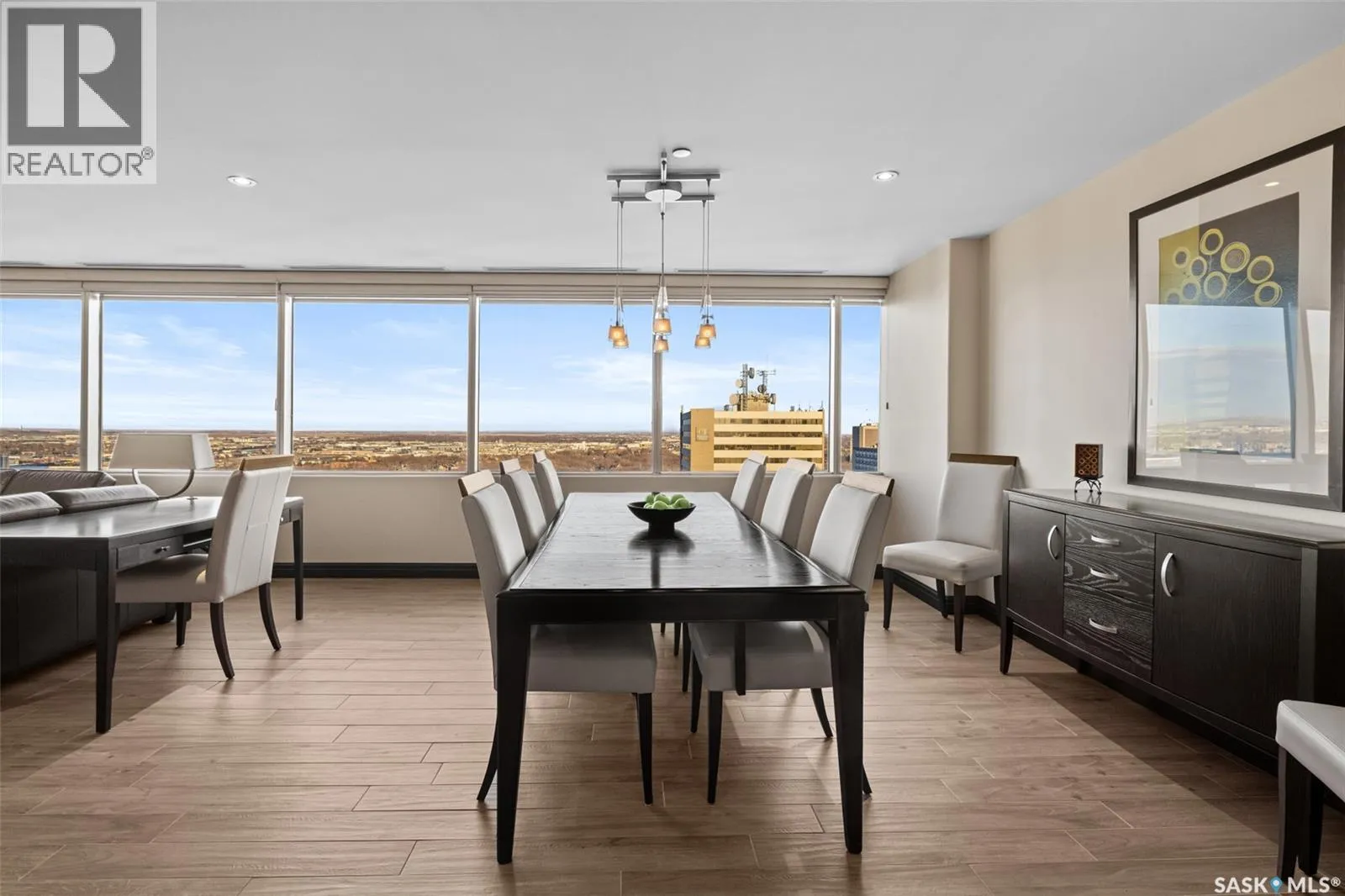 An exceptional penthouse residence crowning the iconic TD Tower, this is a rare offering defined by light, scale, and uninterrupted perspective. Positioned at the very top, this home showcases over 40 feet of sweeping east-facing exposure—delivering a panoramic, unobstructed city skyline. Inside, a generous open-concept layout anchors the home, where kitchen, dining, and living spaces flow seamlessly together—designed for both