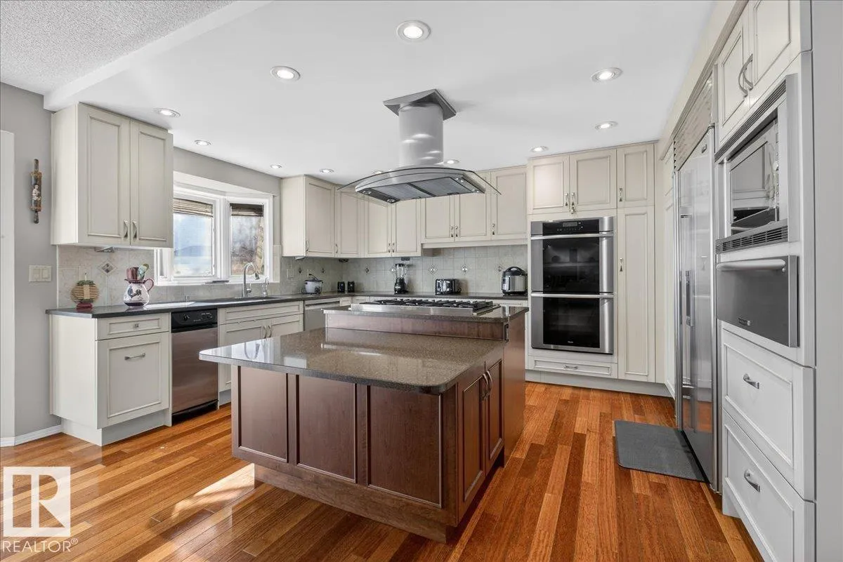 Experience luxury in Gariepy, just a block from the River Valley. This executive 7-bed, 4-bath home sits on a massive, private pie-shaped lot in a quiet cul-de-sac. You cannot beat this unique location—walking distance to top restaurants, bars, cafes, and amenities, plus minutes to West Edmonton Mall, the Anthony Henday, and St. Albert. Main floor bedroom / office. The heart