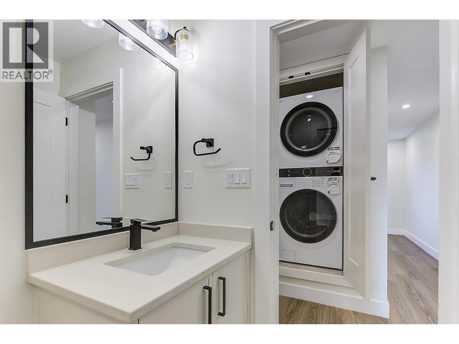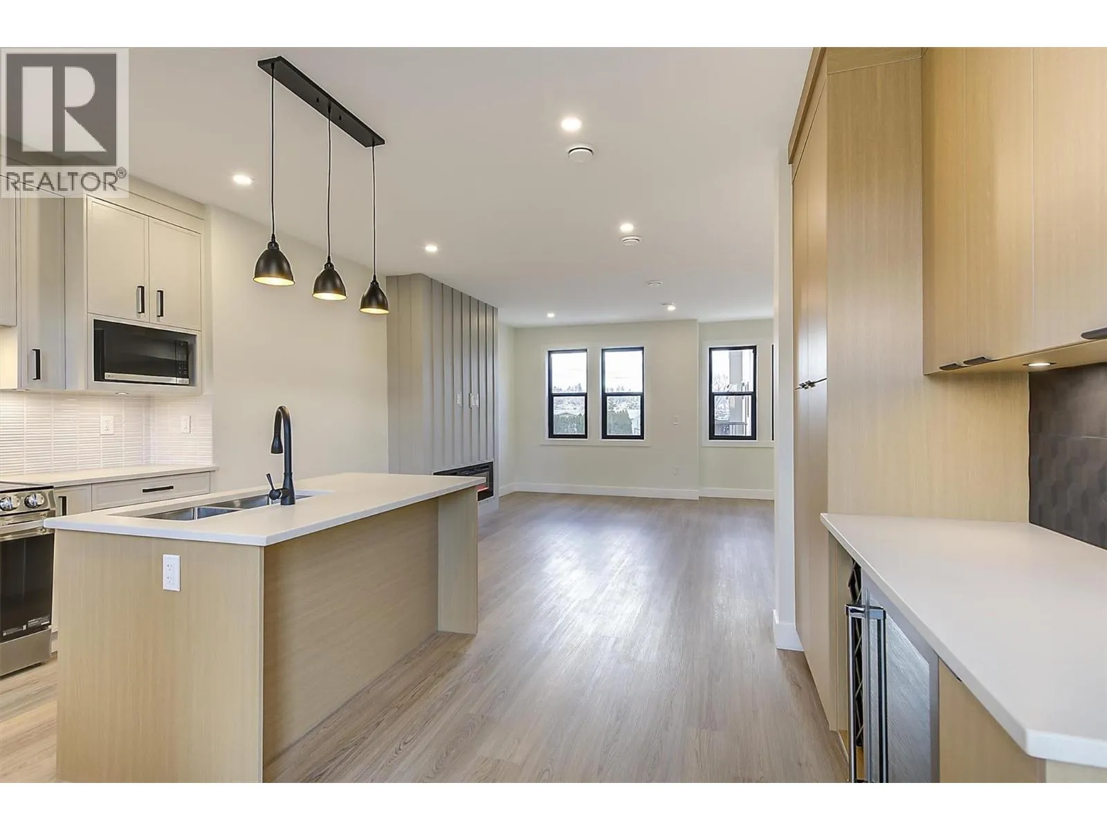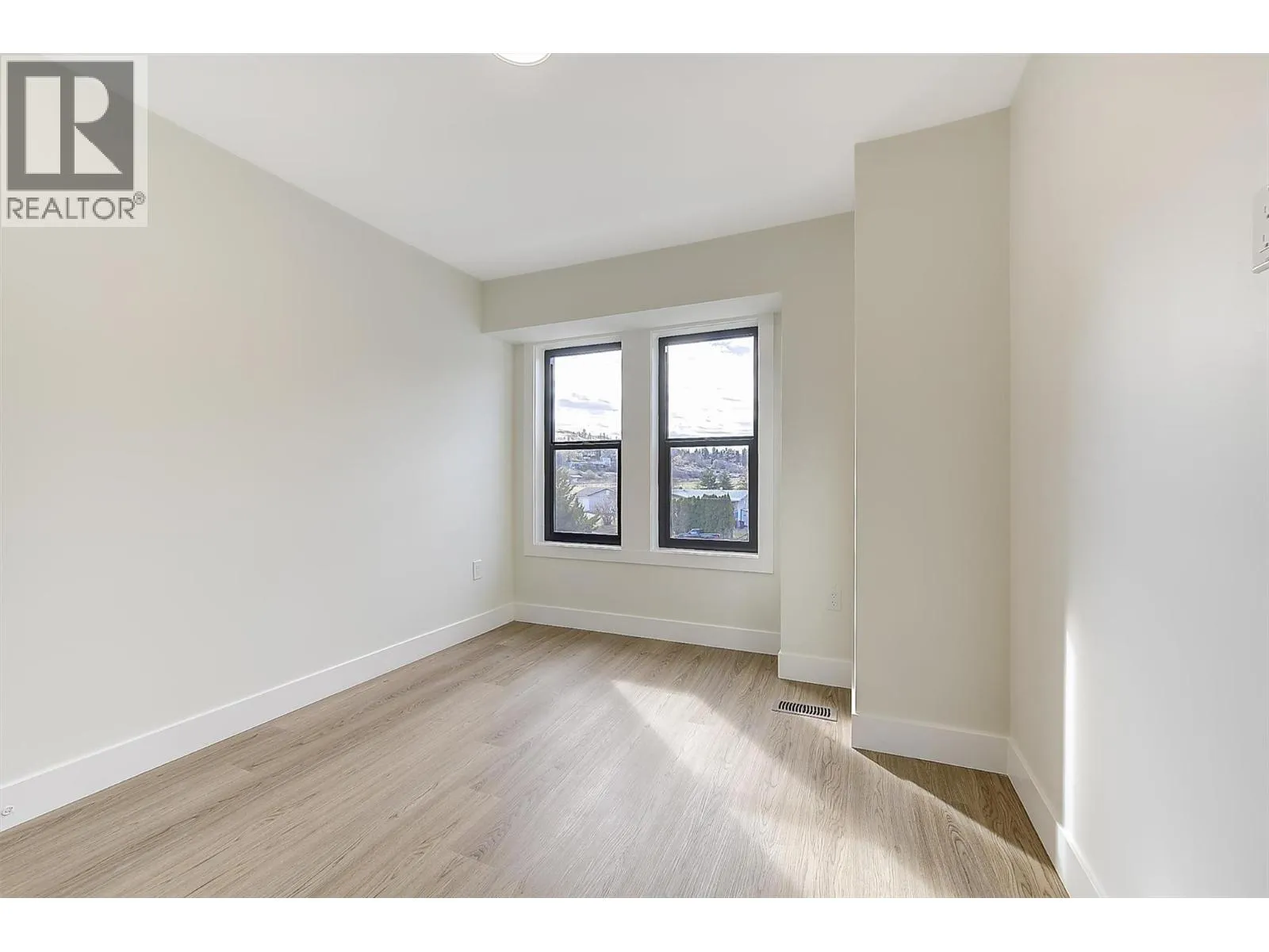Discover these boutique townhomes tucked away in a quiet, private setting in the flats of Lake Country. End Unit. Located on a no-through road surrounded by farms and acreages, rural charm and an Okanagan lifestyle await. Just down the street, access the famous Okanagan Rail Trail and Wood Lake. Inside, the sun-filled open-concept living space is framed by oversized black-trim