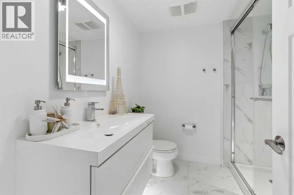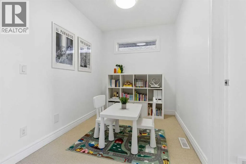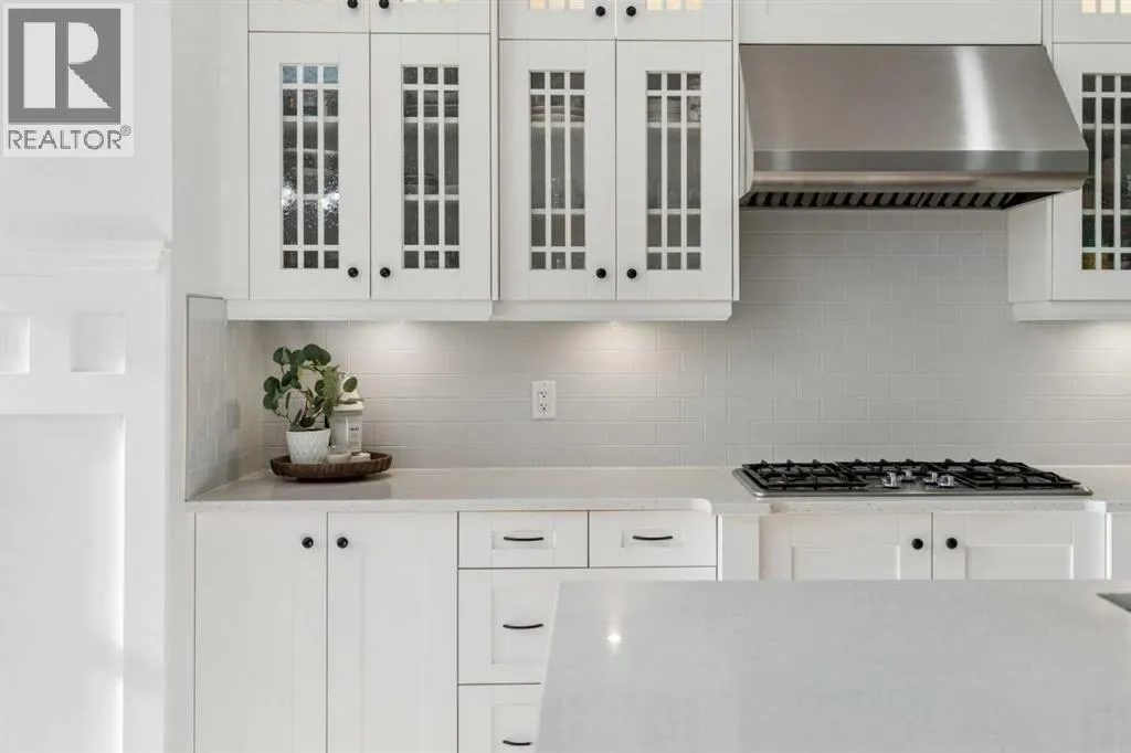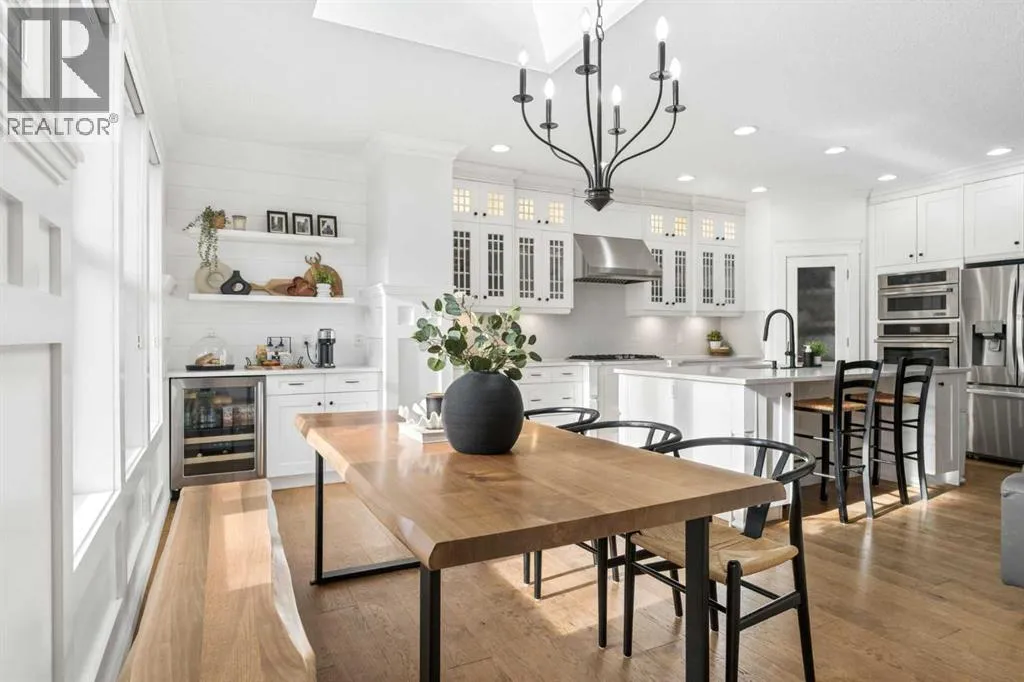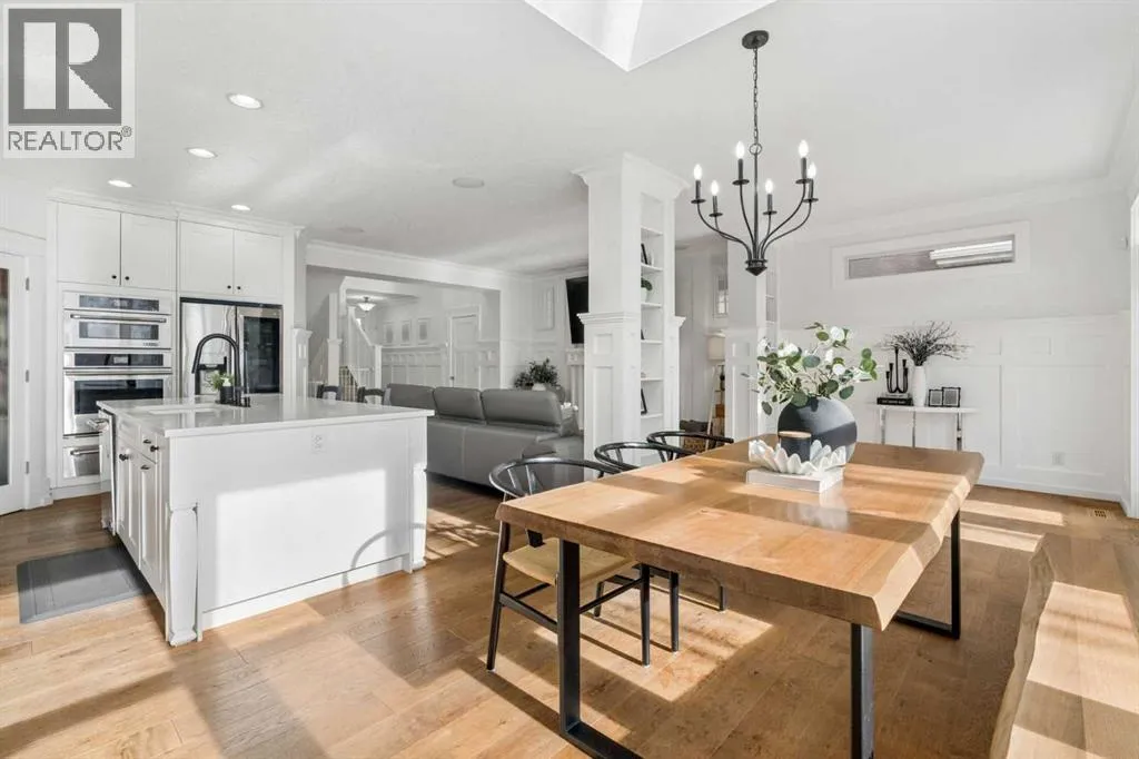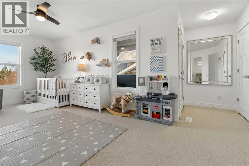 easy access in and out of the community. Step inside and you’ll quickly see this is far from a typical home. Built with numerous custom features, the main floor showcases beautiful wainscotting, crown moulding, built-in shelving, and wide plank engineered flooring. The inviting living room with a gas fireplace flows into a spacious dining area perfect for entertaining. The dining space is highlighted by a skylight overhead that fills the room with an abundance of natural sunlight, creating a bright and welcoming atmosphere throughout the day. French doors off the dining room lead to the low-maintenance backyard, creating a seamless indoor-outdoor living space. The kitchen is designed to impress with a massive island offering additional seating, quartz countertops, stainless steel appliances, a smart fridge, corner pantry, and abundant cabinet and counter space. A charming beverage station complete with a wine fridge adds the perfect touch for morning coffee or evening drinks. Upstairs, the bright and open layout features a large primary retreat with a walk-in closet and a luxurious 5-piece ensuite with double vanities, glass shower, and relaxing soaker tub. Two additional spacious bedrooms—one with its own private balcony—plus a full bathroom and versatile flex space provide ideal room for a home office, kids’ play area, or additional lounge space. The fully finished basement continues to impress with 9-foot ceilings, a generous fourth bedroom with built-in wardrobes, and a beautifully finished 3-piece bathroom featuring heated floors, under-cabinet lighting, and a large glass shower. The cozy TV area with a second fireplace creates the perfect space for movie nights. The oversized heated garage with epoxy flooring is fully finished—perfect for storage, hobbies, or the ultimate man cave. Outside, the private backyard features mature trees along with upper and lower decks offering multiple seating areas to relax and entertain. With the lake, parks, and walking paths just steps away, this exceptional home offers the very best of lake community living in Mahogany. Your dream home awaits—schedule your private showing now! (id:64429)