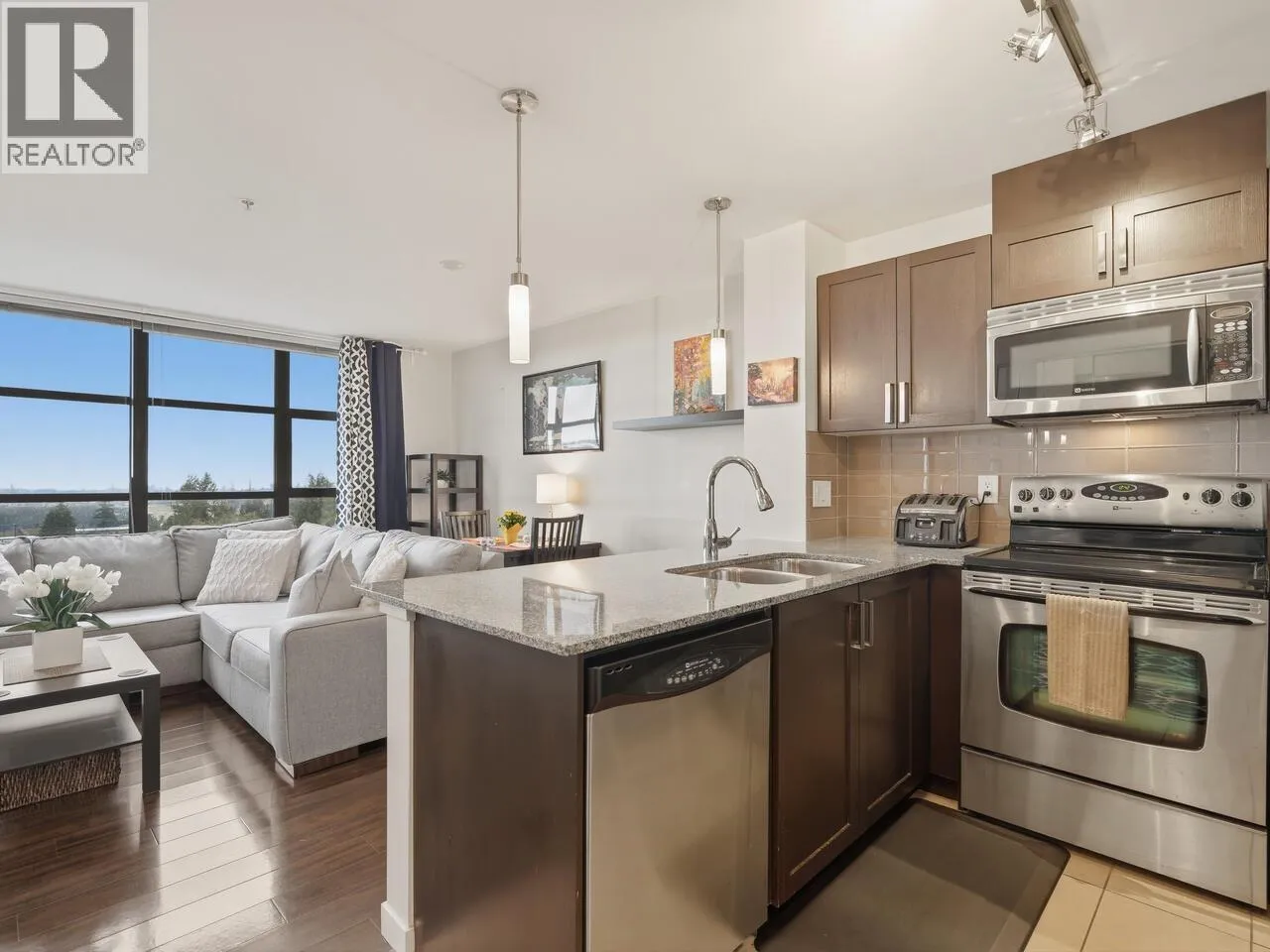 Fully furnished 1 bed, 1 bath suite in the concrete Amadeo building with stunning river, city and mountain views from every room. This bright, well-designed home features an open-concept layout with no wasted space, large windows, laminate flooring and an electric fireplace. The kitchen offers stainless steel appliances, granite countertops and a breakfast bar. The bathroom includes a granite counter,