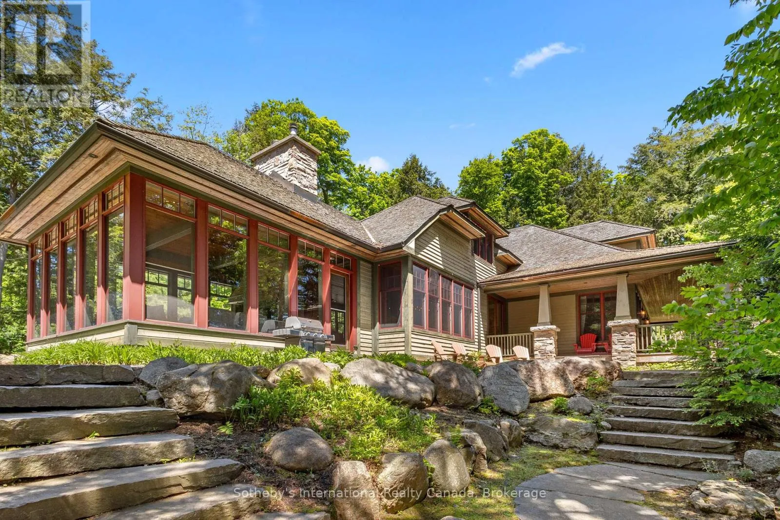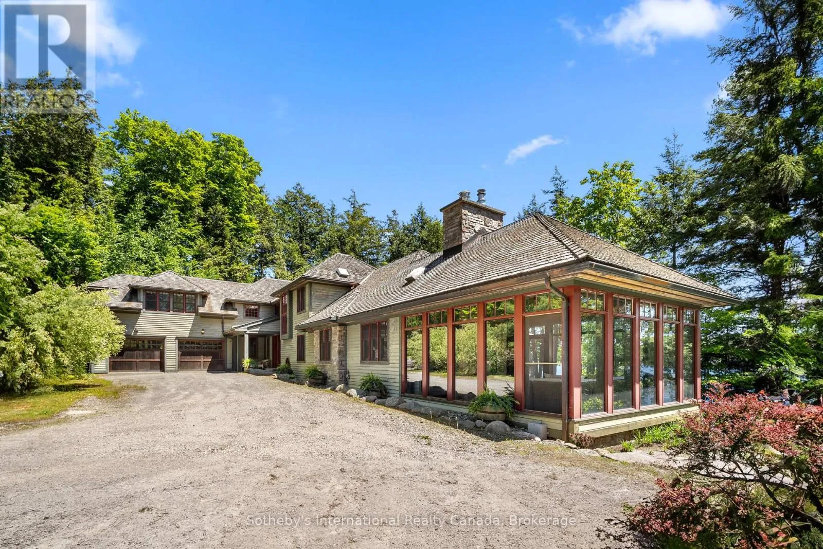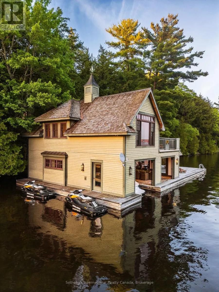 On the coveted shores of Lake Rosseau in Stormy Point, this exceptional waterfront property presents a rare opportunity within one of Muskoka’s most exclusive enclaves. Spanning over 2 acres with 433 ft of southwest-facing shoreline, the setting is defined by granite, mature pines, and sweeping sunset views. A sense of arrival is immediate. Upon entry, a dramatic great room unfolds,
