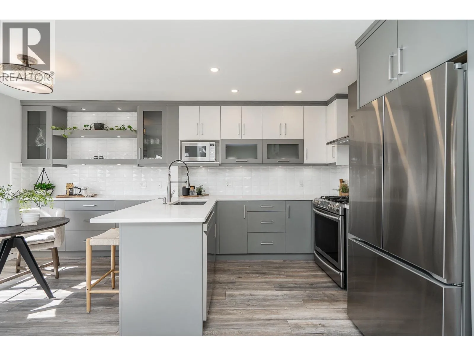 Duplex home with a single family home feel! This bright and airy 3 bed, 3 bath home offers gorgeous, updated living space with an impressive, private, sun-filled backyard! On the main is a generous living room with a cozy gas fireplace. Dining seamlessly connects to an updated kitchen w/quartz countertops, white cabinetry, gas cooktop, custom cabinetry, shelving and a breakfast