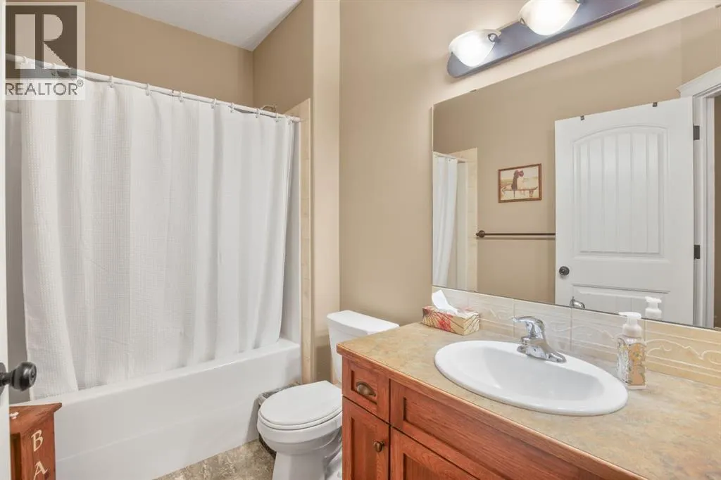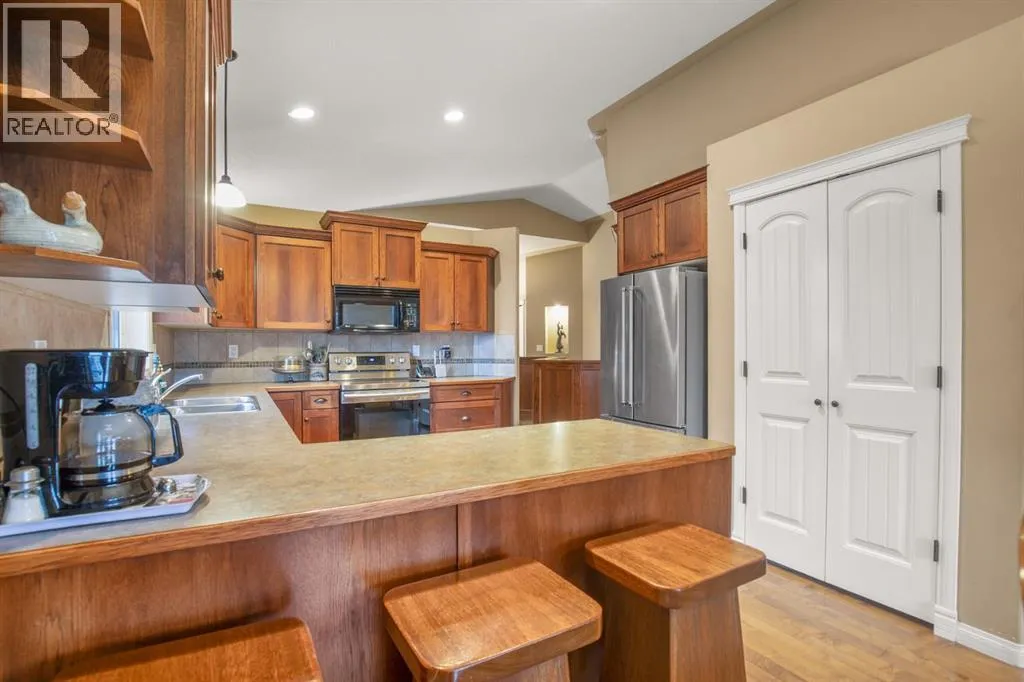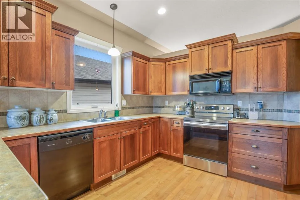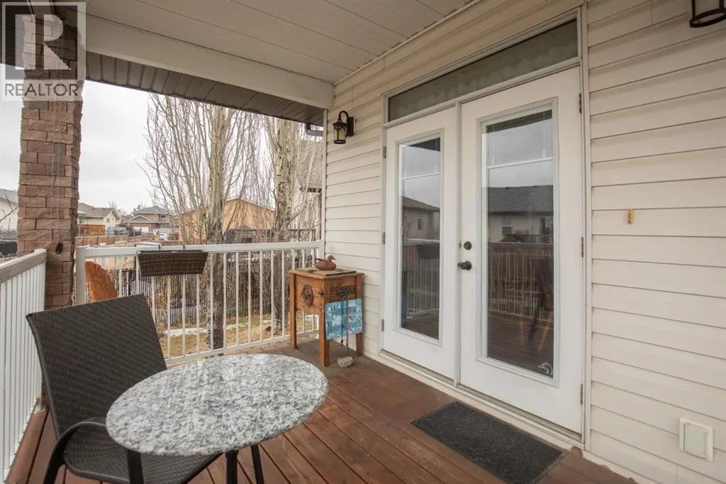 plenty of natural light, creating a welcoming space to relax or entertain. Nearby, you’ll also find access to the basement.Moving into the main living space, you’ll appreciate the open layout highlighted by vaulted ceilings and large windows that continue to bring in natural light. The living room flows comfortably into the kitchen and dining area, creating a functional space for both everyday living and entertaining.The kitchen offers ample cabinetry and workspace, along with a dining area that leads directly out to the backyard. At the patio doors, there is a tiled landing that helps protect the hardwood flooring, adding a practical touch for everyday use. From here, step out to the covered deck with stone columns and sun shades, along with a gas line for a BBQ or fire table, creating a great outdoor space to relax or host guests.The backyard enjoys southwest exposure, making it ideal for afternoon and evening sun, and also includes a 10×10 gazebo. There is also a fish pond that has been covered over, which can easily be reopened for those who appreciate water features and landscaping. In addition, the yard features paved RV parking, offering excellent flexibility for extra vehicles, trailers, or recreational use.Back inside, the main floor features three bedrooms, including a spacious primary suite with a recently renovated ensuite complete with a tiled shower and glass enclosure. A full 4-piece bathroom completes the main level.Downstairs, the fully developed basement offers excellent additional living space, including a large family room centred around a gas fireplace, creat ing a comfortable place to unwind. There is also a media area, wet bar, 2 additional bedrooms, and a full bathroom, making it ideal for families or entertaining. In-floor heating throughout the basement adds an extra level of comfort year-round.Additional features include a heated attached garage, air conditioning and a new roof (approximately 3 years ago) with matching shingles also installed on the shed. This is a well-cared-for home with thoughtful updates, offering a great combination of comfort, functionality, and outdoor living in a highly desirable neighbourhood. (id:62650)
