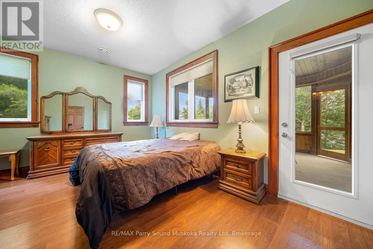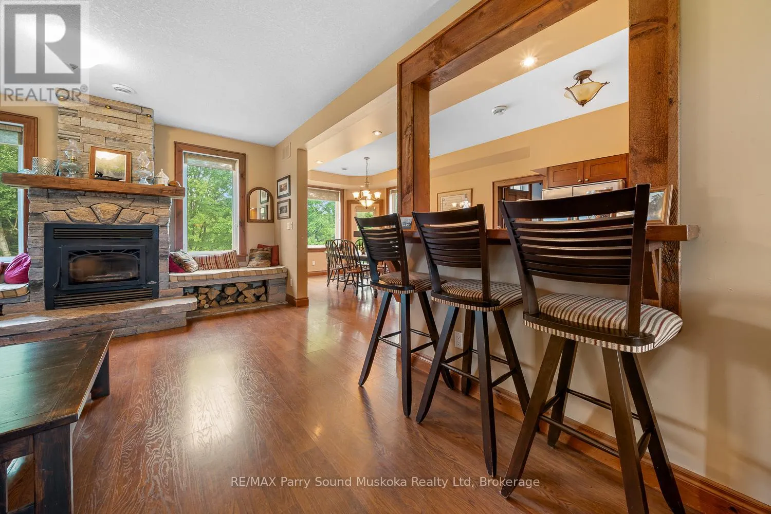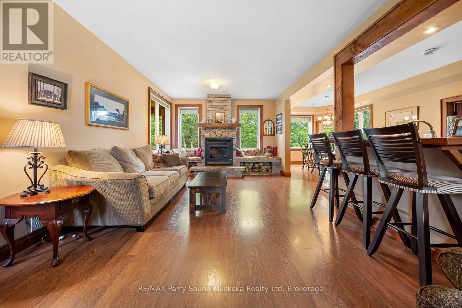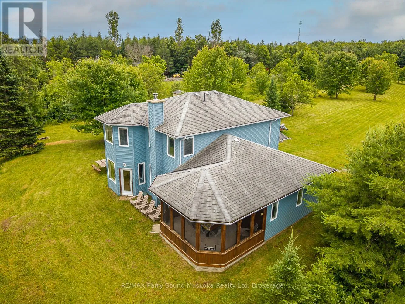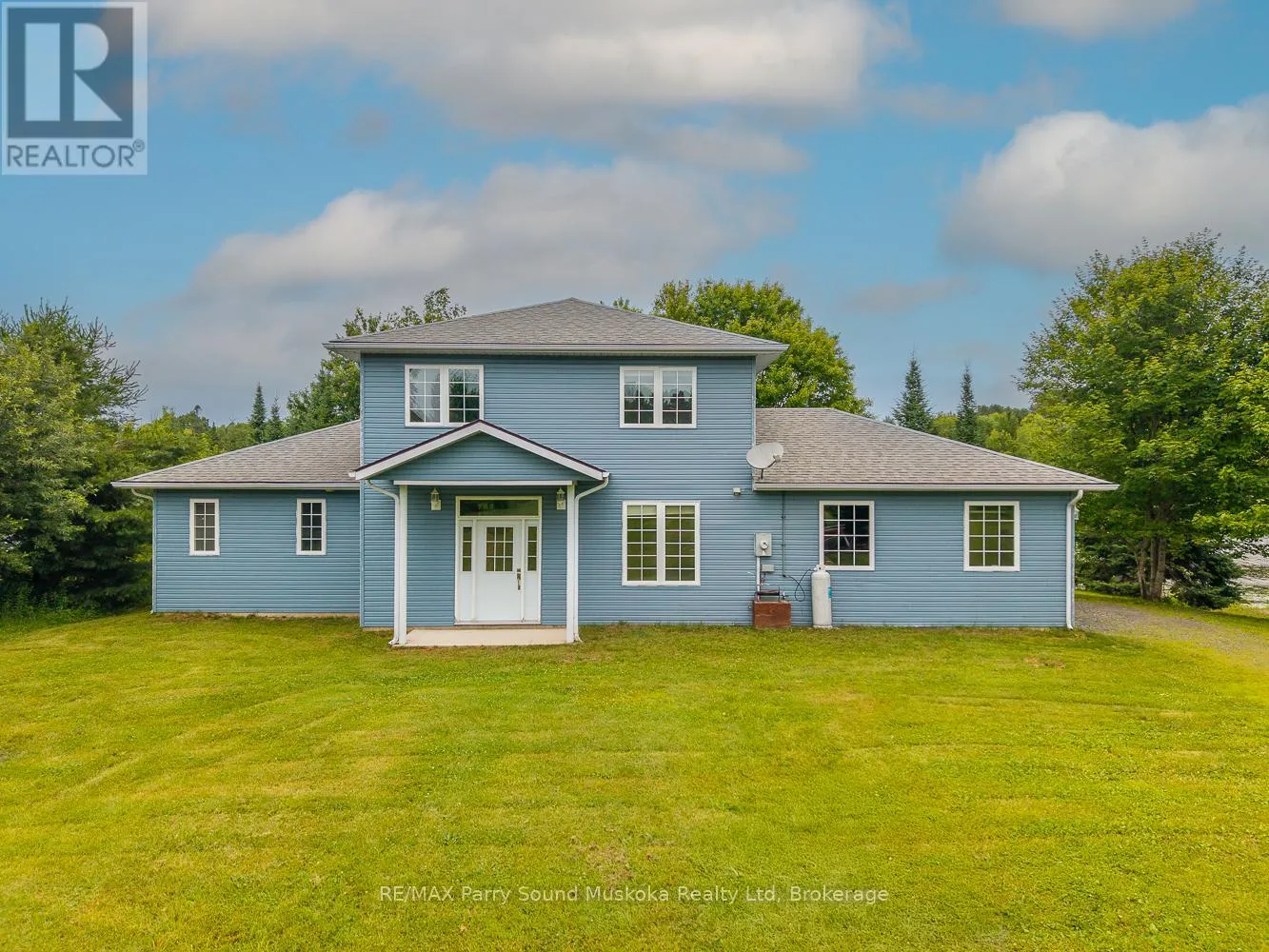 Year round open concept spacious lake house situated on 16.95 acres and 300 feet of Manitouwabing shoreline. Built in 2008, this 2 x 6 construction energy efficient home or cottage uses geothermal for heating and A/C, along with using $0 annually for propane but also has forced air propane if desired. Curl up by the stone fireplace in the family