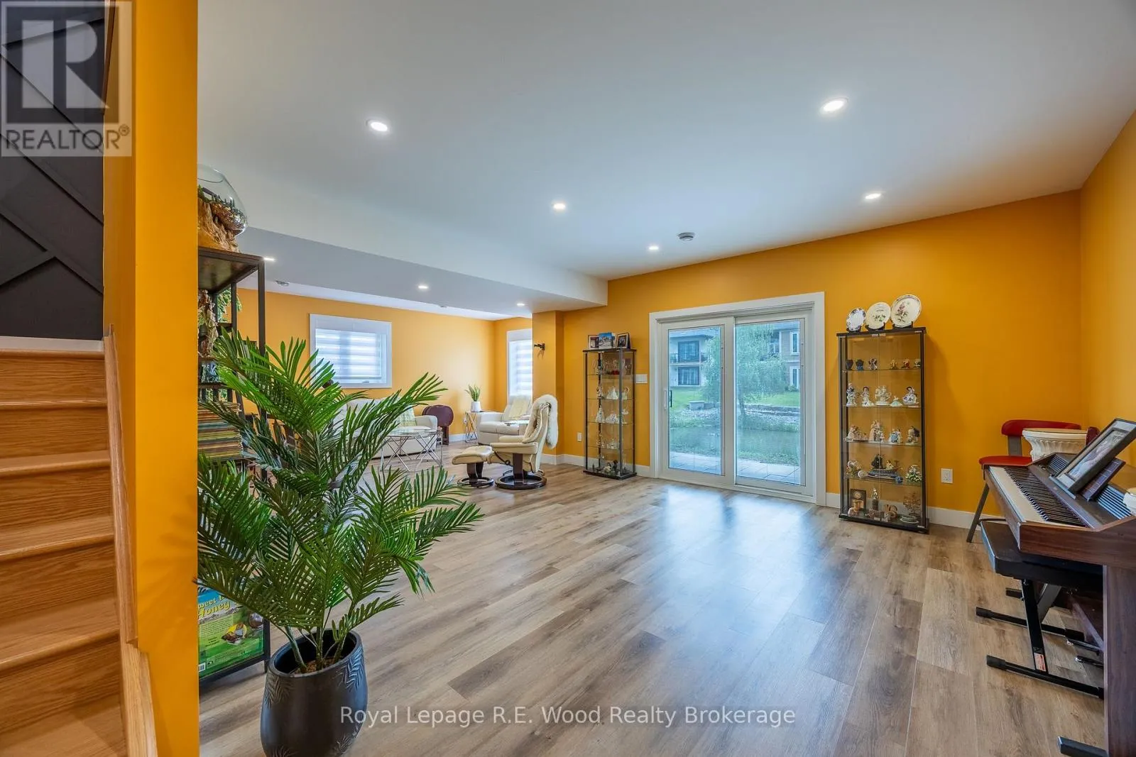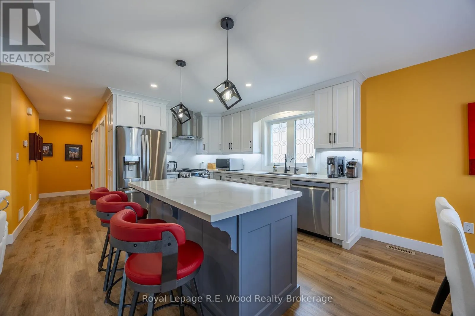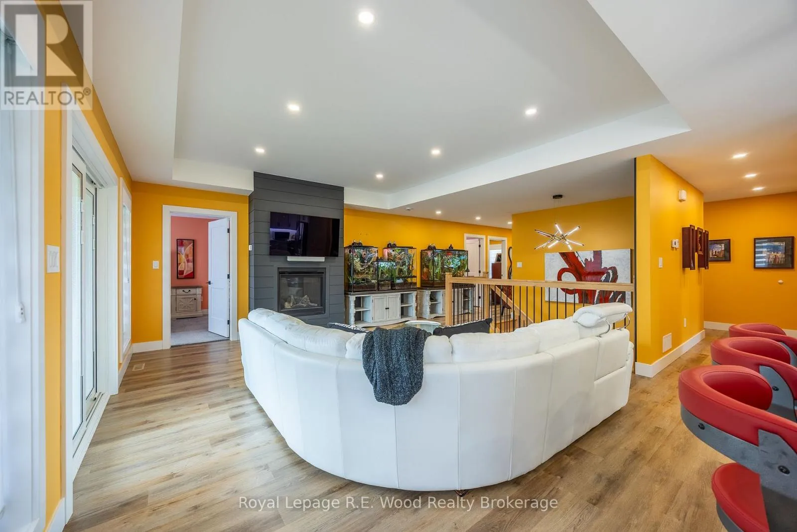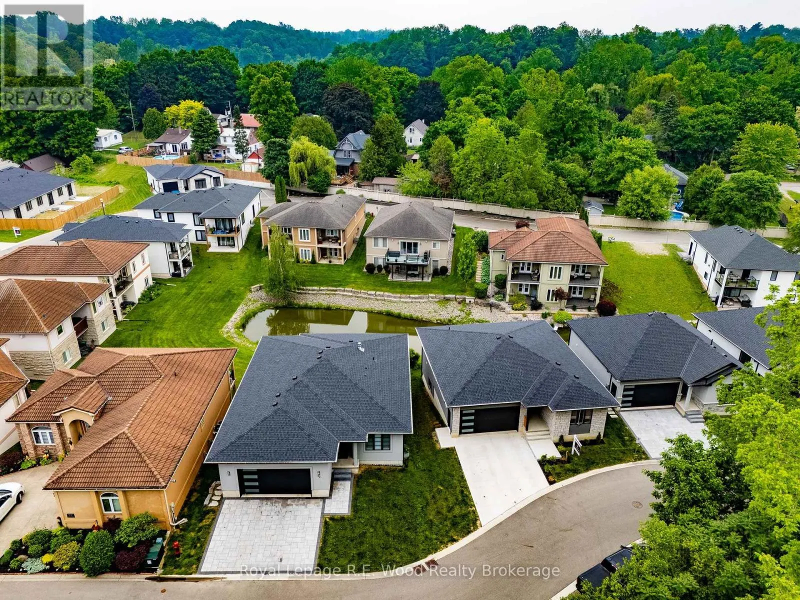 Experience stylish living in this beautifully designed bungalow in Mill Pond Estates with a walkout basement and stunning pond views. The sleek black and white stucco exterior sets the tone for the modern finishes throughout. Step into a spacious mudroom with main floor laundry, leading to an open-concept living area with a cozy gas fireplace and patio doors to the