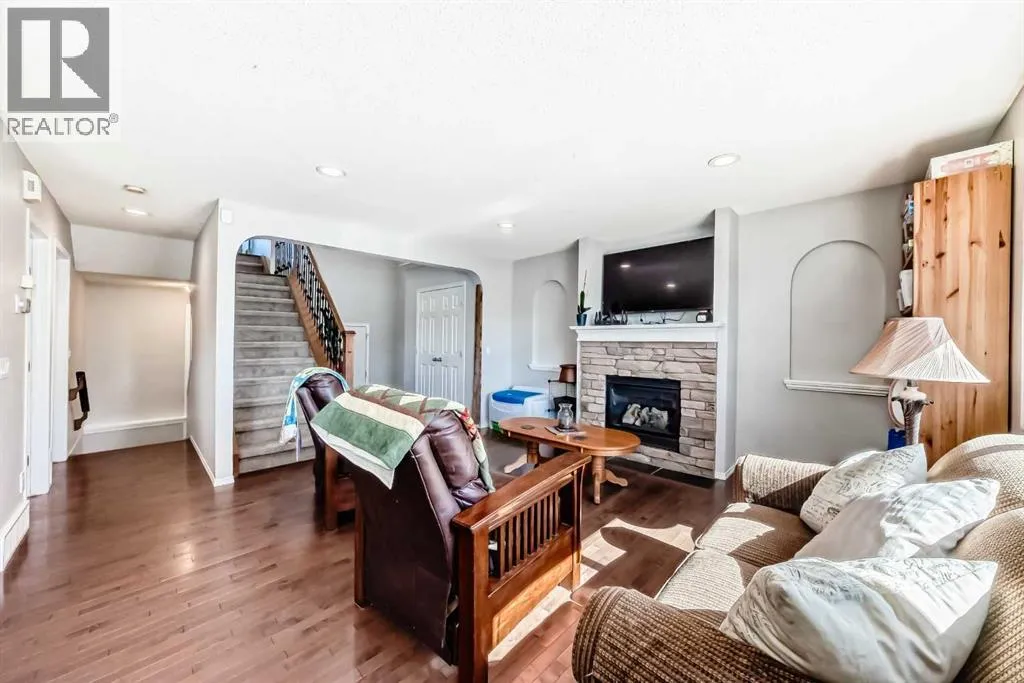 Welcome to 377 Cimarron Blvd – a beautifully updated 2-storey family home in the highly sought-after Cimarron community of Okotoks. Step inside and be instantly captivated by the bright, open-concept main floor where warm hardwood flooring guides you through sun-drenched spaces filled with natural light from large south-facing windows. A striking stone fireplace anchors the living room while the functional