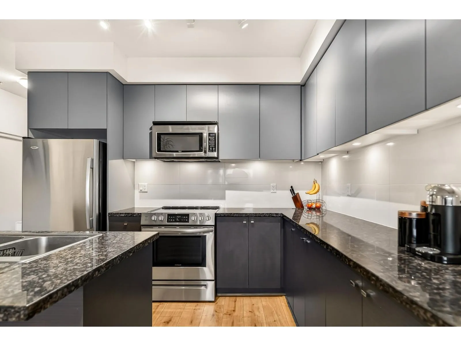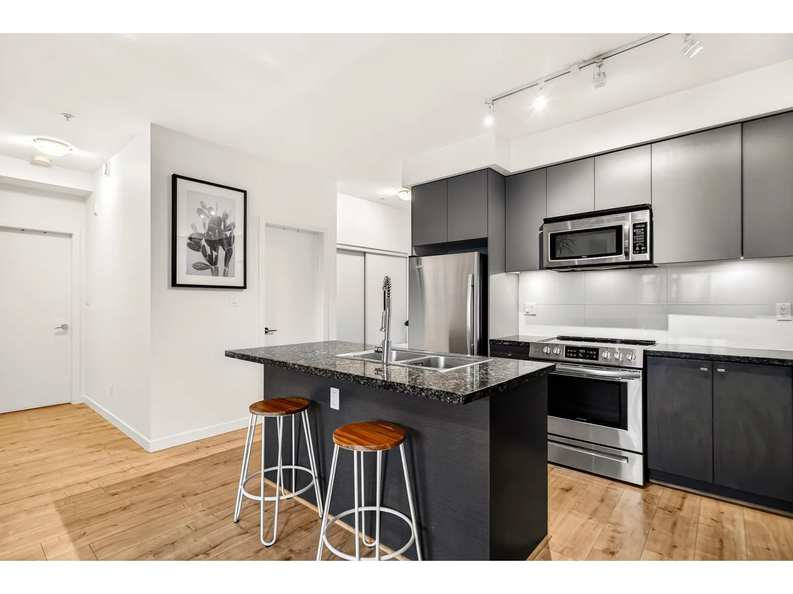 One of the largest 1 bedroom + den layouts available in Waterstone! This home features a spacious open floor plan with updated oak laminate flooring, fresh paint, and oversized windows that fill the space with natural light. The versatile den is perfect for a home office, extra storage, or even a small nursery. Enjoy the covered balcony for relaxing. The