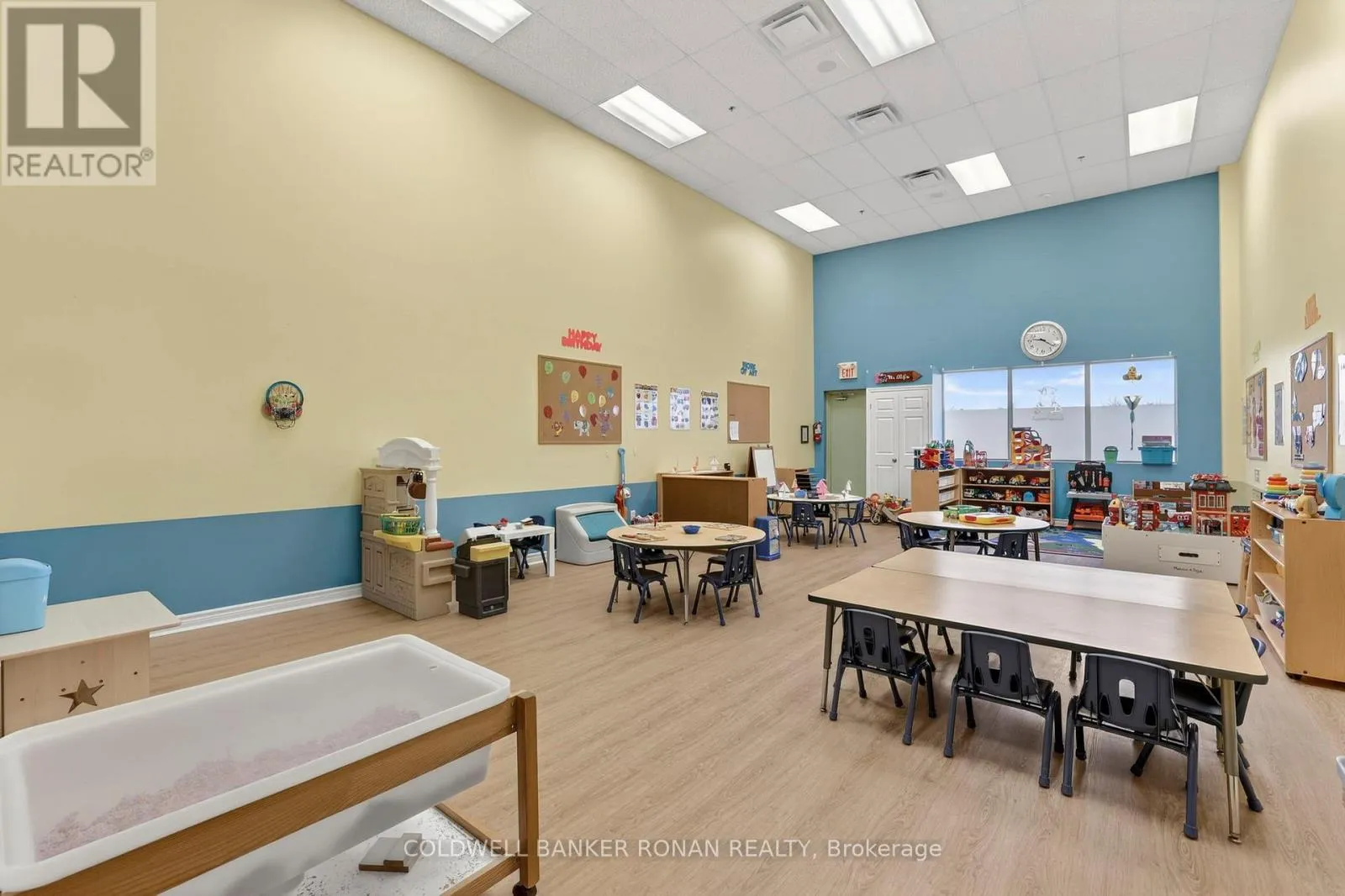 cubbies, enhanced with numerous pot lights and frosted front and rear windows for added privacy. A mezzanine level overlooks the main floor and includes office space, storage, a second washroom, and an additional sink. The sale includes all existing preschool chattels, making this a true turnkey business opportunity. Located in a well-maintained commercial plaza with a strong mix of professional tenants and ample surface parking. Potential for pylon signage, offering excellent visibility and maximum street exposure for your business. Conveniently situated near a variety of children’s amenities. (id:62650)