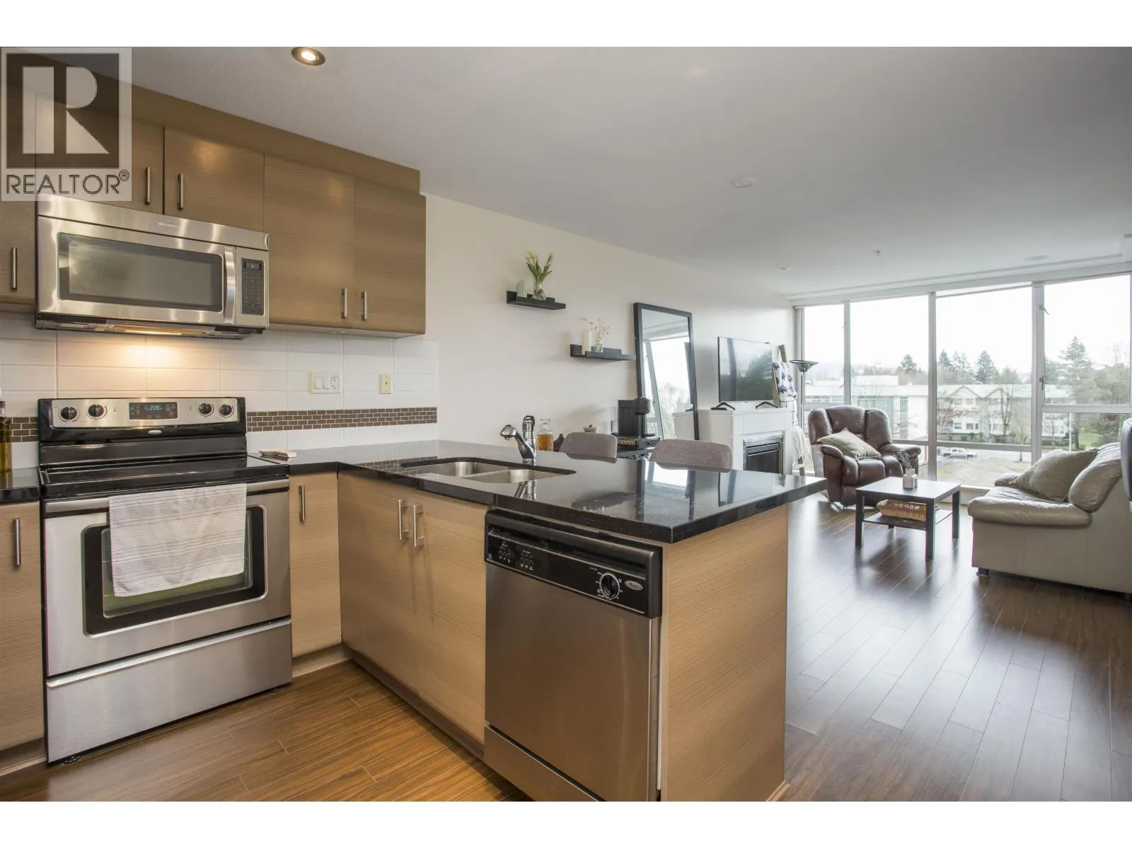 SOLARIS- Pitt Meadows only concrete and steel building! This bright East facing 1 bedroom 1 bathroom home boasts an open and bright floor plan with floor to ceiling windows for tons of natural light. Fresh paint throughout and updated carpets. The kitchen offers a light colour scheme, granite counters and stainless steel appliances. Dining room has an area for a