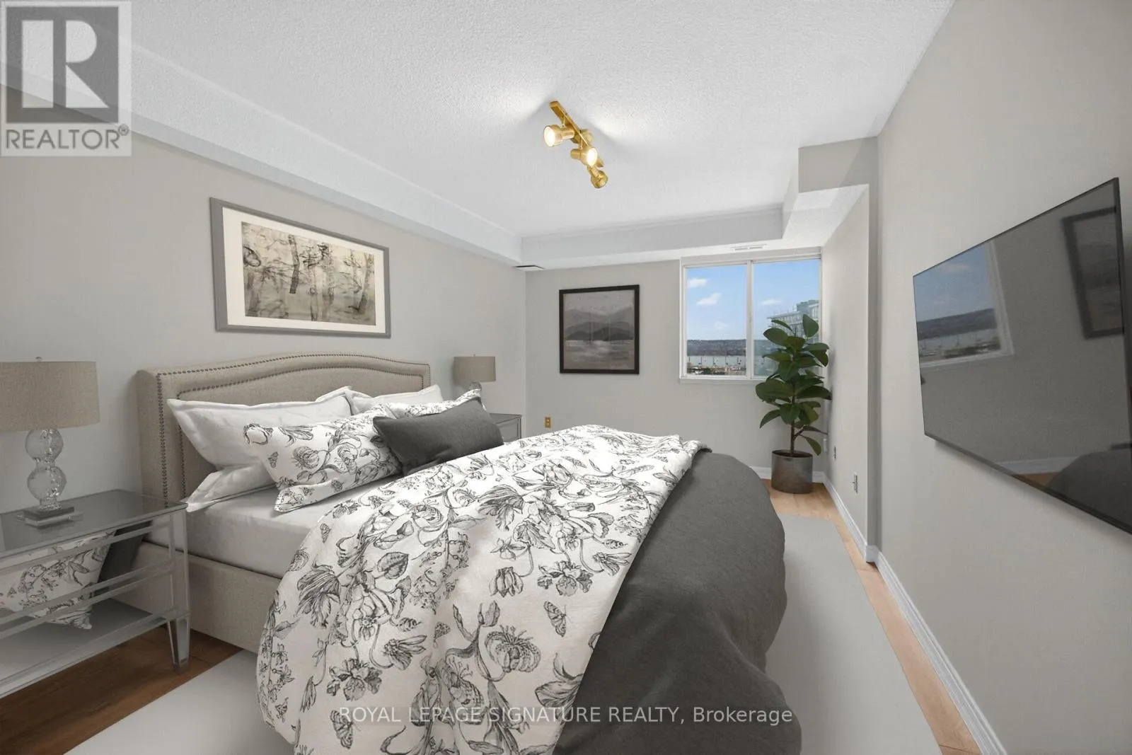 Welcome to the Bayliner, a HIGHLY desirable building within steps to the Lake, Beach and Waterfront Trail. This large 890sqft 1 Bedroom plus Den CORNER SUITE is South-West facing w/lots of natural sunlight, large balcony, panoramic views of the Escarpment, Burlington Skyline and gorgeous SUNSETS. Freshly Painted in neutral colors from Top to Bottom and newer upgraded laminate flooring. Condo