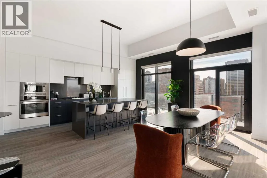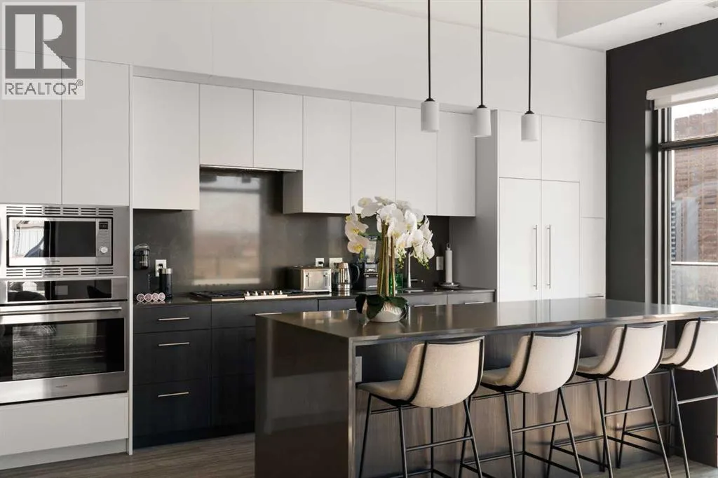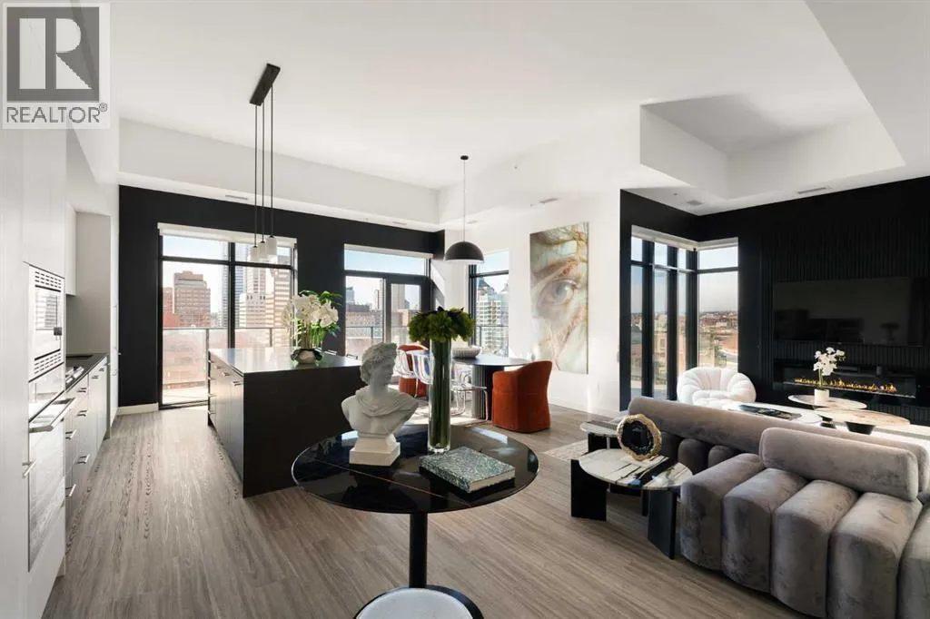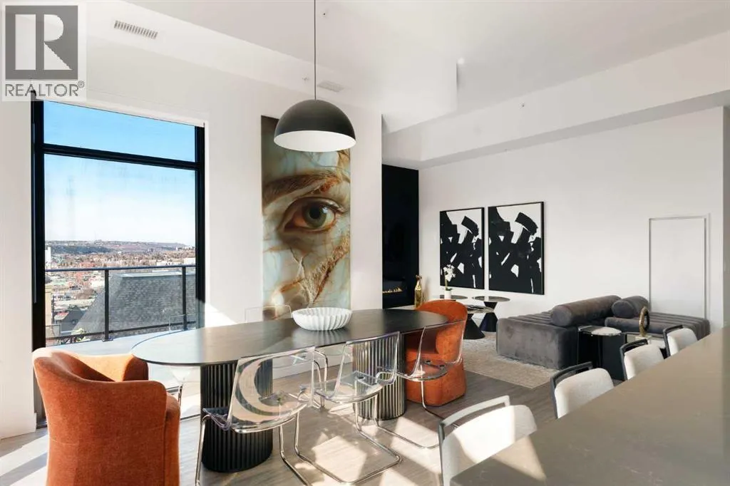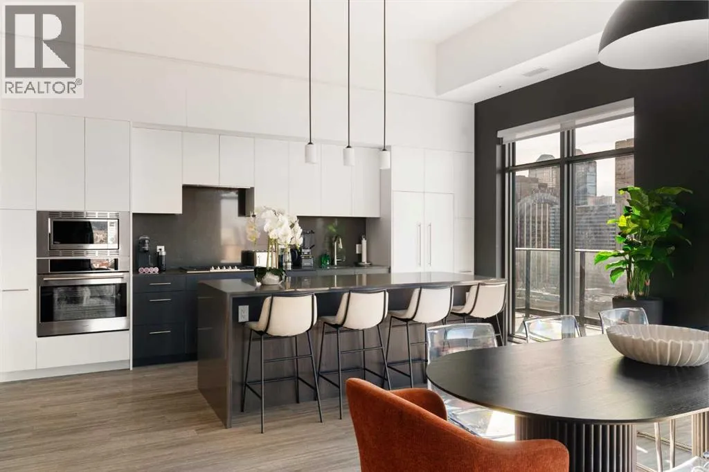 Experience elevated urban living in this luxury penthouse in Downtown Calgary, offering a rare combination of breathtaking views, modern design, and premium finishes. This exceptional 2 bedroom + den, 2 bathroom condo is thoughtfully designed with a seamless open-concept layout that connects the living, dining, and kitchen spaces—perfect for both entertaining and everyday living.The contemporary kitchen features sleek finishes and