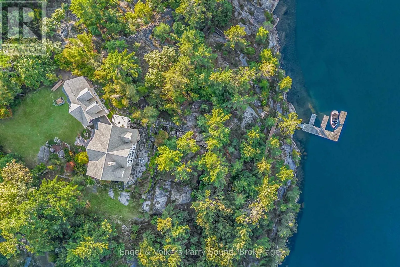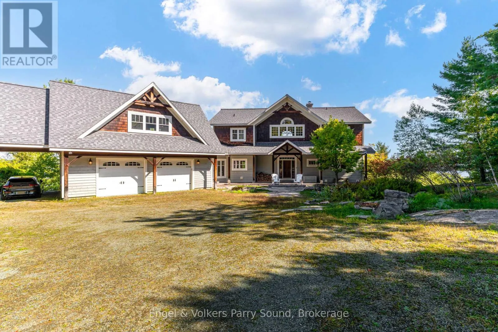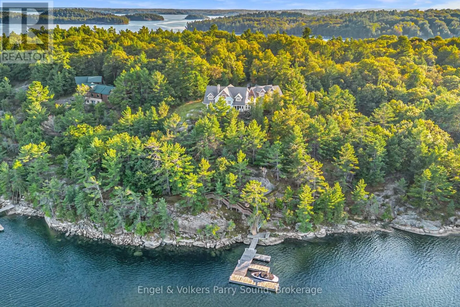Prestigious Year-Round Georgian Bay Estate | Perched atop a sheltered granite outcropping, this custom Georgian Bay masterpiece offers over 3,600 SF of refined living space where timeless craftsmanship meets modern luxury. Designed with a timber frame & accented by soaring post-and-beam construction, the home commands sweeping views of tranquil Carling Bay; an address synonymous with prestige and privacy. Set on
