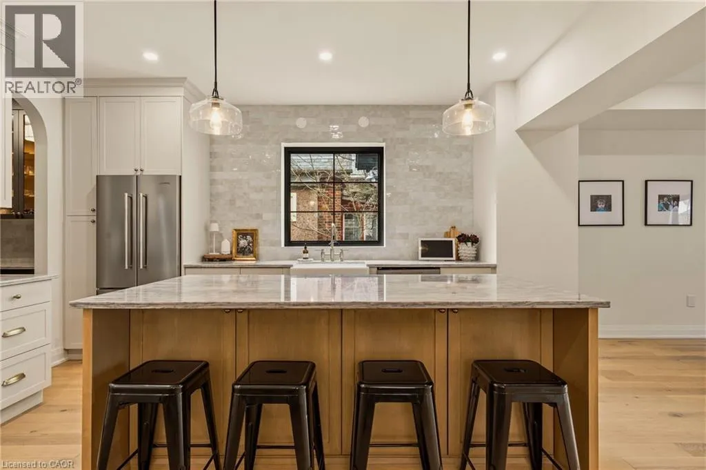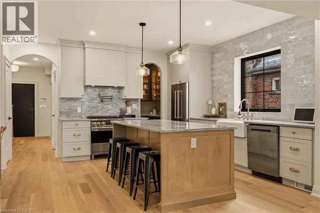 Step into a beautifully reimagined turn-of-the-century 2.5-storey brick home, where extensive renovations and thoughtful additions have transformed it into a stunning blend of historic charm and modern living—all perfectly set in the heart of downtown Dundas. A charming interlock walkway winds through lush perennial gardens to a welcoming covered front porch—an ideal spot to enjoy your morning coffee while taking