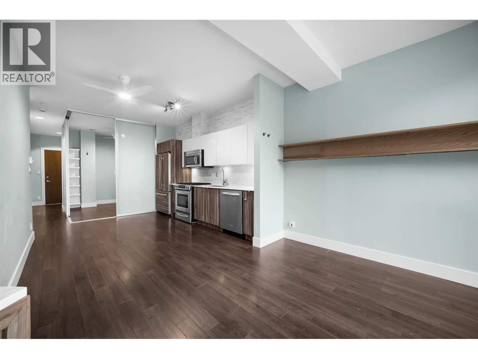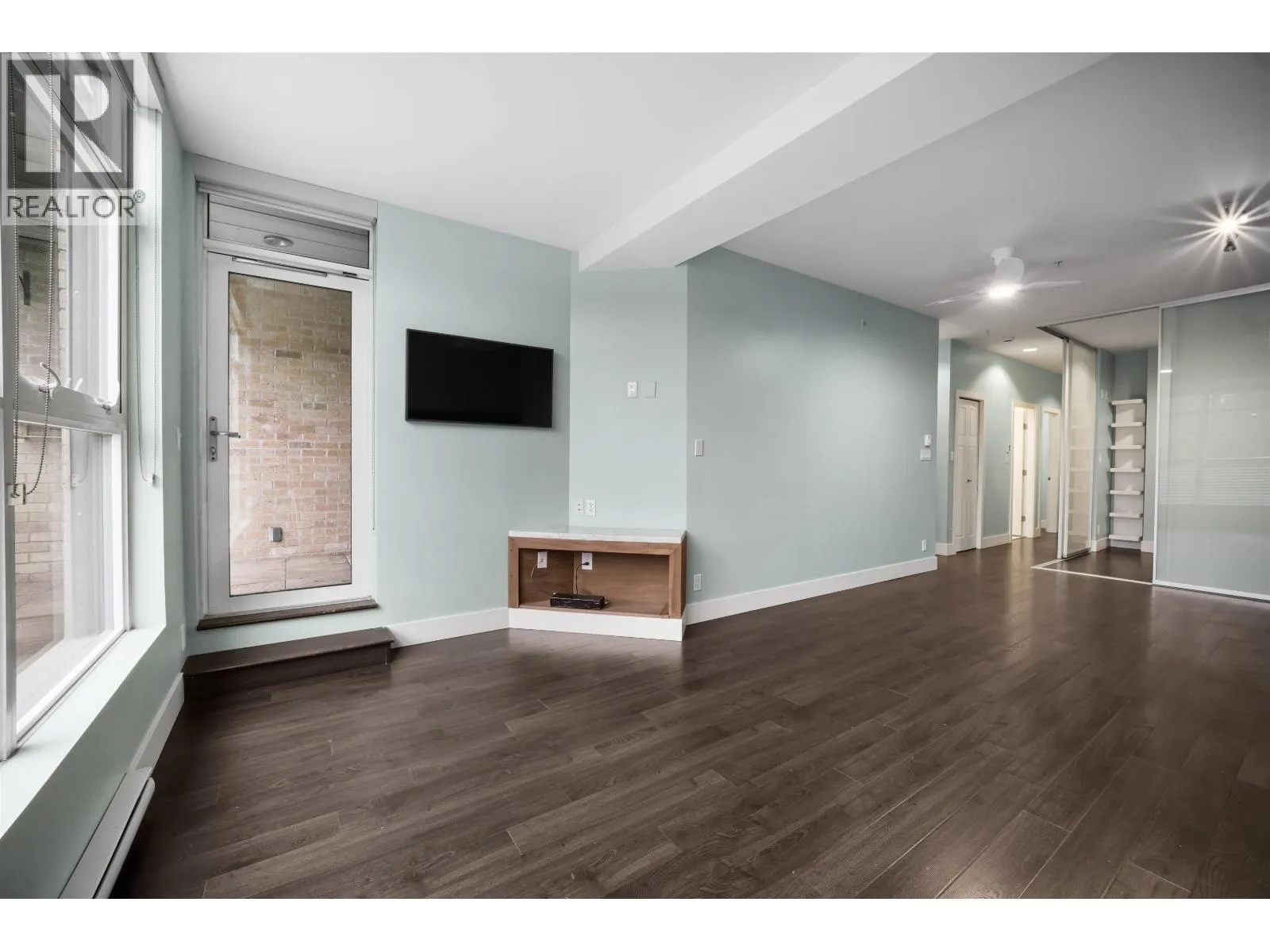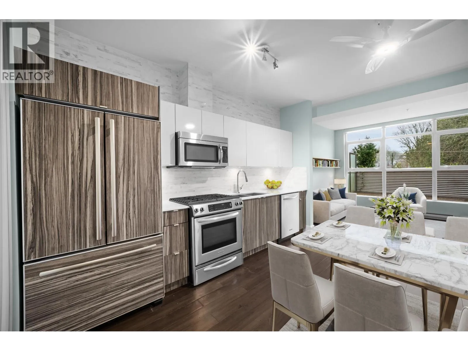 Commercial Drive energy outside, serenity inside. This quiet-side home in Marquee´s rare concrete low-rise, anchored by its oversized patio, delivers location, lifestyle & livability. Open-concept with 9´ ceilings offers great flow: generous living, big dining for table or combo work-eat island, and kitchen with gas range & full-size appliances. Separated bedrooms, two full bathrooms, and a versatile flex room for