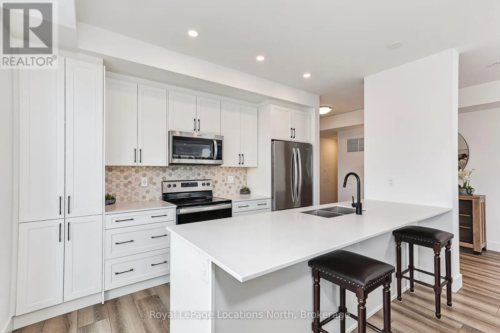Elevate your lifestyle at Royal Windsor, a beautifully upgraded 2-bedroom, 2-bathroom, 1410 sq ft condo showcasing a bright and modern open-concept layout. The upgraded white kitchen features premium finishes, pot drawers, and a spacious pantry cupboard, perfect for everyday living and entertaining. The living, dining, and kitchen areas flow seamlessly to a wraparound balcony, which fills the space with natural