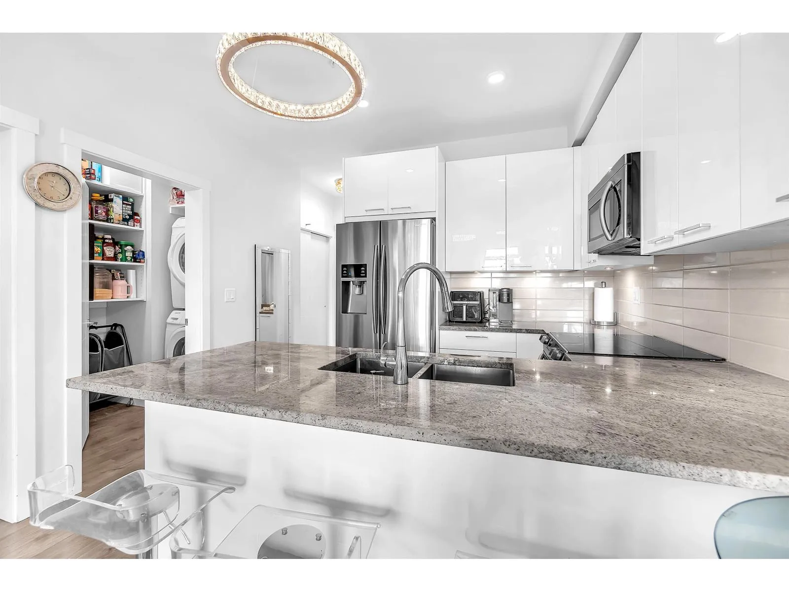 This stunning 2 -bedroom, 2 -bathroom condo at The Georgia features an open-concept layout, ideal for entertaining. The kitchen is equipped with stainless steel appliances and granite countertops. Enjoy 9-foot ceilings, laminate flooring, and air conditioning for added comfort. Includes 1 parking stall and a large storage locker conveniently located right behind the parking. Situated in a vibrant community close