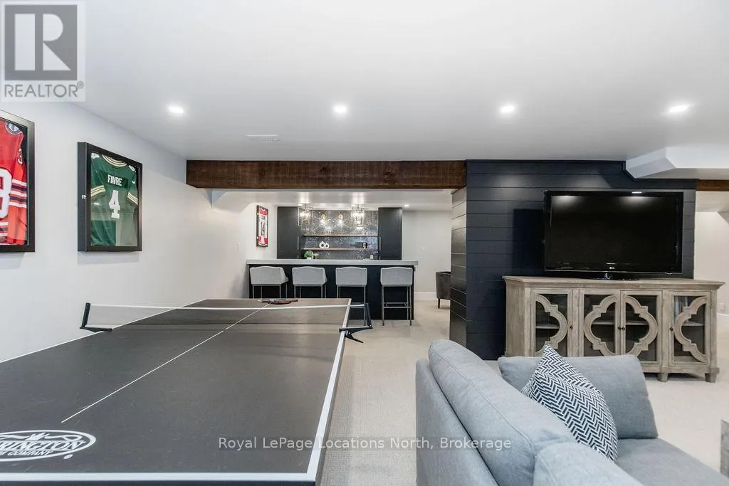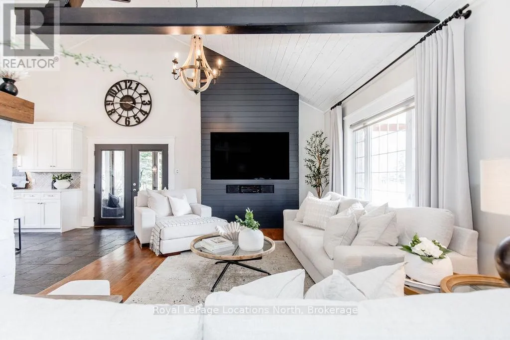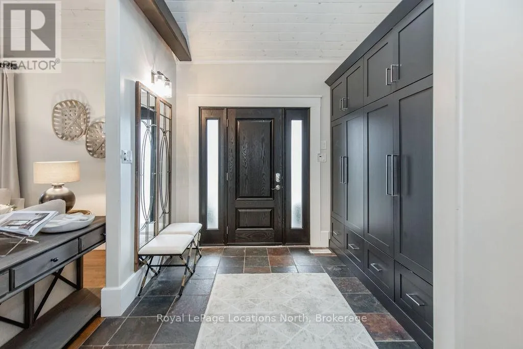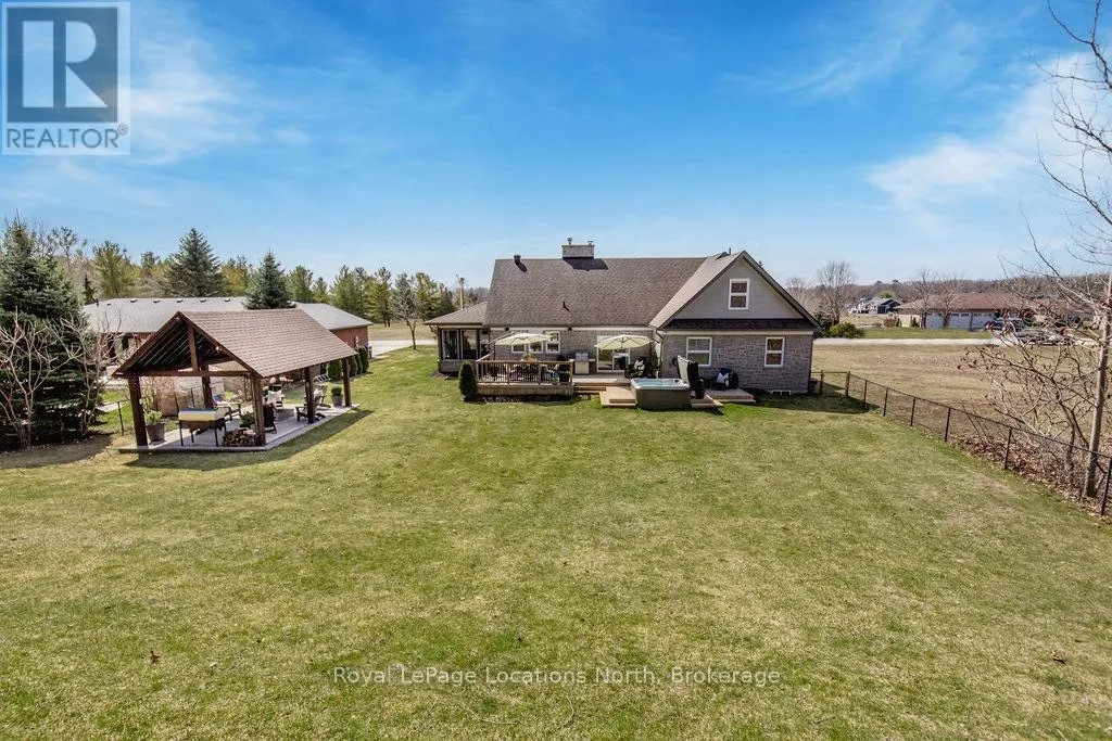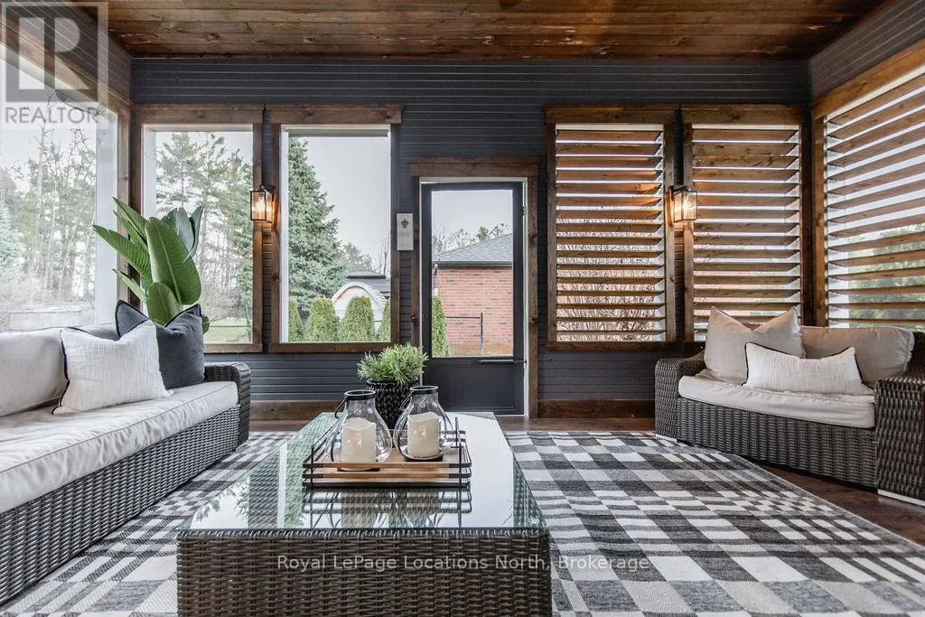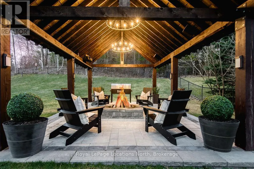Set on a large, mature estate lot backing onto trees in the popular Wasaga Sands estate area, this custom-built modern rustic home offers privacy and warmth. Summer evenings invite you into the backyard where the timber-frame gazebo glows under custom lighting, the fire pit crackles and the treed backdrop creates a peaceful, resort-like setting. In winter, the snow-covered trees provide