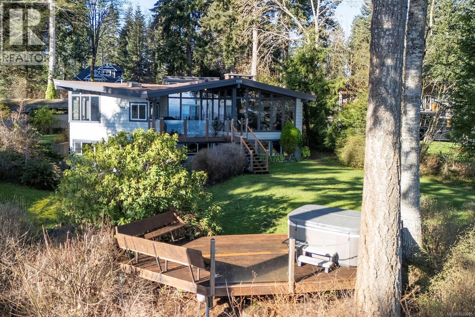 Stunning oceanfront home, plus a detached shop, a self-contained beachfront yurt, and an acre of property! Perched on semi-highbank property, the views here are spectacular and ever-changing throughout the tides and seasons. Inside, the 3000 sq ft home has been extensively renovated throughout, showcasing rich wood tones and original vaulted ceilings. The newer detached shop has a double garage plus