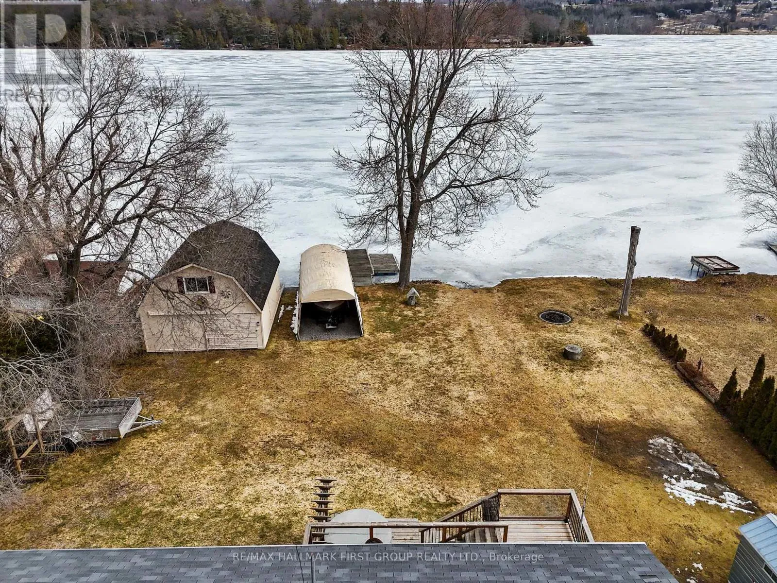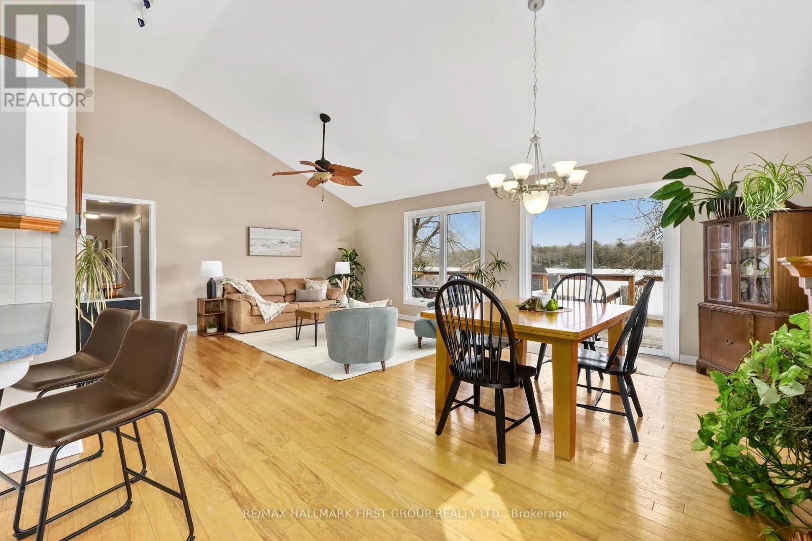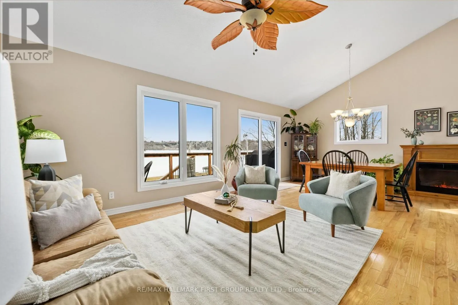 Set along the shores of Rice Lake, this waterfront property offers a thoughtful blend of comfort, functionality, and effortless connection to the outdoors, complete with an attached two-bay garage and boathouse. The main level is designed for easy living and gathering, with an open principal space highlighted by vaulted ceilings and expansive windows that frame unobstructed water views. A walkout