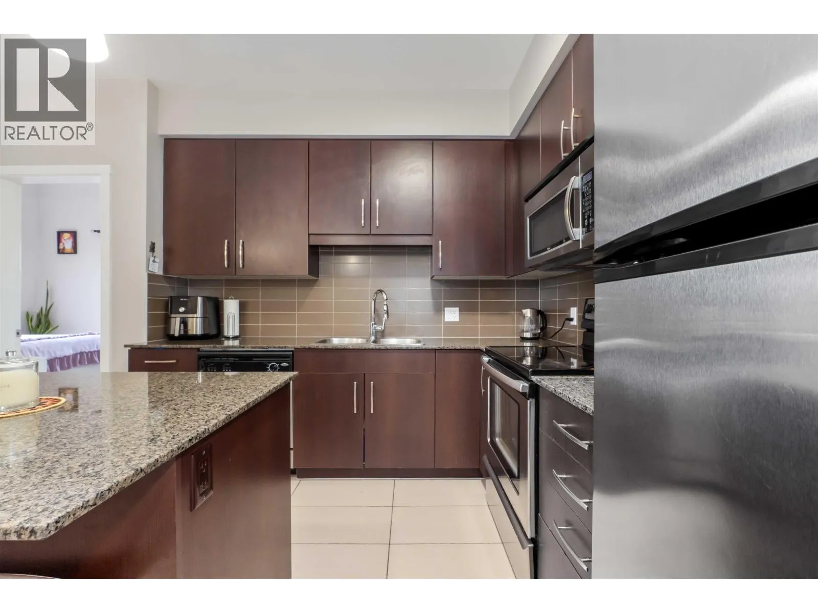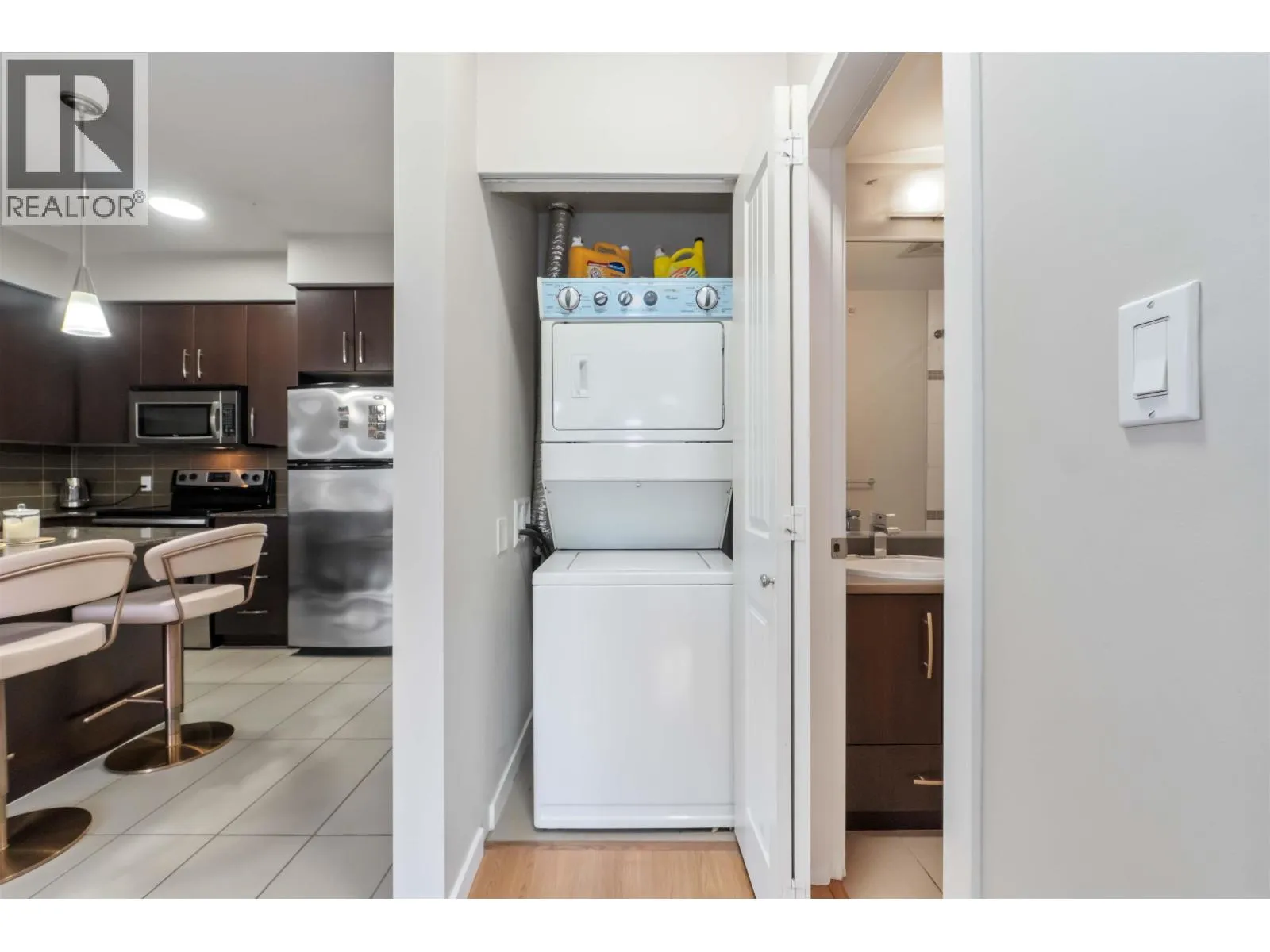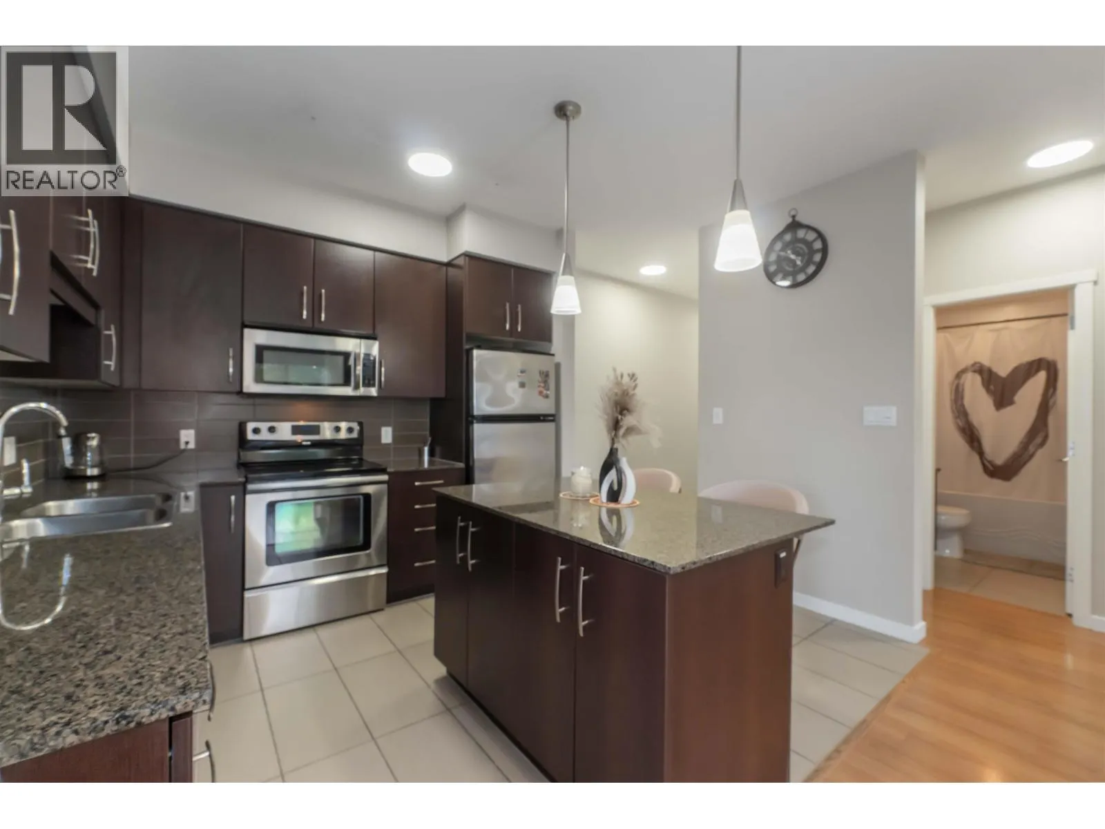 Welcome to Solo in the vibrant core of Maple Ridge, featuring this 2-bedroom/2-bathroom top-floor corner penthouse.The well-planned layout offers a bright and airy feel with soaring ceilings and a spacious living area that separates the bedrooms for added privacy. The modern kitchen is equipped with sleek stainless steel appliances. The primary bedroom boasts dual closets and a private ensuite. Step