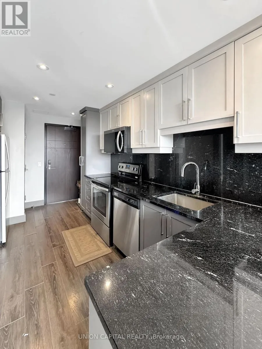 Welcome to Suite S710 at 330 Phillip Street – a bright, south-facing 1+Den unit designed for modern living. The functional layout includes a versatile den that comfortably accommodates a second bedroom, making this an ideal home for students or young professionals. The suite features contemporary finishes throughout, including stone countertops, engineered laminate flooring, decorative wall framing, and sliding doors. Keyless