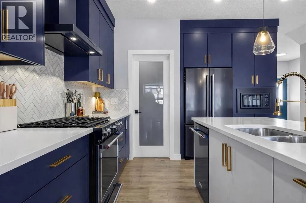 Welcome to this stunning family home in Cochrane, perfectly designed for growing families who love to entertain and create lasting memories. This huge open-concept residence features a gourmet kitchen with dark grey stainless steel appliances, a 5-burner gas stove with built-in microwave, a 4-seater kitchen island, soft-closing cabinets, and a large walk-in pantry. The adjacent dining room opens onto a