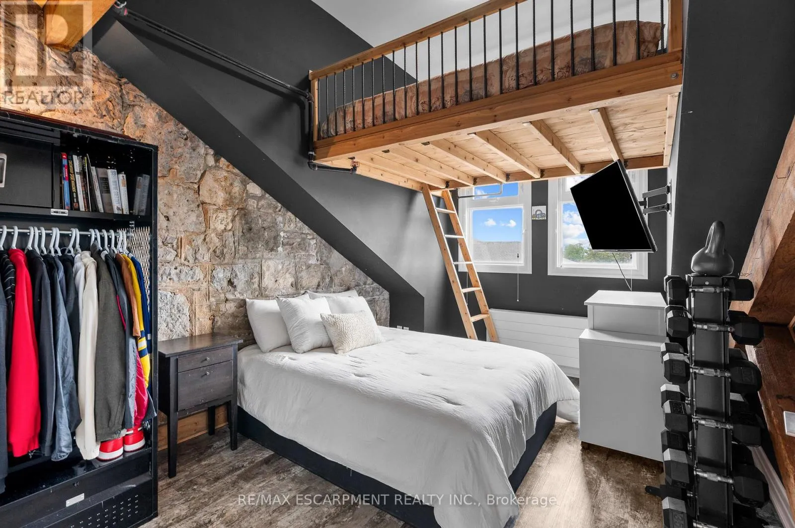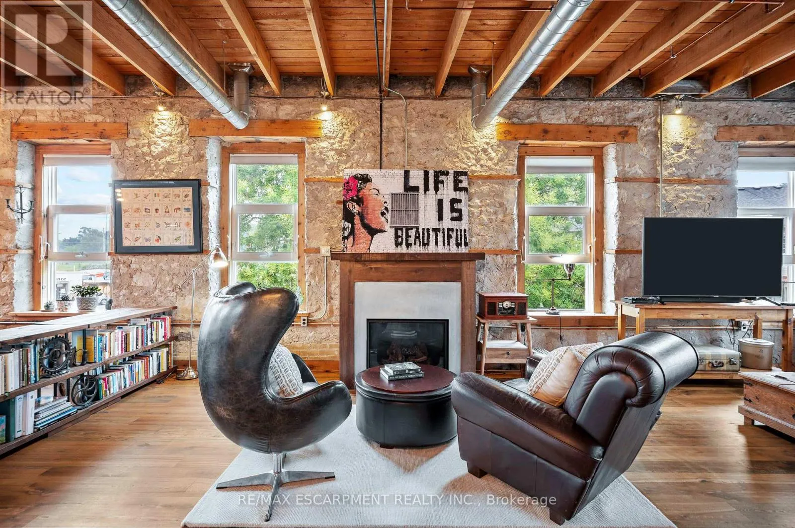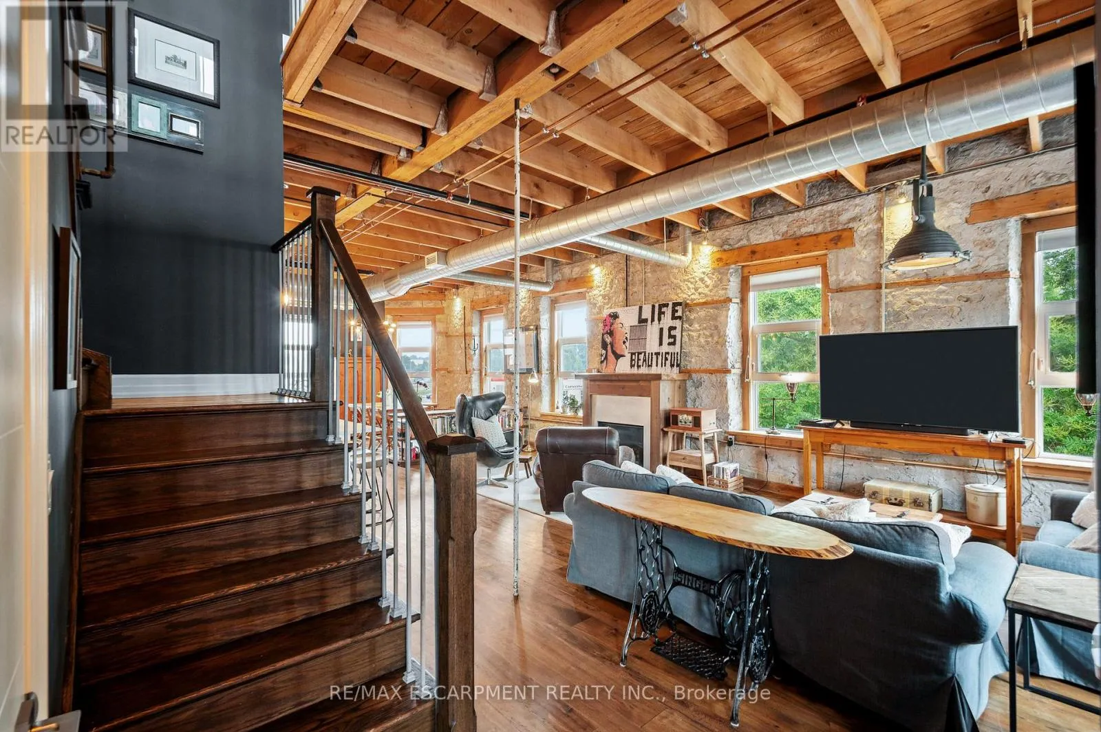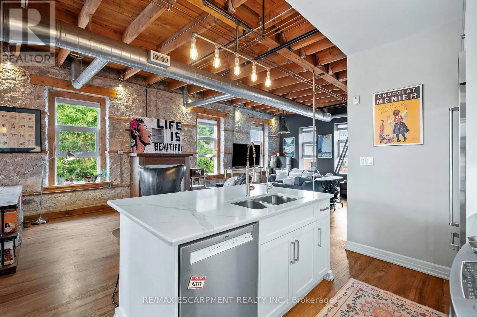 Experience elevated urban living in one of the largest two-storey lofts in the Waterloo Region. This exceptional corner penthouse on the Grand River features soaring 12-foot ceilings and oversized windows that flood the home with natural light. Rich architectural details – including original wood beams and striking stone walls – create a sophisticated New York-style loft ambiance. The main level
