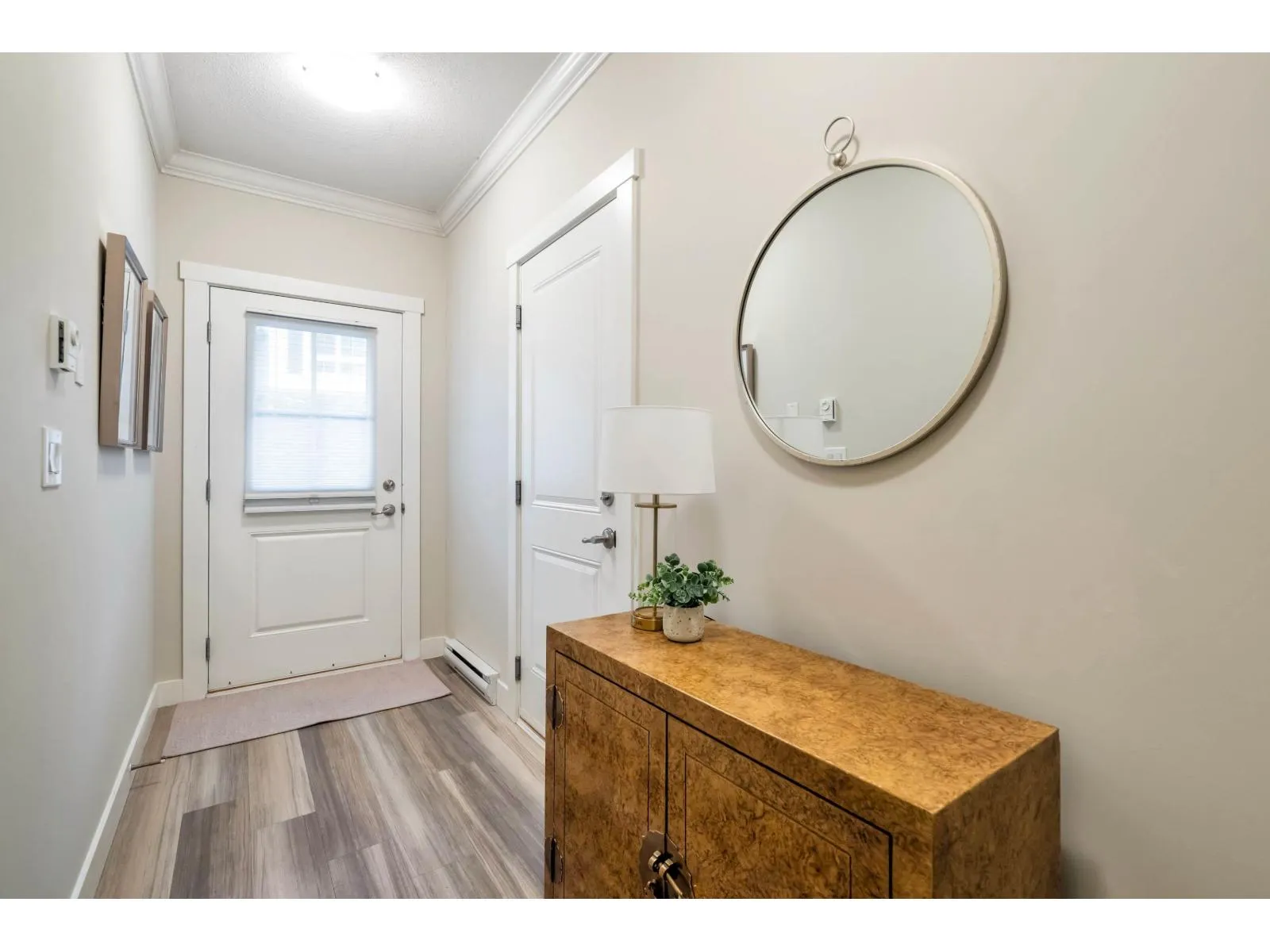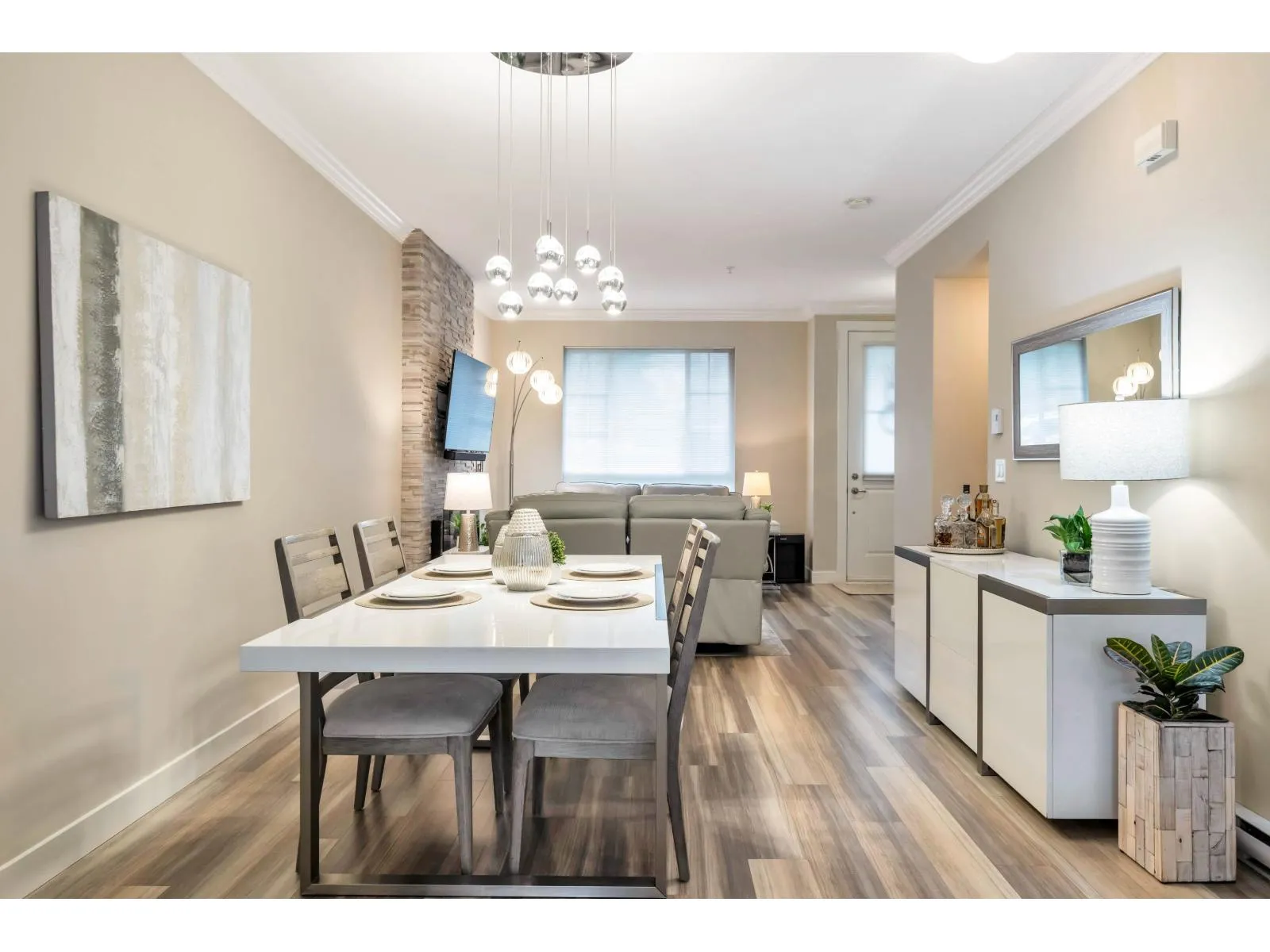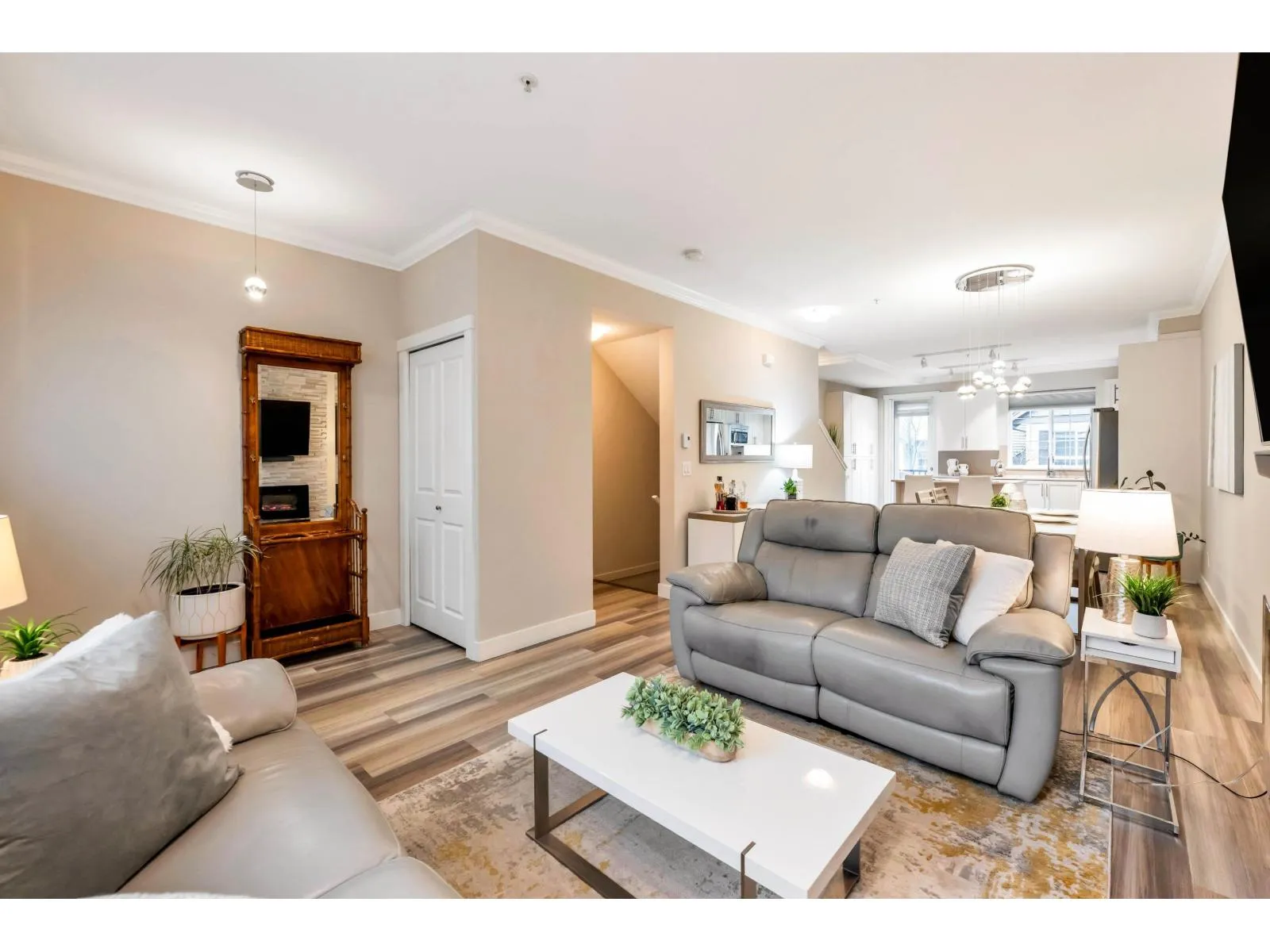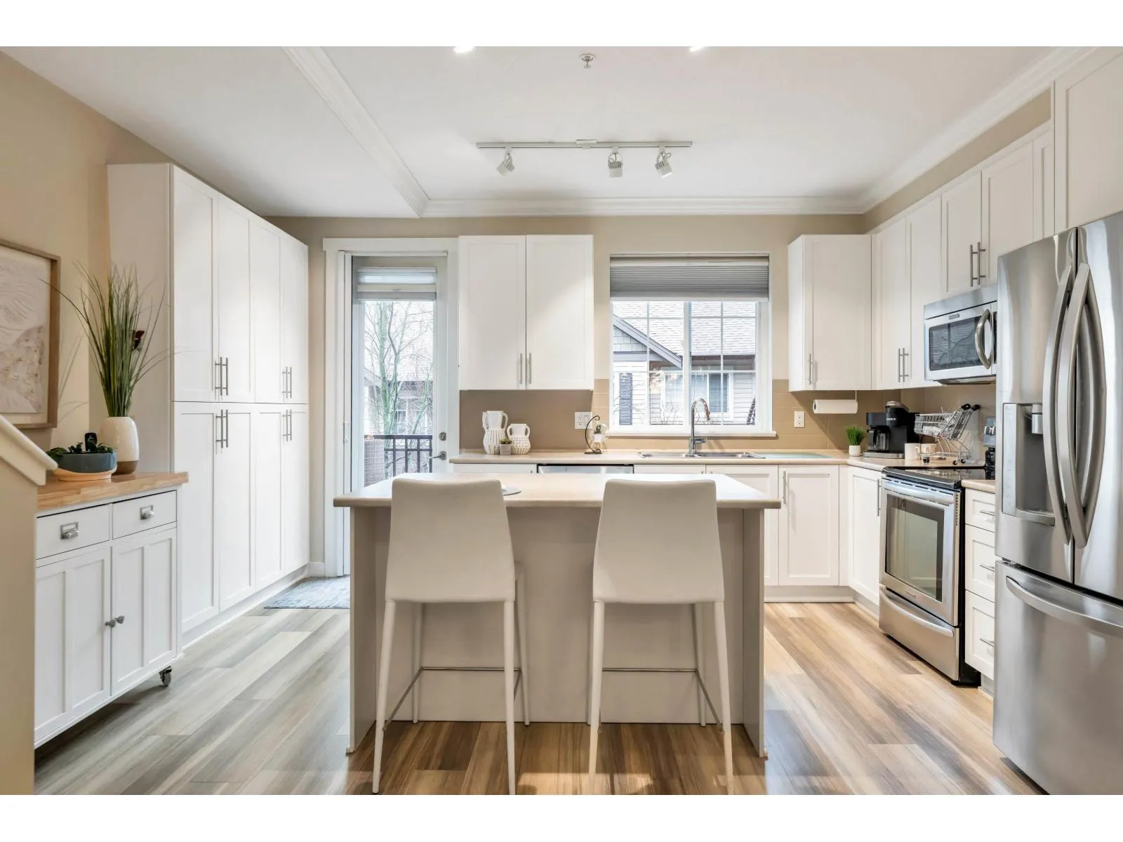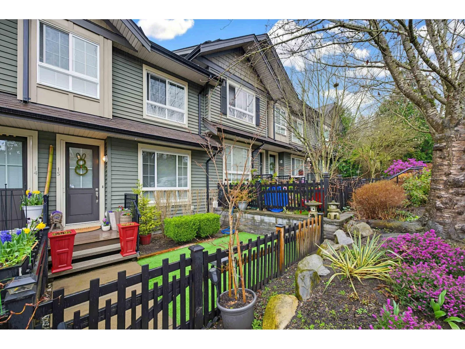 Beautiful 3-bedroom townhome in Murrayville’s award-winning Winchester. Walk-up access through the fenced front yard to the front door & open concept main floor. Sunny & bright living area w/ 9′ ceilings, wide plank vinyl flooring, large window, feature fireplace w/ stone surround, entertainer’s sized dining area, gourmet kitchen w/ white shaker cabinetry, stainless appliances, island w/ breakfast bar, wall pantry,