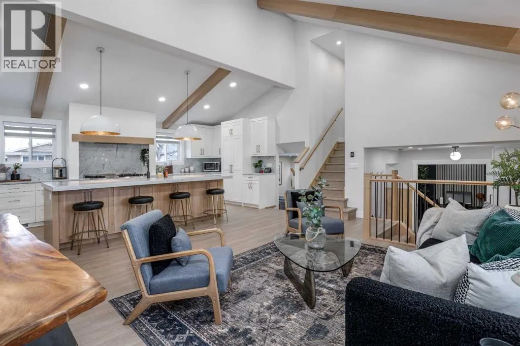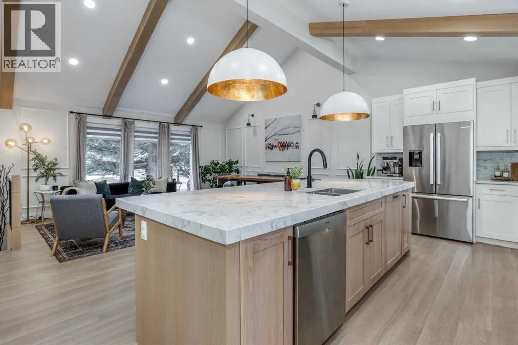 communities, this home makes an immediate impression from the moment you step inside. Sightlines from the foyer open to the elevated second level’s soaring 18-ft vaulted ceilings and exposed oak beams. Luxury vinyl plank flooring runs throughout the home, complementing a thoughtfully designed layout anchored by a welcoming main-level fireplace. This level includes the living room, office, powder room, laundry room, mudroom, and access to the backyard, side yard, and the extra-wide garage with epoxy flooring and a wall-mounted opener. Up one level, the kitchen, dining area, and great room form the heart of the home with open sightlines and excellent flow for everyday living and entertaining, featuring Bosch appliances, a striking 48″ THOR double-oven gas range, custom alcove hood fan, extensive cabinetry, pantry storage, and an oversized 10-ft island. The upper level hosts the spacious primary retreat with walk-in closet and private west-facing balcony with recently replaced vinyl decking, along with a well-appointed ensuite featuring an oversized glass shower and dual quartz vanities. Two additional bedrooms and a five-piece main bathroom complete this level. The fully finished lower level expands the home’s versatility with a large family/recreation room centred around a second fireplace, an additional bedroom, full 3-piece bathroom, utility space, a 35 sq ft children’s playroom, plus 499 sq ft of crawlspace storage (not included in the nearly 2,400 sq ft of developed living space). Over $100,000 in major mechanical and exterior improvements have been completed since 2024, including new roof sheathing and 40-year shingles, spray foam insulation, a new furnace, humidifier and A/C, plus permanent exterior soffit lighting. Interior enhancements include custom built-ins, wainscoting, feature walls, an entertainment unit, and custom carpentry, while a 2023 renovation included updated electrical, plumbing, windows, doors, tankless water heater, and fencing. The outdoors have been upgraded with approximately $35,000 in landscaping since 2024, creating two interlocking stone patios and firepit seating area that complements the wrap-around wooden deck. The irrigation system is well maintained and winterized annually, supporting newly added hydrangeas, junipers, Spire crabapple trees for privacy, and over 150 tulip bulbs planted last fall. An exceptional opportunity to own a fully renovated and mechanically upgraded home just steps from Glenmore Reservoir pathways in one of Oakridge’s most desirable and walkable locations. Please see the 3D Virtual Walkthrough to fully appreciate this home. (id:62650)