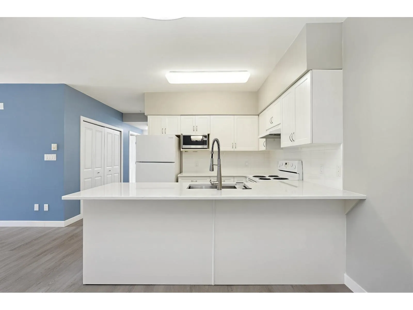 Welcome to Fleetwood Gardens (55 +) and this almost 1000 sq ft 2 bdrm, 2 bthrm END UNIT ! Modern feel with the open floor plan & large dining and living rm area. Kitchen offers plenty of white cabinetry, quartz counters, and peninsula prep/seating space. Well sized primary with a 4 pc ensuite, double closets and its own balcony! Access