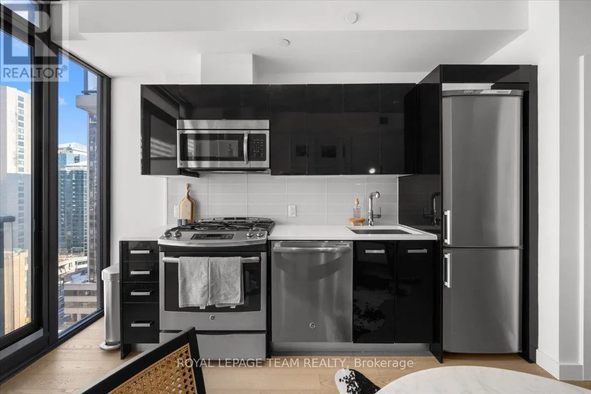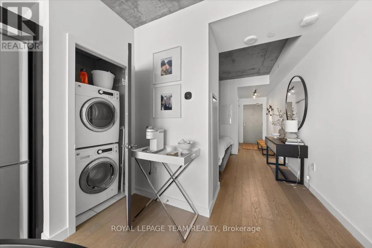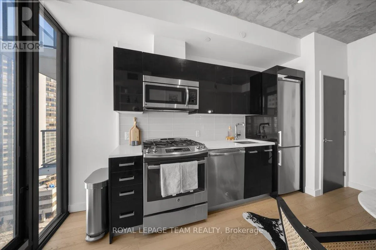 Experience modern urban living at its finest in the heart of Ottawa’s vibrant Centretown at Gotham, a striking 17 storey architectural landmark. This stylish junior one bedroom offers a perfect blend of contemporary design and functionality, featuring rich hardwood floors, exposed concrete ceilings, and floor to ceiling windows that fill the space with natural light.The sleek kitchen is thoughtfully designed