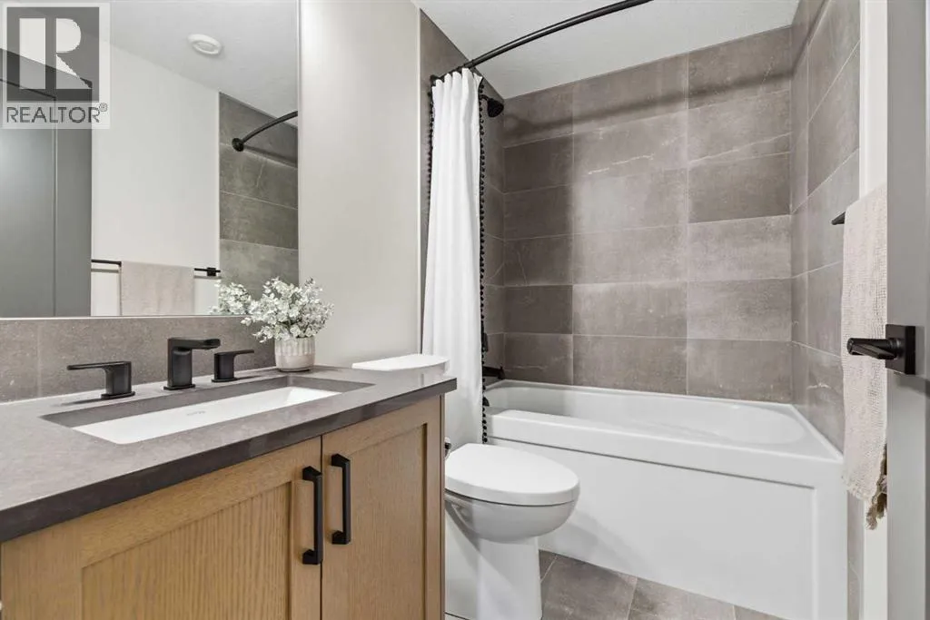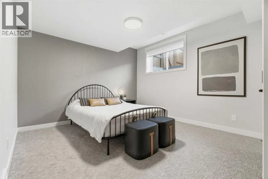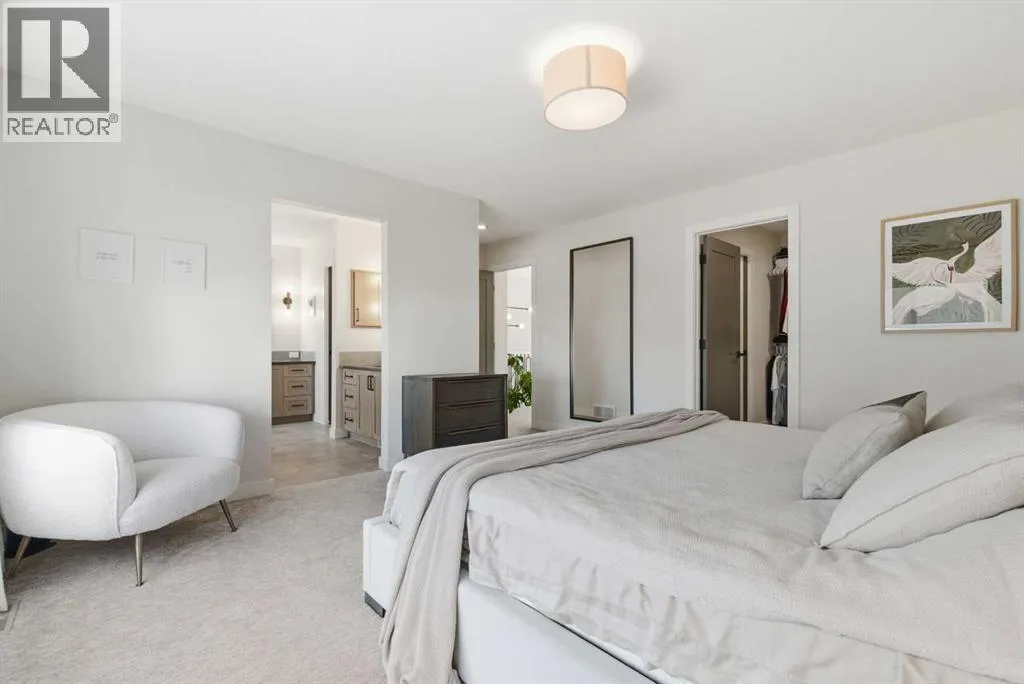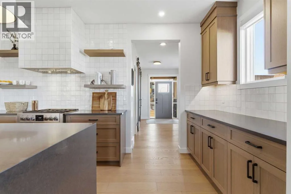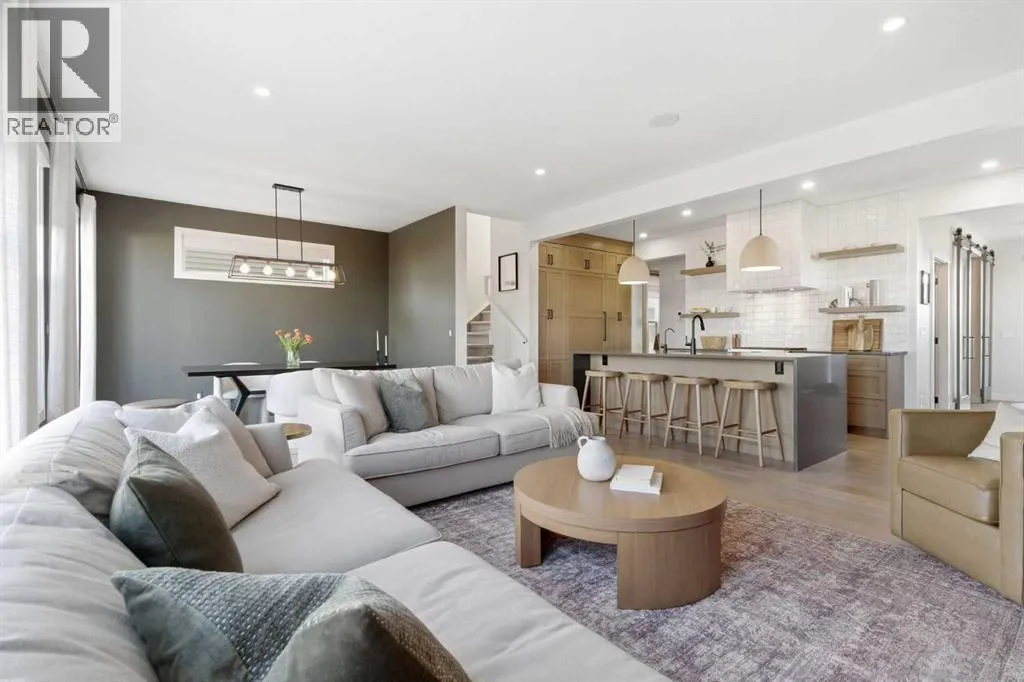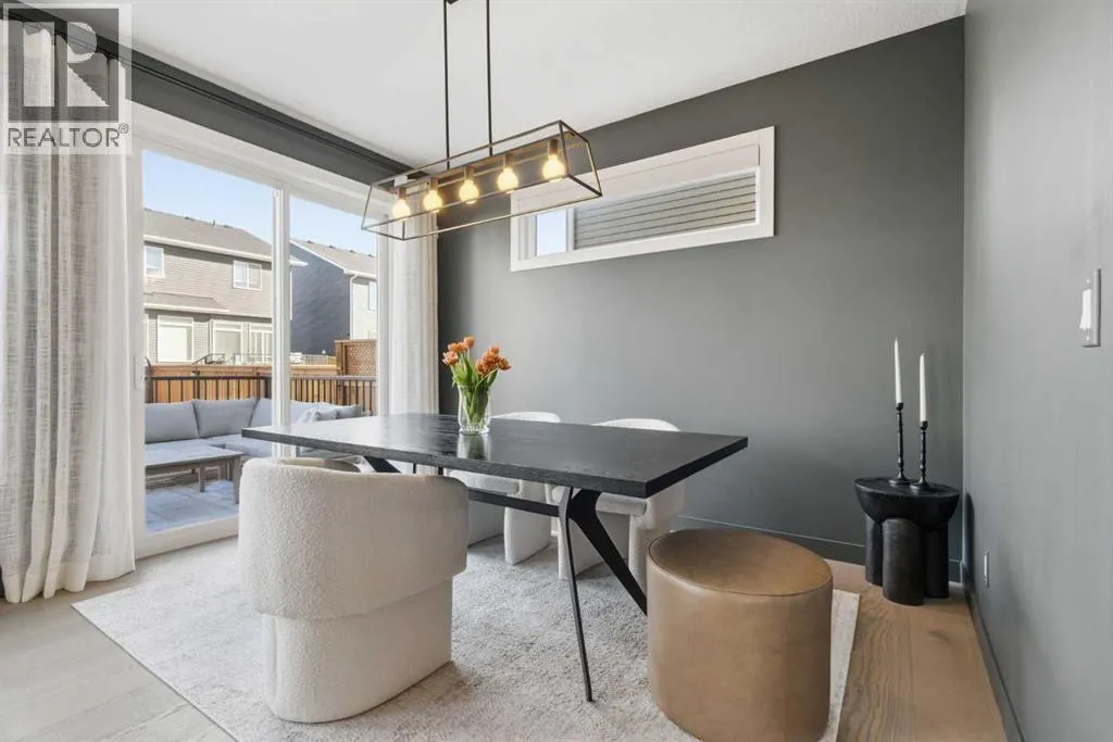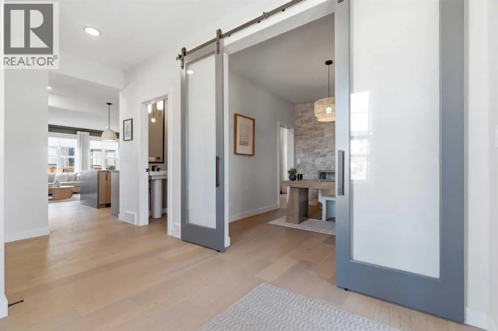 a corner lot, this home is loaded with high-end upgrades and thoughtfully designed for both everyday living and entertaining. As you enter the home, you are greeted by soaring 9-foot ceilings and rich white oak hardwood flooring that flows throughout the main level. The bright and inviting living room features a gas fireplace and elegant decorative wall paneling, creating a warm and refined space to gather. Just off the foyer, a versatile flex room with a glass barn door and striking stone feature wall provides the perfect space for a home office or formal dining room. The heart of the home is the designer kitchen, showcasing white oak cabinetry with integrated appliances, including a hidden fridge and dishwasher, high-end gas range, built-in microwave, and a statement backsplash. Quartz countertops with rounded edges, a large island with waterfall edge and flush eating bar, and full-height cabinetry with crown moulding complete this stunning space. The adjacent dining area opens onto the rear deck and fully fenced landscaped backyard with a stone patio and built-in fire pit – the perfect place for entertaining. A walkthrough butler’s pantry leads to the mudroom with built-in lockers and convenient access to the double attached garage. Upstairs, you’ll find a spacious bonus room with tray ceilings and large windows, along with a convenient study nook. The luxurious primary retreat features a statement stone feature wall, a large walk-in closet with direct access to the laundry room, and a spa-inspired 5-piece ensuite with dual vanities, soaker tub, and a glass shower with bench. Two additional bedrooms, each with their own walk-in closet, and a full 4-piece bathroom complete this level. The fully developed basement with 9-foot ceilings offers even more living space, including a large recreation room with play area, a fourth bedroom, and a full bathroom, making it ideal for guests or a growing family. Additional upgrades include central air conditioning, built-in sound system on the main floor and basement, CAT5 wiring, electronic blinds, and sump pump. Located close to parks, playgrounds, and pathways, Sirocco Golf Course, and Spruce Meadows. This exceptional home offers luxury, space, and functionality in one of Calgary’s newest and most desirable communities. Book your showing today! (id:62650)