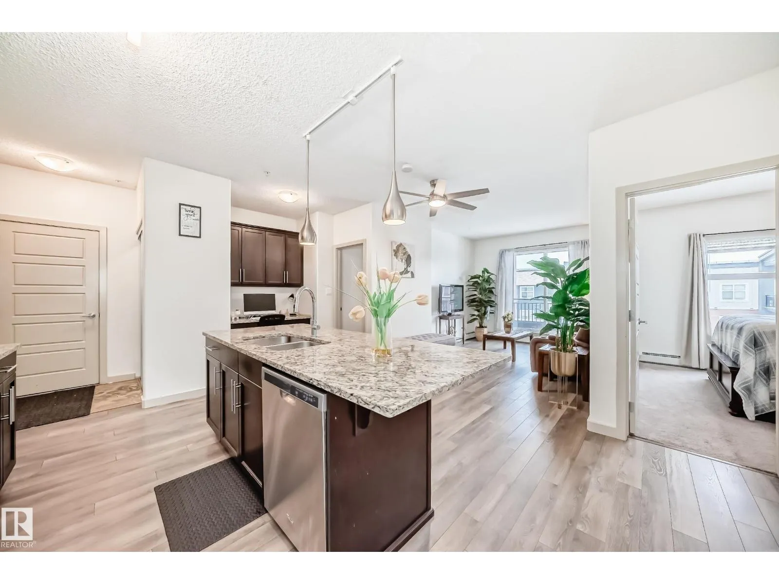 Welcome to this TOP FLOOR, 2 BEDROOM + 2 BATHROOM condo with TWO TITLED PARKING STALLS in the highly sought-after community of Griesbach! This beautifully designed home offers exceptional value/quality craftsmanship & modern finishes throughout. Step inside to an open-concept layout featuring a bright living room with nice laminate flooring that elevates the entire space. Enjoy your morning coffee or