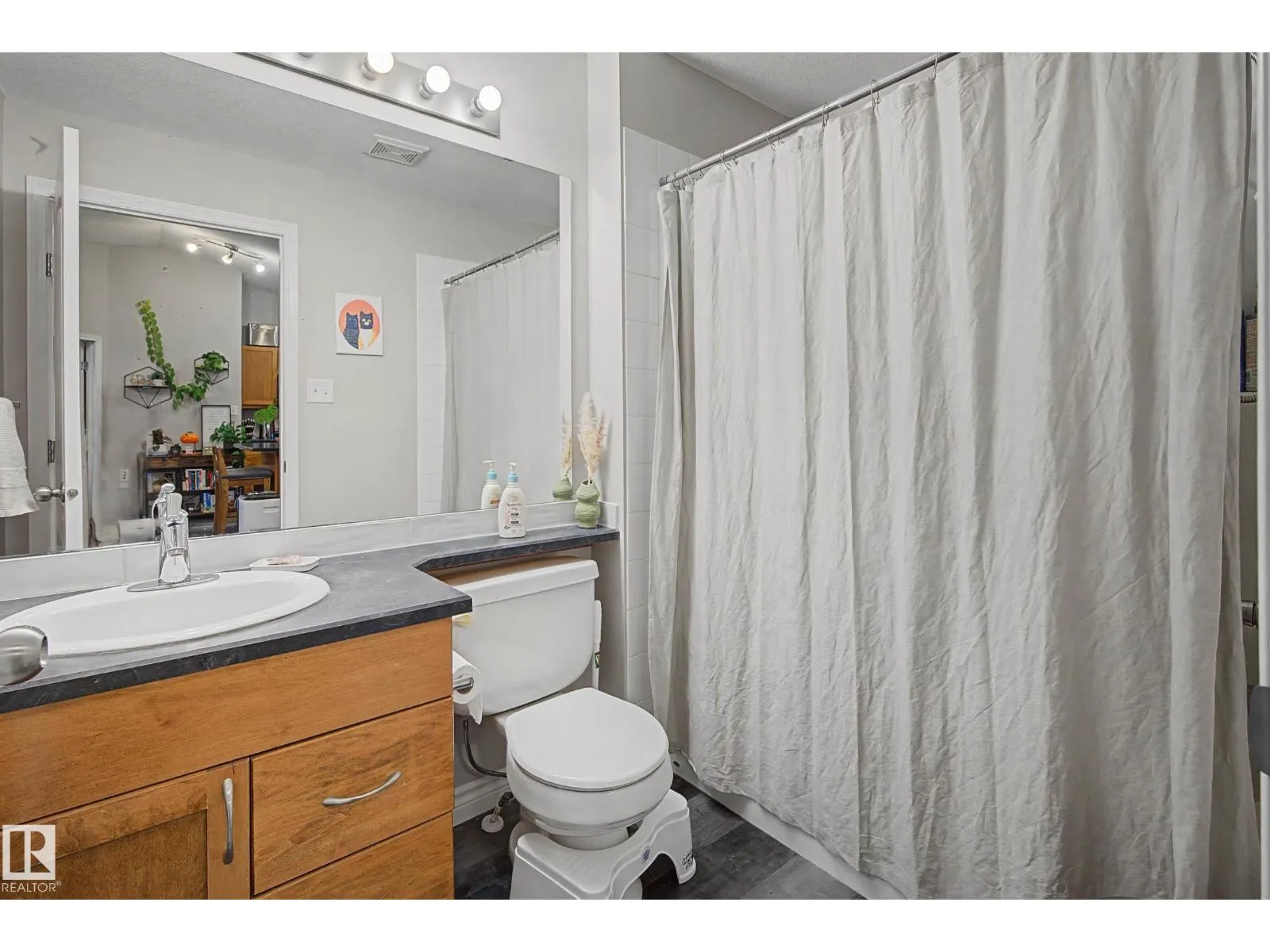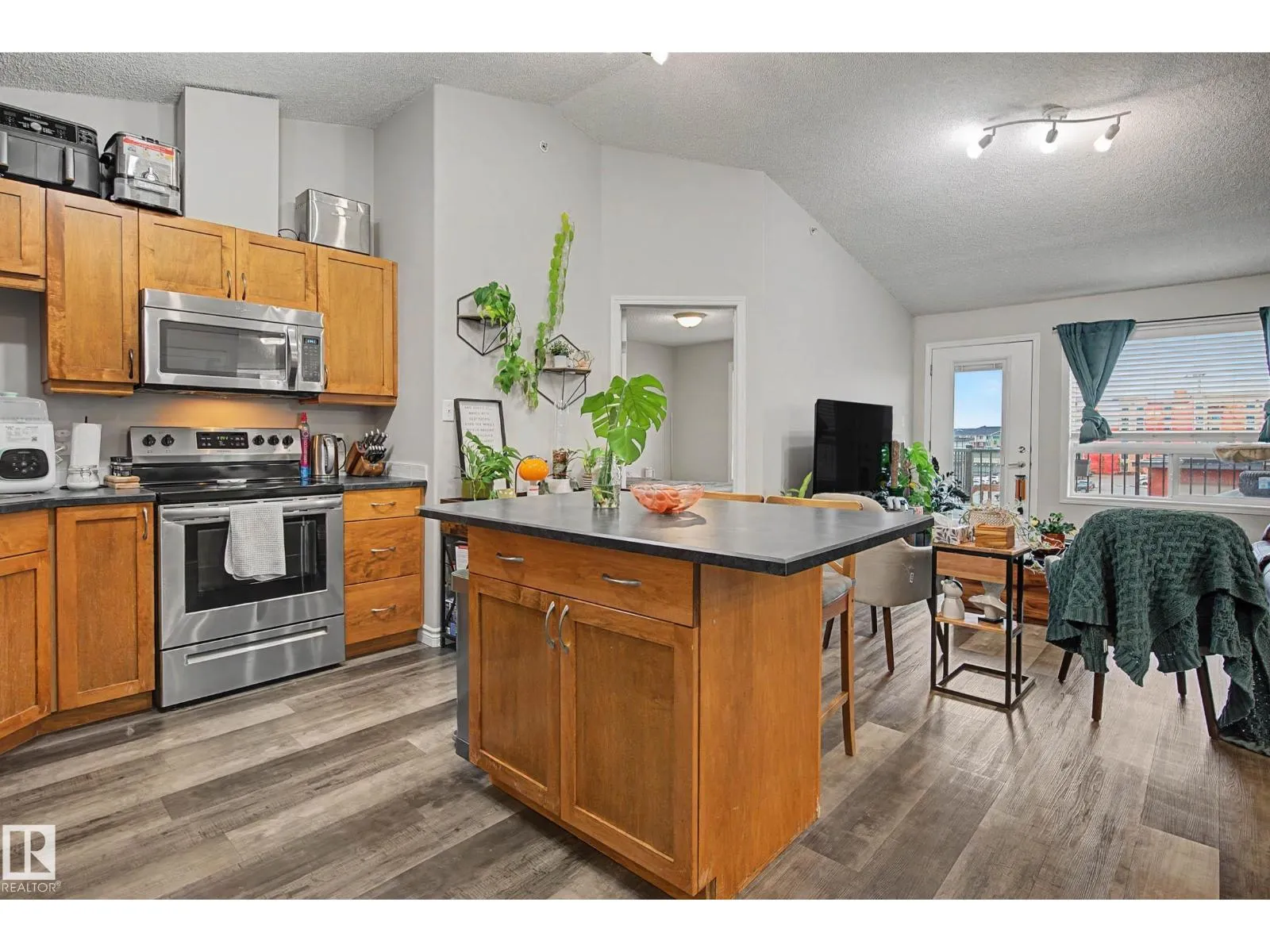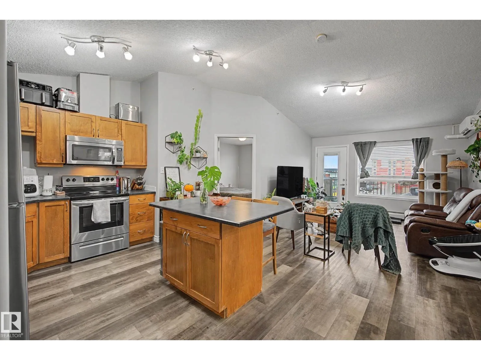 This top-floor unit features a vaulted ceiling and AIR CONDITIONING, setting it apart from other units in the building. The 2 bed, 2 bath layout is well designed with bedrooms and bathrooms on opposite sides. This is an ideal setup for roommates, guests, or added privacy. The kitchen offers an island, stainless steel appliances, and generous cabinetry. A rare