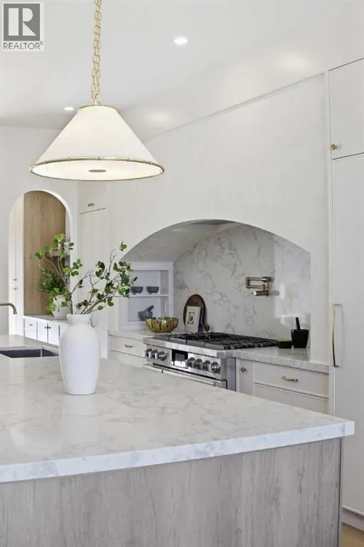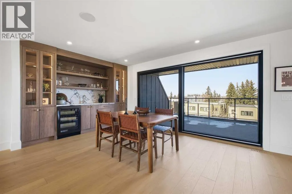 Inside, it’s all soft curves, high ceilings, and French-inspired finishes that manage to be both romantic and livable.The kitchen is where you’ll spend your most of your time. A 14-foot quartz island with dual-sided storage anchors the room; functional, surrounded by premium oversized appliances that make you want to cook. On the other side, custom built-in display with glass windows and LEDs to show off your fancy dinnerware. Pot filler, spice racks, open shelving, quartz backsplash. The custom arched hood fan is finished in Venetian plaster, adding texture and depth you don’t see in most new builds. The butler’s pantry with sink and cabinetry keeps the mess out of sight, while the mudroom with built-ins handles daily life seamlessly. Warm cabinetry gives the whole space personality and warmth.The arched window floods the home with natural light into the dinning area. A living room with a Venetian plaster fireplace surround. Step outside to a turfed backyard and composite deck that is beautiful, low-maintenance, ready for summer dinners, morning coffee, or quiet evenings under the stars.Upstairs, the primary suite is your private retreat. Wake up to soft light and city views, then step into a spa-like ensuite with dual vanities, arched mirror details, custom plaster finishes, in-floor heat, and tilework that was thoughtfully designed. The shower is a showstopper with multi-integrated tiles and quartz jamb, straight out of a design magazine. Sit on the bench and enjoy the steam shower. The secondary bedrooms are generously sized with walk-in closets, and the shared bathroom with in-floor heat blends Fre nch-inspired design with everyday practicality, dual vanities.The third floor is where this home earns its reputation. A rooftop lounge with another beautiful gas fireplace, opening onto a patio with sweeping downtown views. The kind of space you’ll use constantly, not just on special occasions. The custom wet bar features brass tipping rails, glass shelving with LED lighting, and finishes that feel refined but never stuffy.The basement expands the living space even further: a huge guest bedroom/rec room or gym, full bathroom, extra storage, heated floor and heated driveway rough-ins for future comfort.Epoxy-finished heated garage with built-in speakers. Central A/C. Full security system. Integrated sound. Front and back landscaping designed so you’re not spending weekends on yard work.Minutes from cafés, shops, and downtown Calgary, but it feels like its own world. European charm, thoughtful craftsmanship, and design that doesn’t age.Elegant, functional, effortlessly beautiful. This is the one! (id:64429)