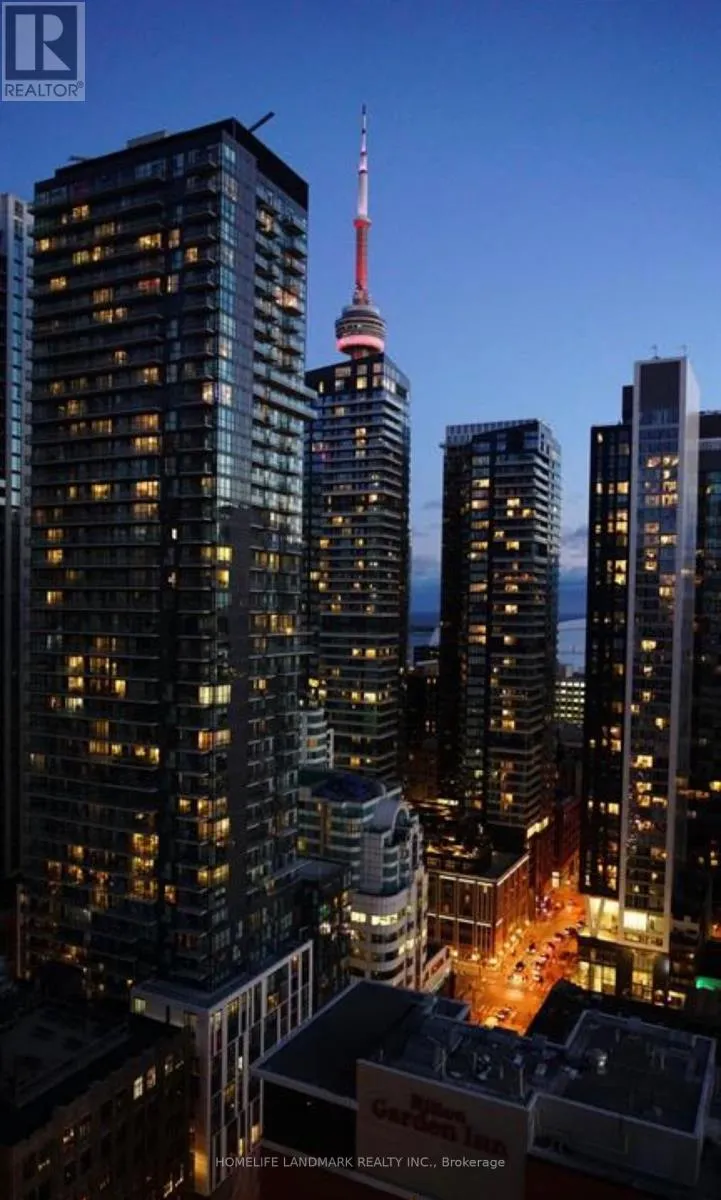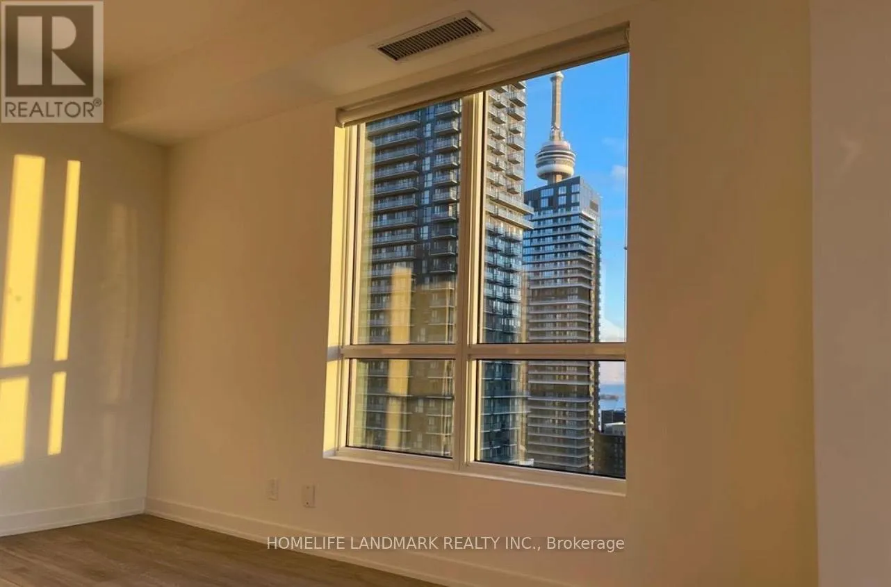 *Beautiful Corner Suite* – 2 Bed + 2 Bath in a Prestigious Luxury Residence.Perched on a high floor with breathtaking southwest views stretching across the city skyline and Lake Ontario. This sun-filled unit offers a thoughtfully designed layout with floor-to-ceiling windows and an elegant open-concept living space.The modern kitchen features built-in appliances, sleek cabinetry, quartz countertops, and a stunning waterfall