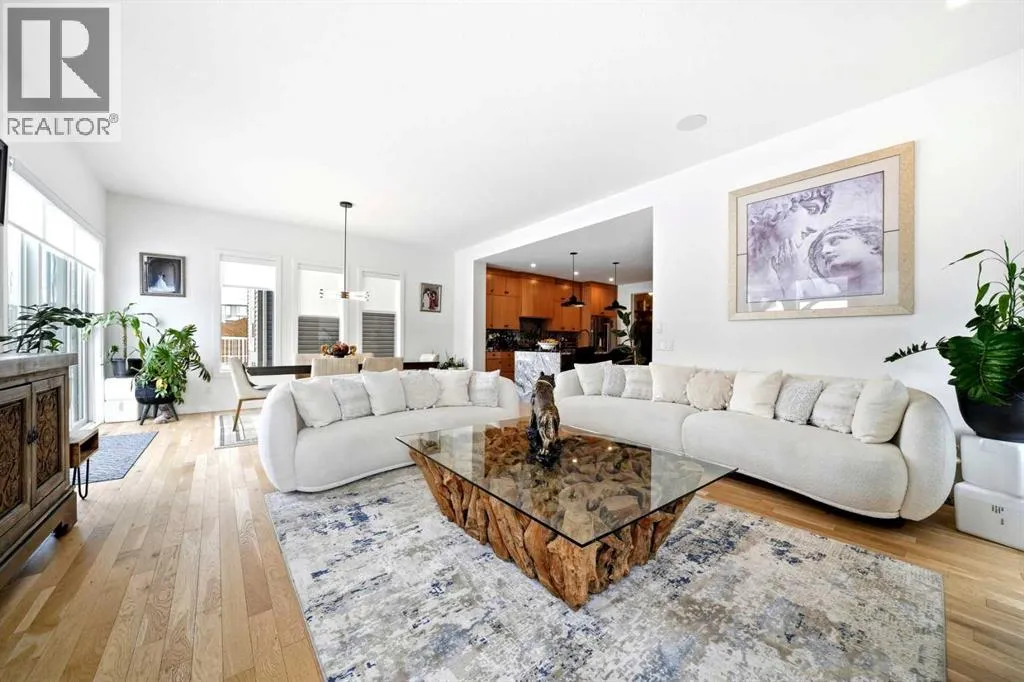 with impressive 10’ ceilings and expansive windows that flood the space with natural light, creating an open and inviting atmosphere.The chef-inspired kitchen is a true showpiece, featuring premium KitchenAid appliances, a Hansgrohe faucet, rift-cut white oak cabinetry with stacked uppers, a custom hood fan, and striking Viscount White granite waterfall countertops. A matching granite backsplash and custom fireplace surround tie the space together with a sophisticated finish.Thoughtful upgrades continue throughout, including 8’ interior doors on the main and upper floors, triple-pane casement windows, an oversized 8’ patio door, and sleek black spindle railings. Mirage white oak hardwood floors extend through the main level and staircase, adding warmth and timeless elegance. The home is illuminated by designer Kuzco lighting, backed by the 5-year Alberta New Home Warranty, while roller blinds throughout provide both privacy and style.Upstairs, you’ll find four generously sized bedrooms, a central bonus room, and the convenience of upper-floor laundry. The primary suite offers a private retreat with dual walk-in closets and plenty of space to unwind. The ensuite and bathrooms throughout the home are beautifully finished with fully tiled showers, a freestanding tub, high-end Toto and Moen fixtures, and full-height mirrors that enhance the sense of space.The lower level is partially developed with a completed 4-piece bathroom and a fifth bedroom, while over 700 sq. ft. remains for your personal vision—complete with a wet bar rough-in, ideal for a future media room, rec reation space, or home gym.Additional highlights include built-in ceiling speakers in the living room, Lutron Caseta smart lighting controls, and a double attached garage for year-round comfort and convenience. Step outside to enjoy the expansive custom-built 18’ x 26’ cedar deck—perfect for relaxing or entertaining on warm summer evenings.This is a rare opportunity to own a meticulously upgraded, move-in-ready home in one of Okotoks’ most desirable settings—without the delays of building from scratch. (id:64429)
