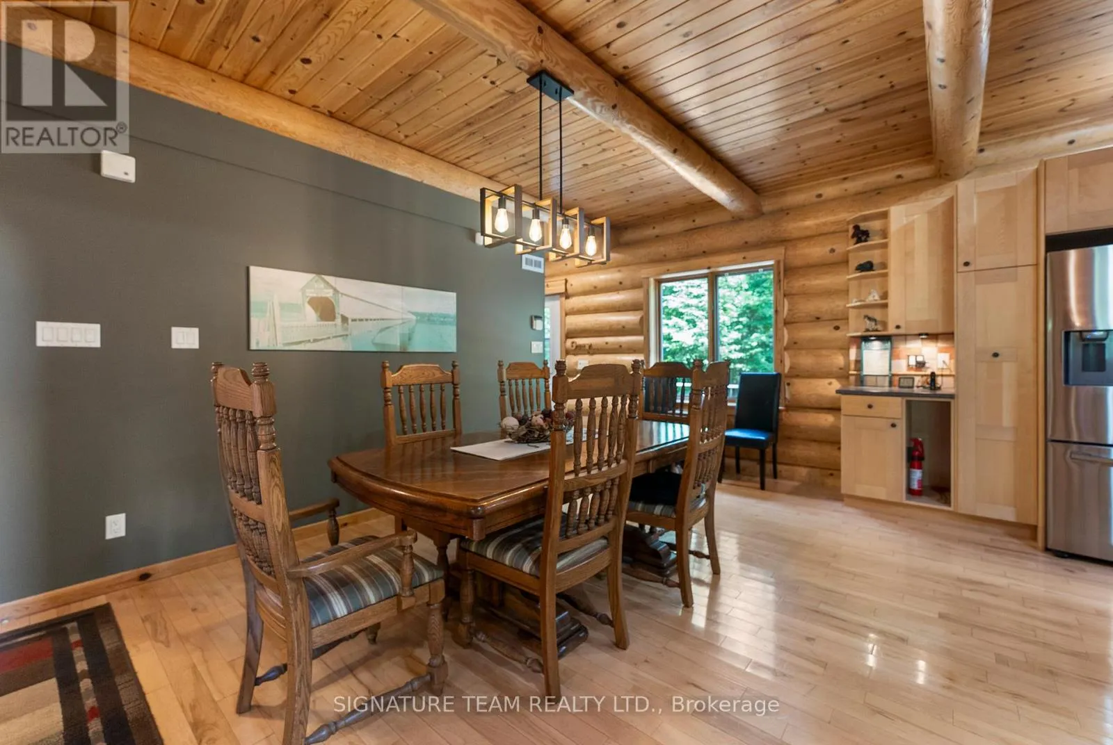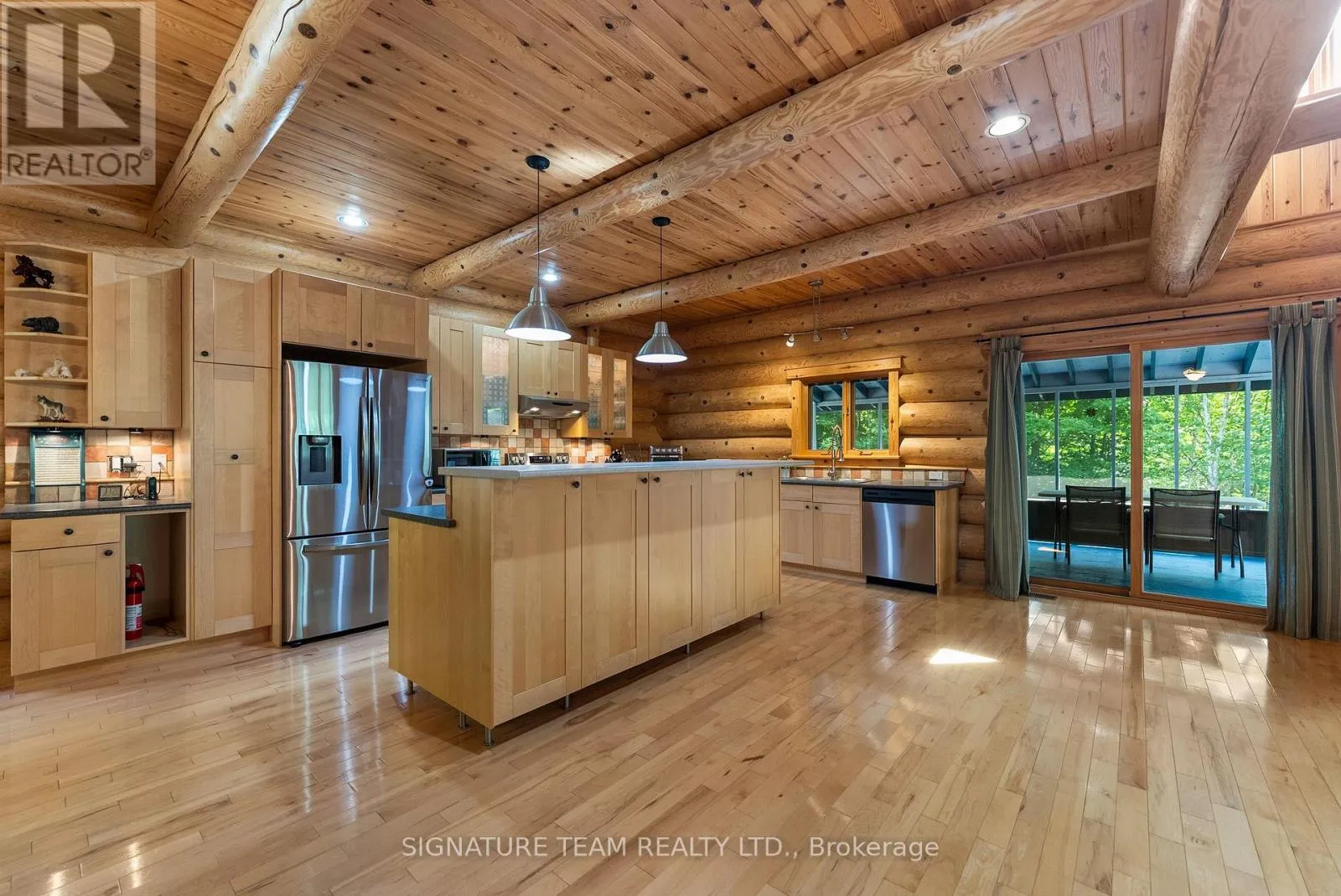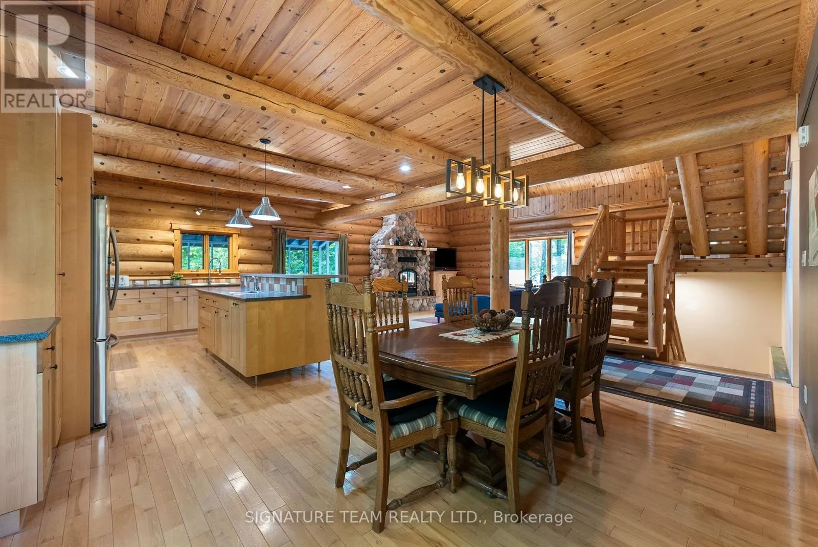 Set amidst 14.95 acres of mixed hardwood forest minutes from Pembroke, this extraordinary custom built log home offers a rare blend of artisanal craftsmanship and refined rural living. Designed with timeless attention to detail, this home is a true testament to natural beauty and enduring quality. The heart of the home is an expansive open-concept kitchen and dining area, thoughtfully