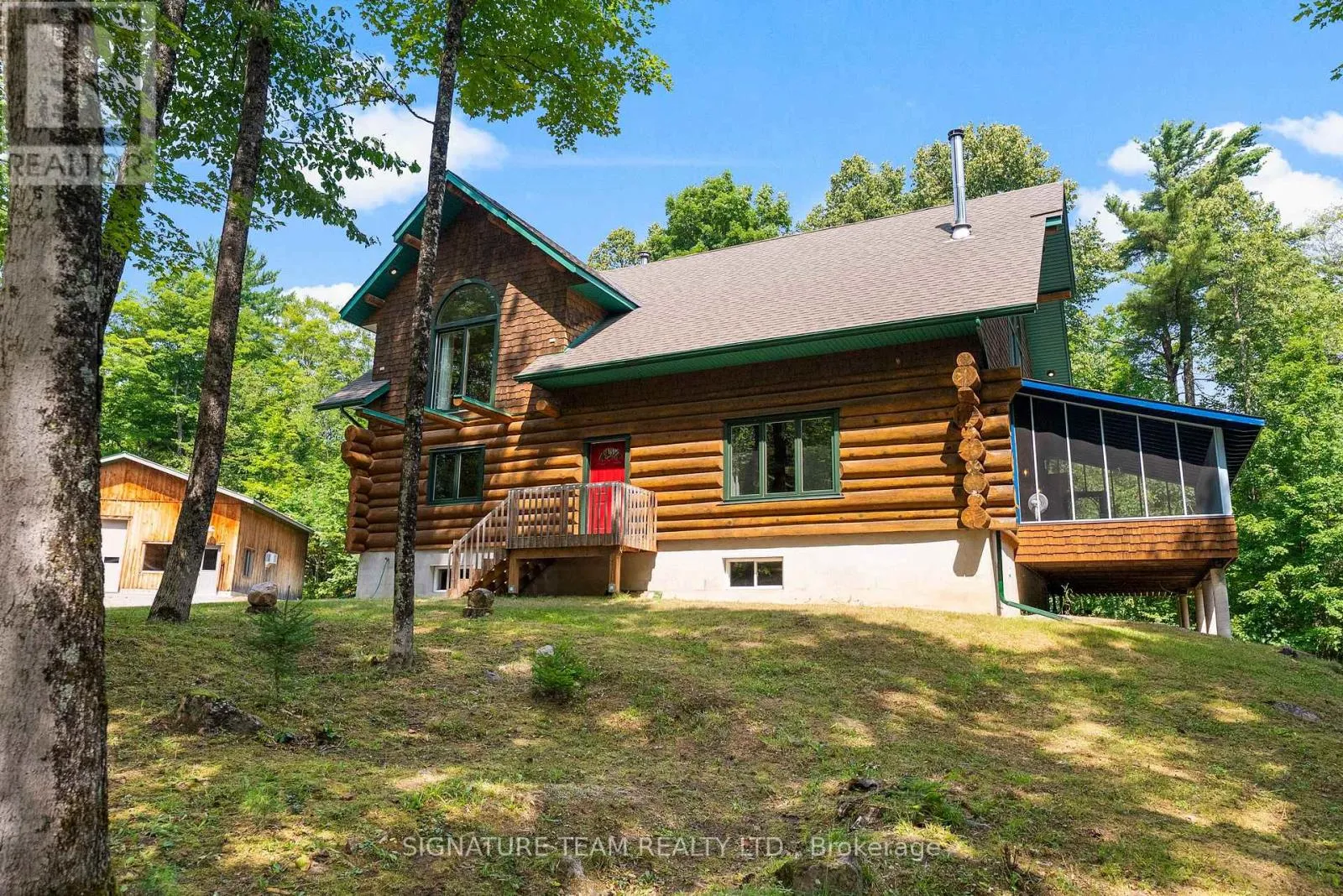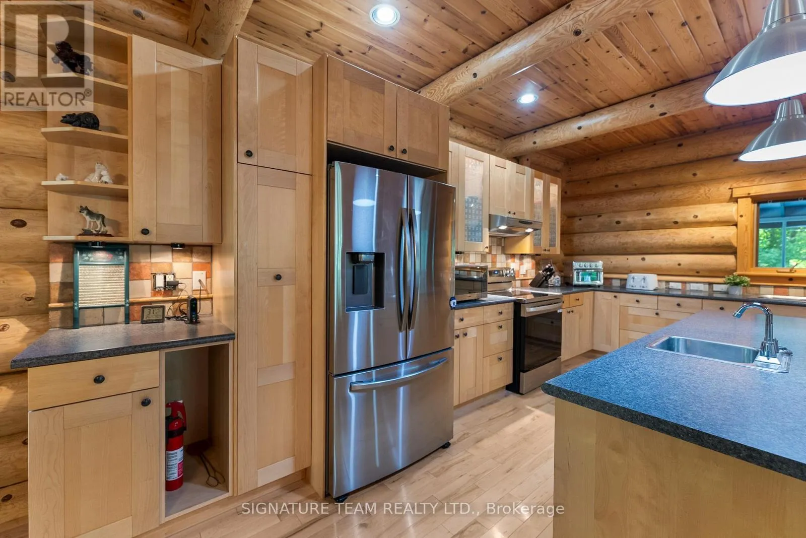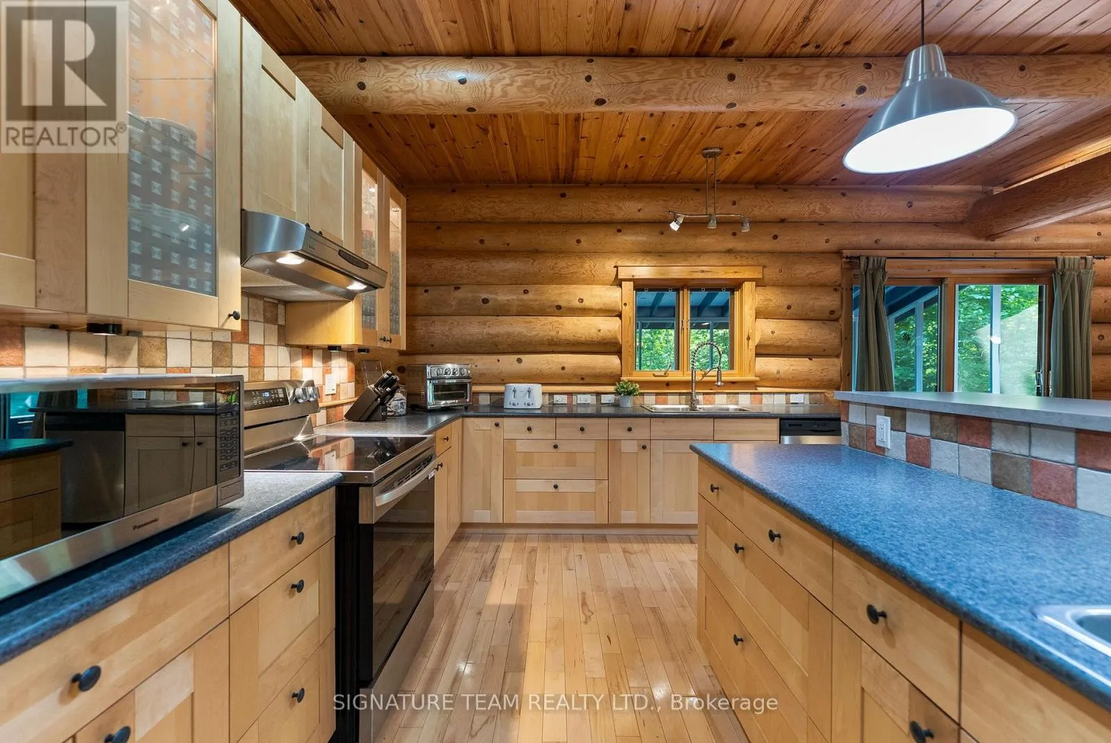 Set amidst 14.95 acres of mixed hardwood forest minutes from Pembroke, this extraordinary custom built log home offers a rare blend of artisanal craftsmanship and refined rural living. Designed with timeless attention to detail, this home is a true testament to natural beauty and enduring quality. The heart of the home is an expansive open-concept kitchen and dining area, thoughtfully