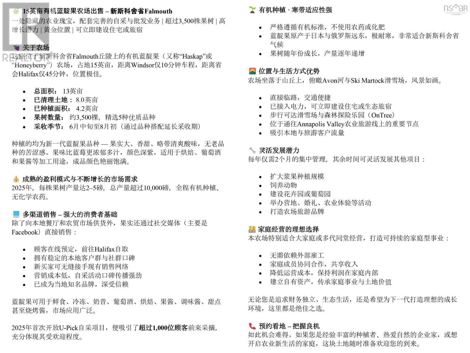 This 14.5-acre organic honeyberry/haskap farm in Falmouth, Nova Scotia, offers a turnkey U-Pick and wholesale operation. Located just 10 minutes from Windsor and 45 minutes from Halifax, it features 4.2 acres with approximately 3,500 premium haskap bushes. The farm cultivates five next-generation, large, sweet, and tangy haskap varieties, ensuring an extended harvest from mid-June to early August. Sales channels include