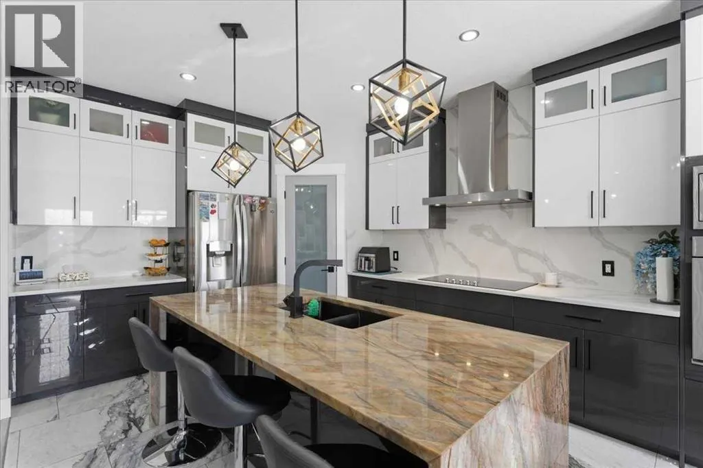 while the south-facing backyard draws in sunlight throughout the day. An open-concept main level establishes a natural flow for both daily routines and entertaining, grounded by updated laminate flooring and elevated by designer lighting. Gather comfortably in the inviting living room where a gas fireplace with full-height stone and built-in shelving introduces warmth and practical storage. Culinary creativity unfolds in the stunningly updated kitchen featuring granite countertops, stainless steel appliances, a waterfall-edge island for casual seating, full-height two-toned cabinetry and a pantry that keeps everything organized. Seamless access from the dining area to the rear deck encourages effortless indoor-outdoor living, ideal for barbeques and relaxed evenings. The flexibility carries through with a main floor den that adapts easily to a home office or additional family space, complete with built-ins to keep clutter neatly tucked away, while a stylish 3-piece bathroom with an oversized shower delivers added convenience. Upstairs, French doors reveal a vaulted bonus room that functions equally well as a media area, playroom or potential 4th bedroom. Retreat at the end of the day to the primary sanctuary boasting a walk-in closet and a modern ensuite for ultimate privacy. Two additional spacious and bright bedrooms are complemented by a sleek main bathroom, keeping busy households running smoothly. Downstairs, the self-contained illegal suite expands the home’s versatility with 2 bedrooms, a full kitchen, a spacious living area and its own laundry, creating separation and for extended family or independent living. The outdoor areas are equally well planned with an expansive rear deck that sets the stage for gatherings, while the low-maintenance yard provides space for kids and pets without added upkeep. A double attached garage brings everyday practicality. Located within walking distance to Saddle Ridge Plaza, nearby parks, schools, transit and scenic pathways around the wetland, this home also maintains convenient access to the Genesis Centre for recreation and community programming. Comfort, versatility and convenience come together in this thoughtfully updated home. (id:62650)
