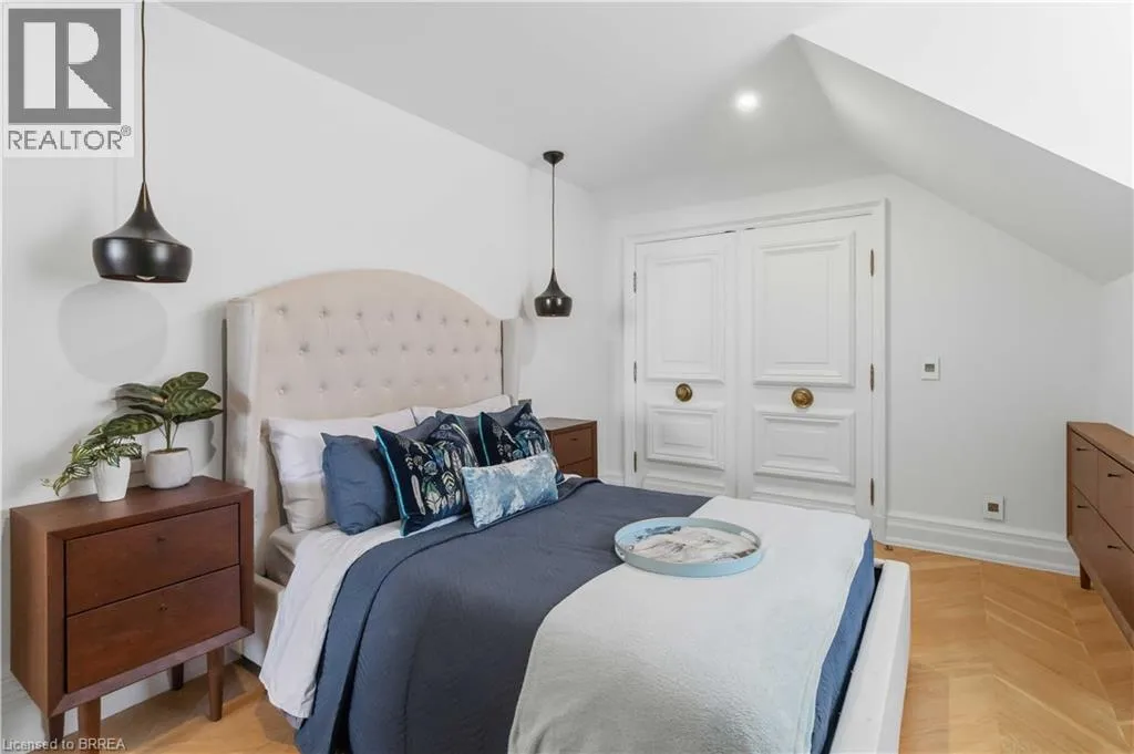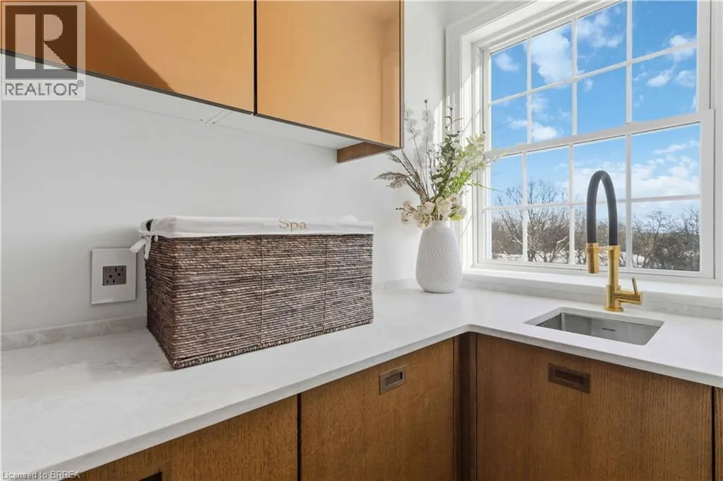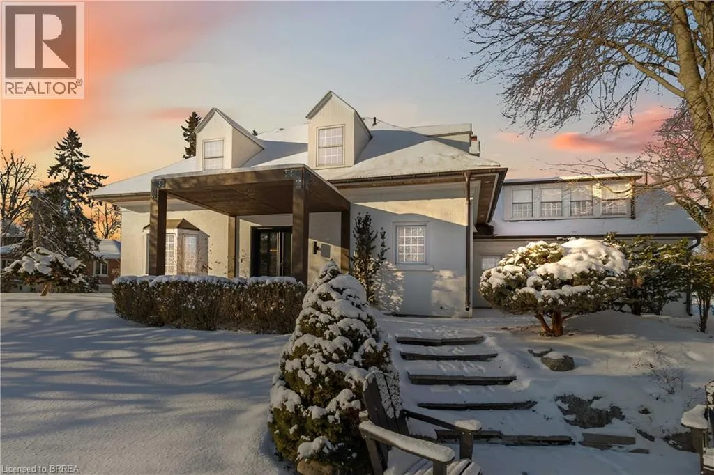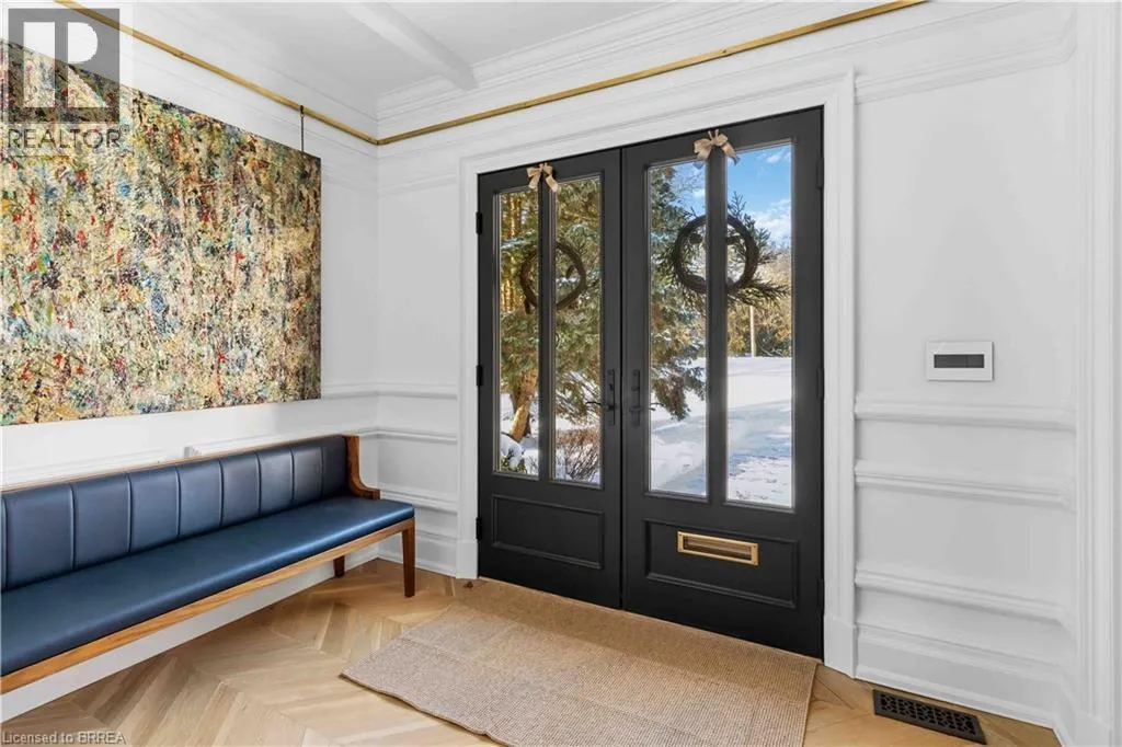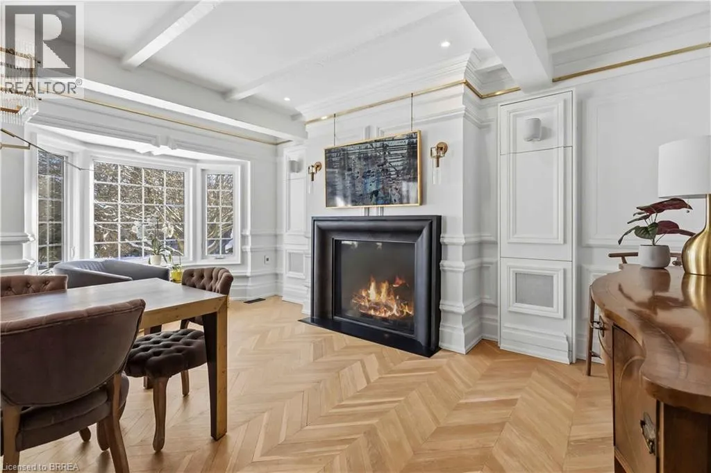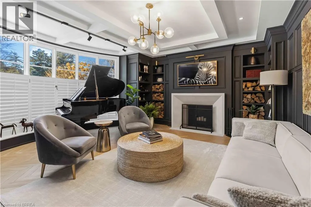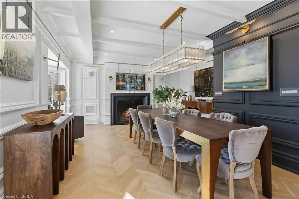 This exceptional two-storey stone & brick residence is a rare designer-owned masterpiece on a mature estate lot blending classic architecture with bold luxury. Dark doors lead to an awe-inspiring hallway with raised paneling, hand-carved exposed beams, & a striking black accent wall. The living room’s built-in cabinetry frames a real wood fireplace perfect for intimate gatherings, fireside evenings, or musical