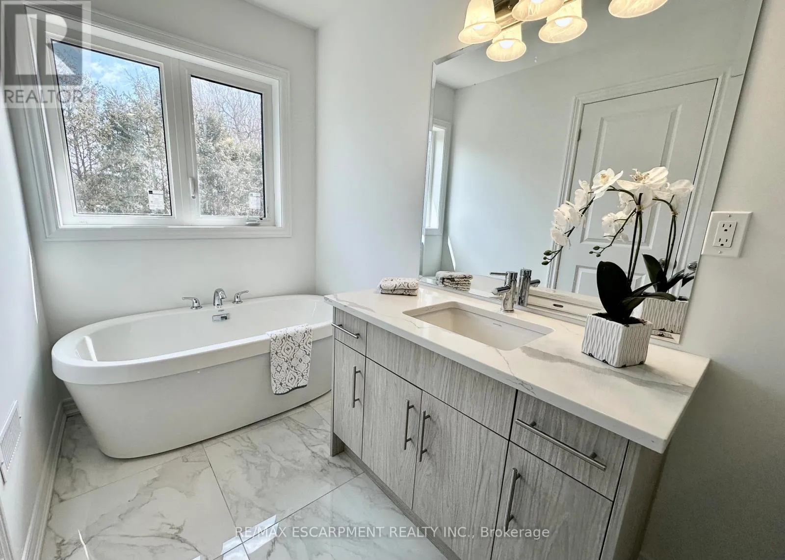 Welcome to this beautifully finished brand-new freehold end-unit townhome located in the highly desirable West Hamilton Mountain community. Offering just under 1,500 sq. ft. of thoughtfully designed living space, this modern home combines style, comfort, and functionality with the added benefit of no condo or road maintenance fees!The main level features 9-foot ceilings, 8-foot doors, and a bright open-concept layout,