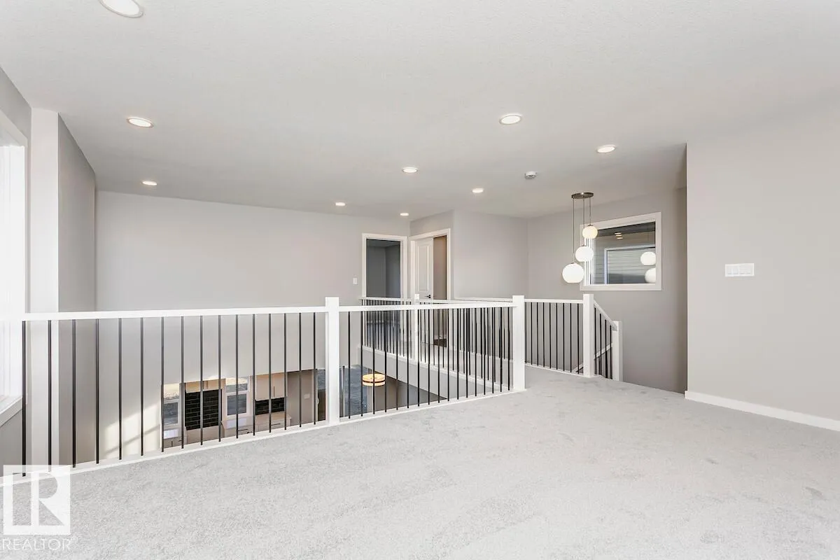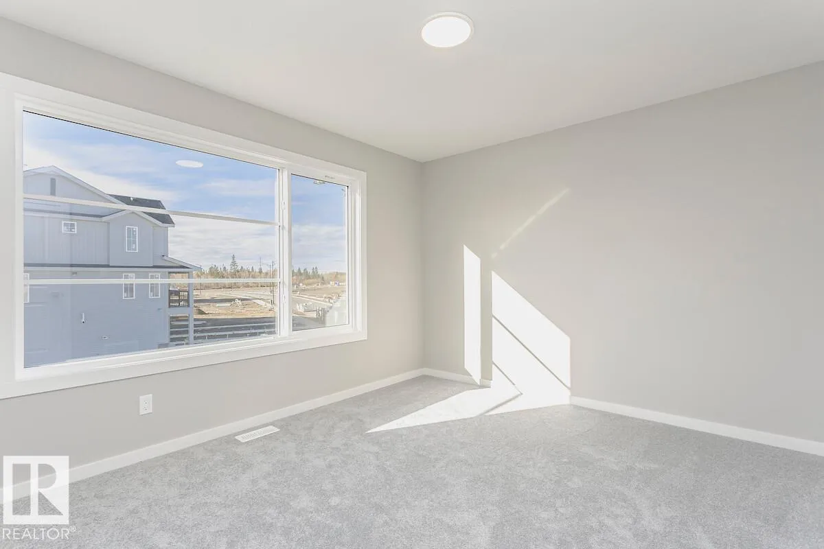 Backing onto a park with no rear neighbors for added privacy and views -Side entrance with direct basement access -9′ basement walls, two windows, and 3-piece bathroom rough-in for future development -Bright open-to-below design with spacious open-concept living areas -Electric Fire & Ice linear fireplace with timer and colour controls, flanked by windows -Large mudroom with walk-in closet, built-in bench,