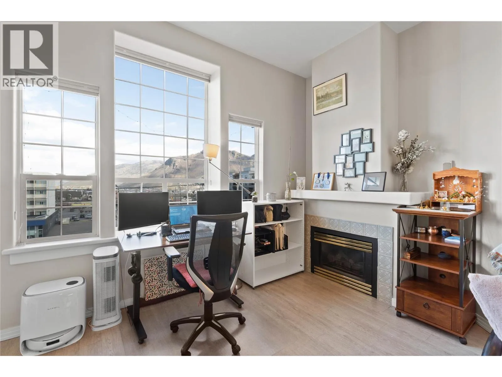 Terrific downtown location, featuring views of the downtown and Northern Valley from every room. This top-floor, corner unit, offers 10ft ceilings in the living/dining area and has a cozy gas fireplace (gas is included in the strata fee). The primary bedroom has a walk through closet and a 3 pc ensuite. The second bedroom also has a walk-through closet