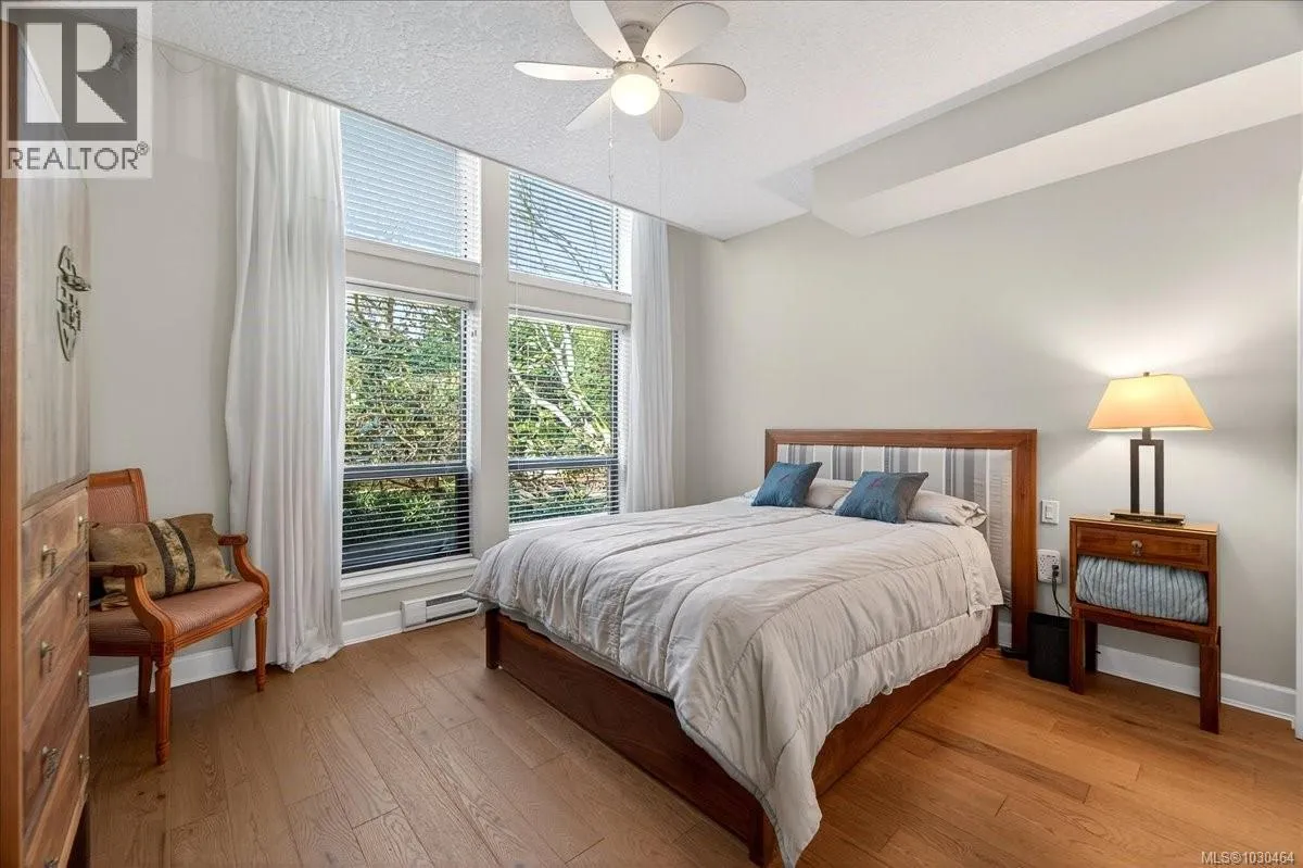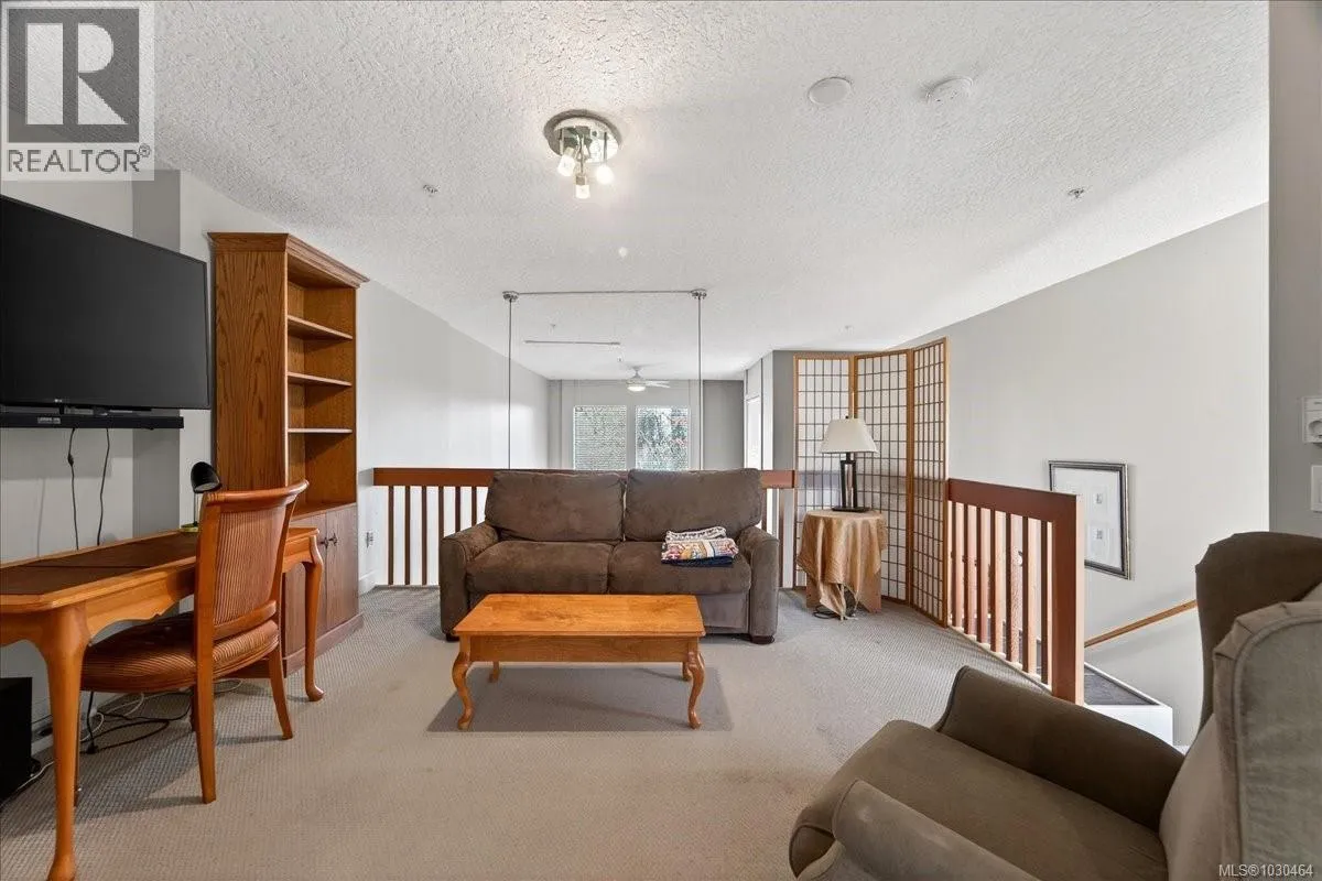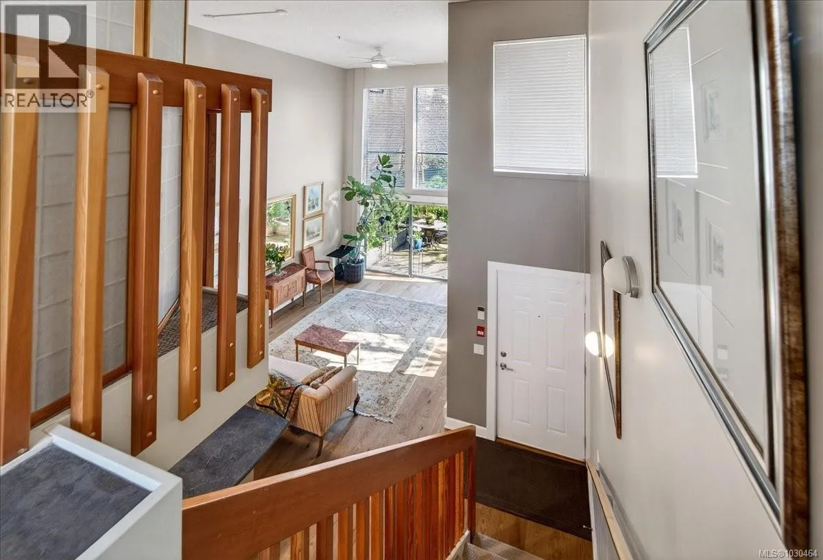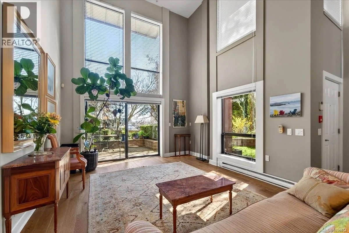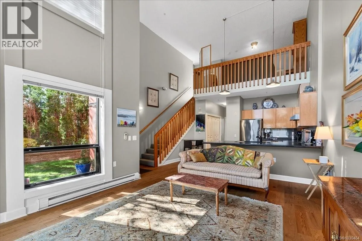 Uptown Shopping Centre. Built in 2005, this unique two-storey residence offers over 1,074 sq. ft. of thoughtfully designed living space with your own private entrance and patio. Soaring 17+ ft floor-to-ceiling windows flood the home with natural light. The open-concept living area features vaulted ceilings, rich wood floors, the functional kitchen is equipped with custom cabinetry, a pantry, quality appliances,