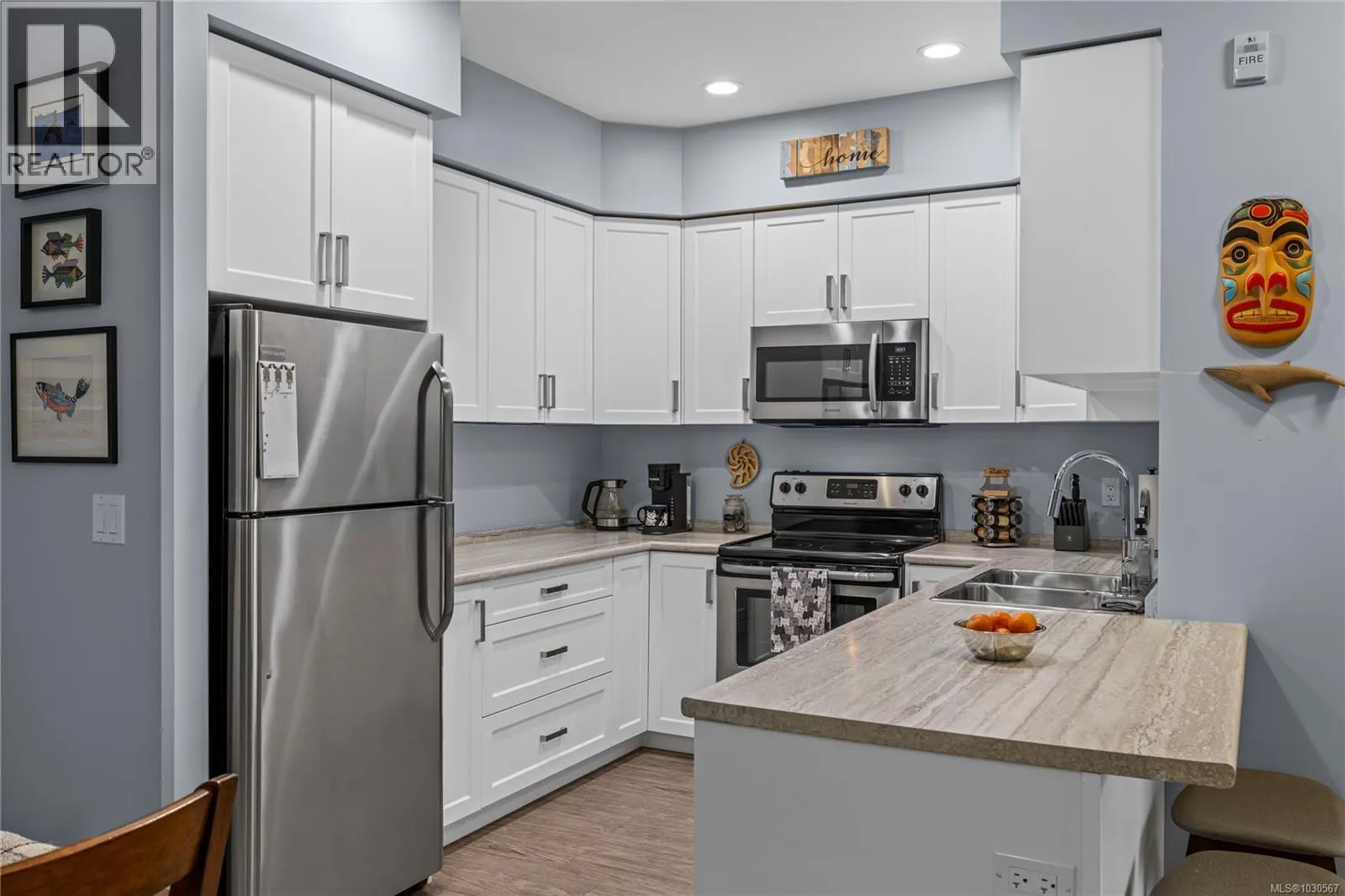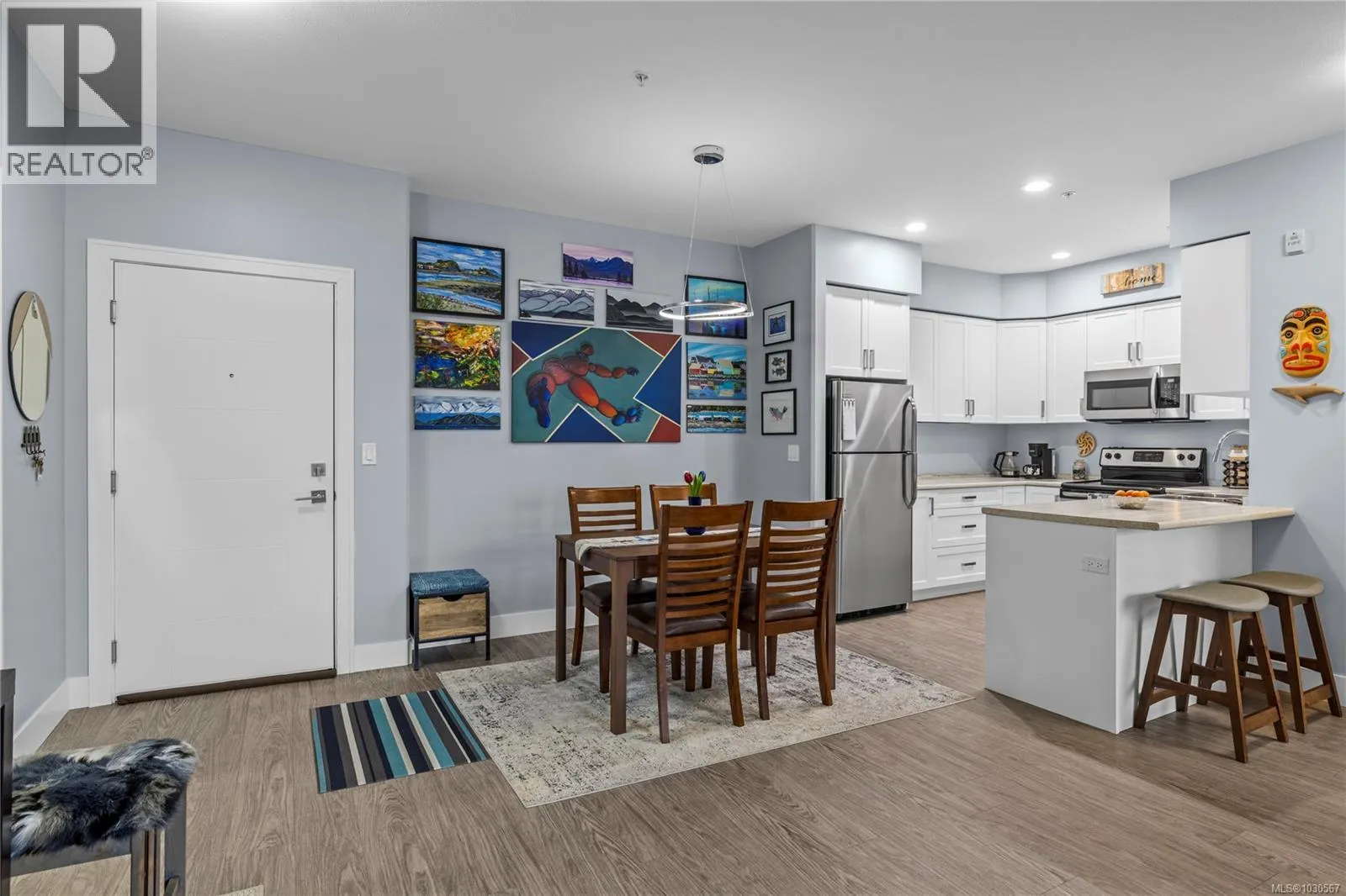 Welcome to this bright and well-designed two bedroom plus den condo in a desirable North Nanaimo location. The home features a functional open concept layout with 9’ ceilings and large windows that fill the space with natural light. The modern kitchen boasts white cabinetry, ample counter space, and stainless appliances, seamlessly connecting to the dining and living areas—perfect for everyday