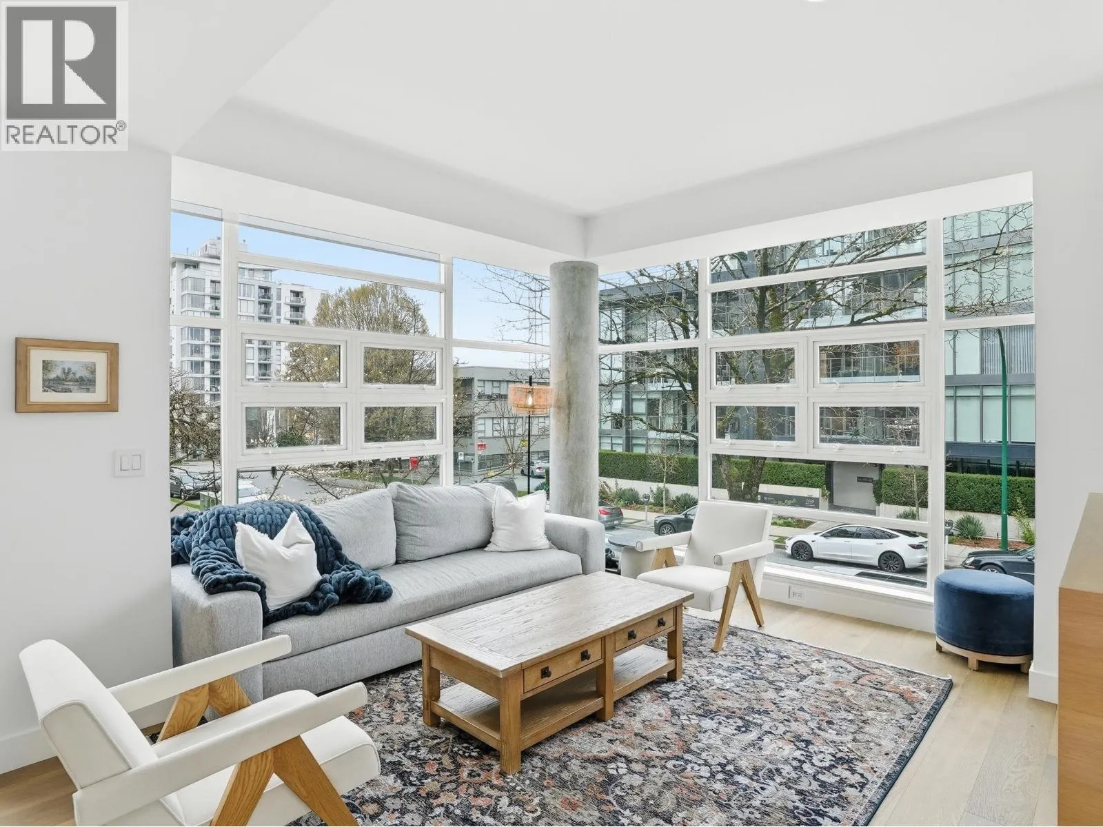 Beautifully reimagined concrete 1,794 sq/ft corner townhome at PINTURA offering exceptional light, privacy, and space. Featuring soaring ceilings and a brand-new high-end designer kitchen with coffee bar/shake station, opening to a sunny BBQ terrace. Upper level includes a luxurious primary suite with spa-like ensuite, spacious second bedroom, and full bathroom. Lower level offers a versatile third bedroom with a stunning