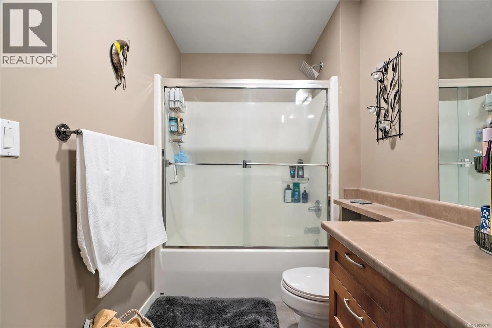 Welcome home…Don’t miss this bright, spacious south facing 1 bed 2 bath unit . Features include, maple shaker cabinets, quartz countertops, in suite laundry, covered deck, storage locker and secure underground parking and a heat pump. On the quiet side of the the building overlooking a forested walkway. Steps to Red Barn, pharmacy and Olympic View Golf Course. A short